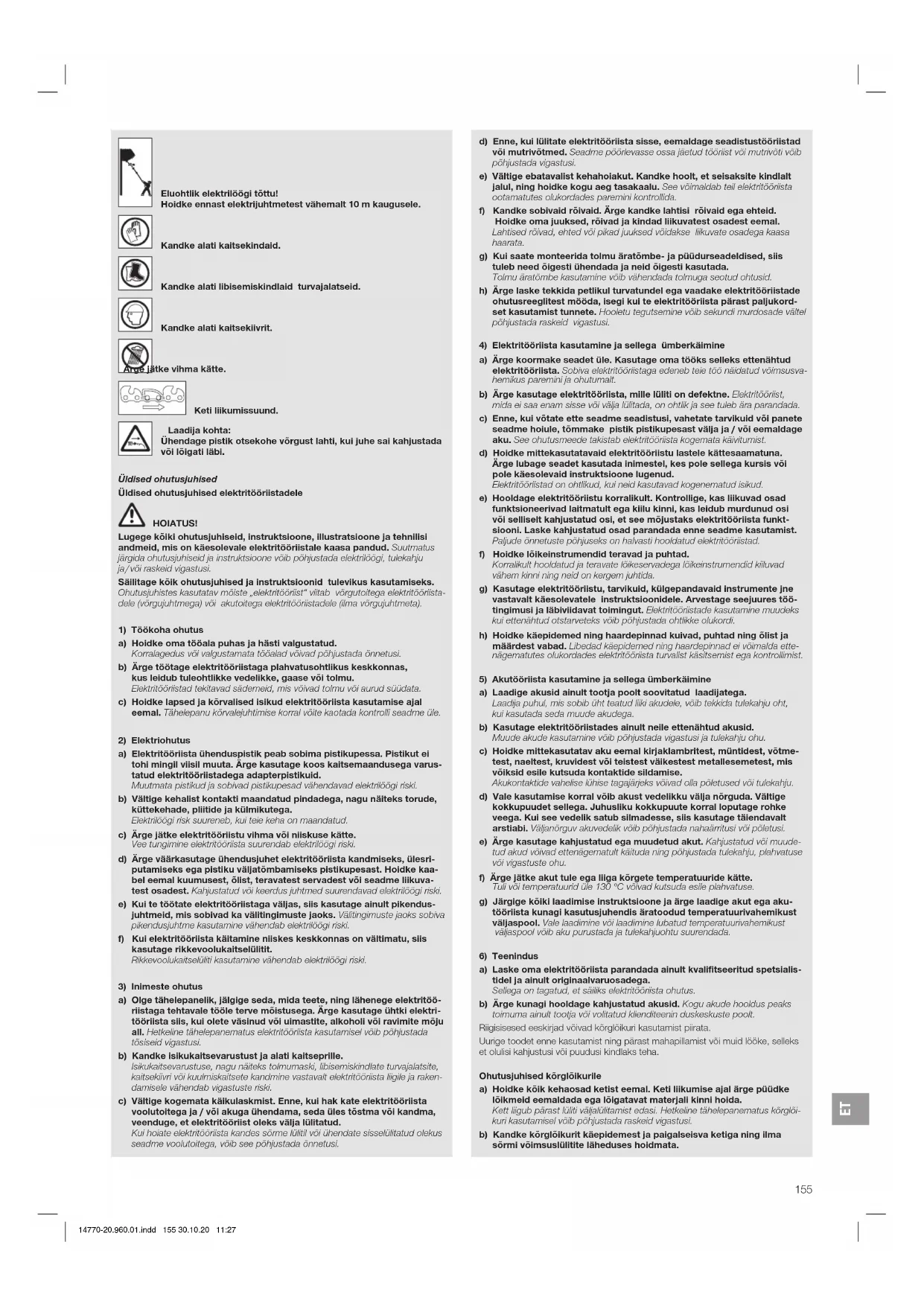 Keti liikumissuund. Laadija kohta: Ühendage pistik otsekohe võrgust lahti, kui juhe sai kahjustada või lõigati läbi. Üldised ohutusjuhised Üldised ohutusjuhised elektritööriistadele HOIATUS! Lugege kõiki ohutusjuhiseid, instruktsioone, illustratsioone ja tehnilisi andmeid, mis on käesolevale elektritööriistale kaasa pandud. Suutmatus järgida ohutusjuhiseid ja instruktsioone võib põhjustada elektrilöögi, tulekahju ja / või raskeid vigastusi. Säilitage kõik ohutusjuhised ja instruktsioonid tulevikus kasutamiseks. Ohutusjuhistes kasutatav mõiste „elektritööriist“ viitab võrgutoitega elektritööriista- dele (võrgujuhtmega) või akutoitega elektritööriistadele (ilma võrgujuhtmeta).