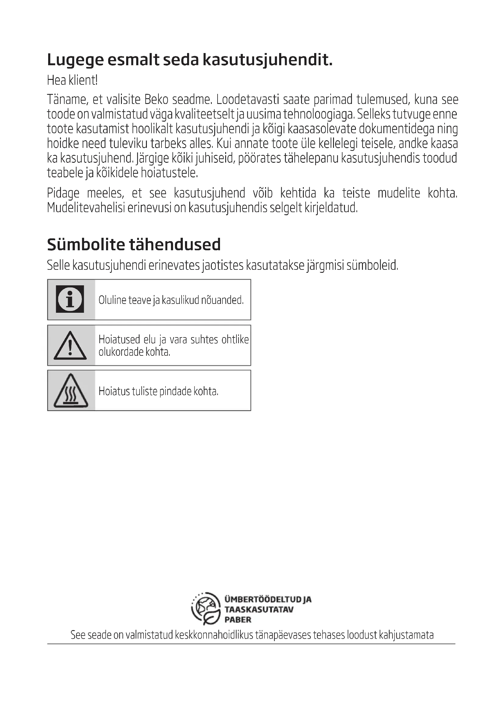 - Gabenkite gaminį įprastoje padėtyje. Neguldy- kite jo ant šono ar galo.Lugege esmalt seda kasutusjuhendit. Hea klient! Täname, et valisite Beko seadme. Loodetavasti saate parimad tulemused, kuna see toode on valmistatud väga kvaliteetselt ja uusima tehnoloogiaga. Selleks tutvuge enne toote kasutamist hoolikalt kasutusjuhendi ja kõigi kaasasolevate dokumentidega ning hoidke need tuleviku tarbeks alles. Kui annate toote üle kellelegi teisele, andke kaasa ka kasutusjuhend. Järgige kõiki juhiseid, pöörates tähelepanu kasutusjuhendis toodud teabele ja kõikidele hoiatustele. Pidage meeles, et see kasutusjuhend võib kehtida ka teiste mudelite kohta. Mudelitevahelisi erinevusi on kasutusjuhendis selgelt kirjeldatud. Sümbolite tähendused Selle kasutusjuhendi erinevates jaotistes kasutatakse järgmisi sümboleid.