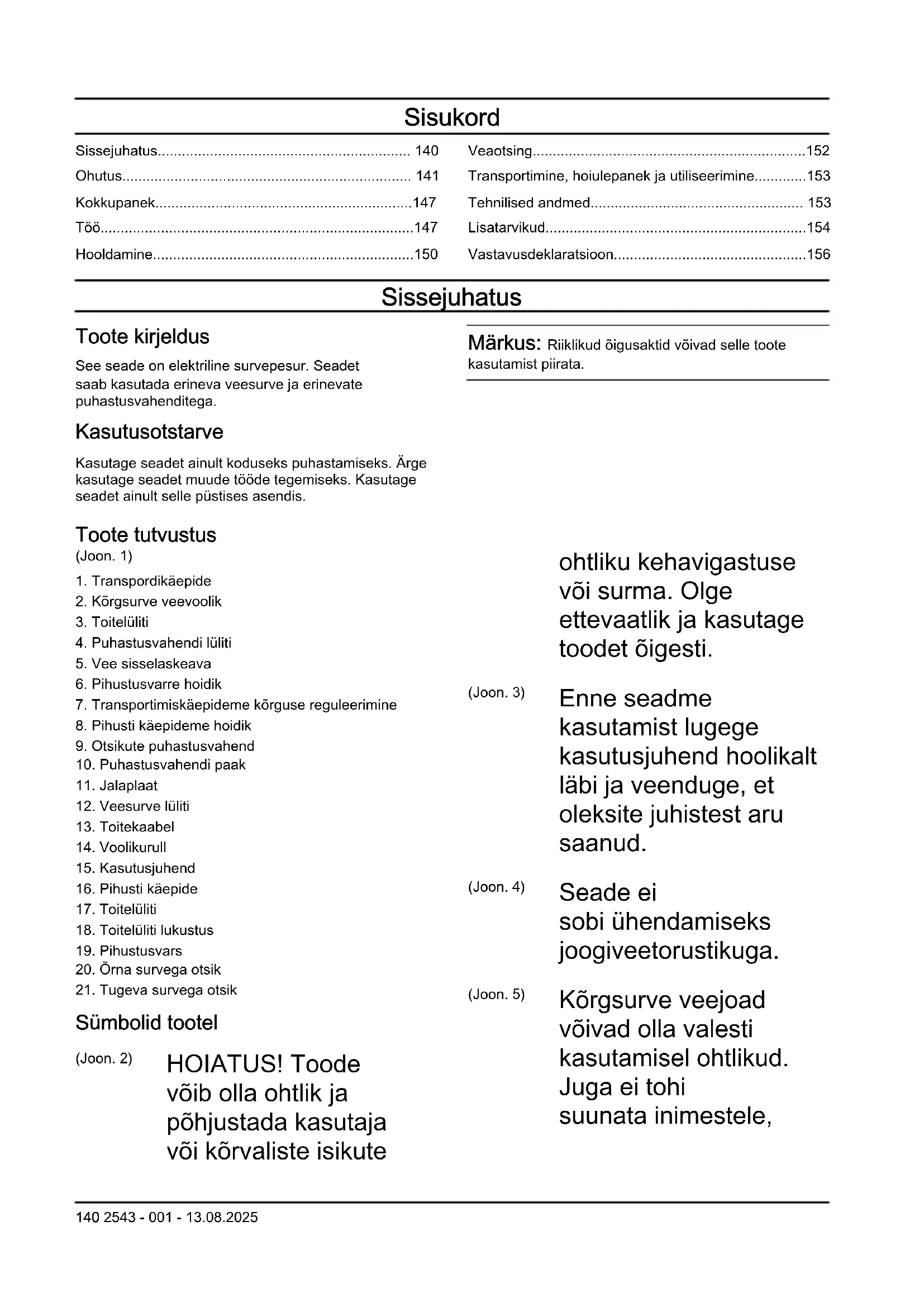 Sümbolid tootel (Joon. 2) HOIATUS! Toode võib olla ohtlik ja põhjustada kasutaja või kõrvaliste isikute ohtliku kehavigastuse või surma. Olge ettevaatlik ja kasutage toodet õigesti. (Joon. 3) Enne seadme kasutamist lugege kasutusjuhend hoolikalt läbi ja veenduge, et oleksite juhistest aru saanud. (Joon. 4) Seade ei sobi ühendamiseks joogiveetorustikuga. (Joon. 5) Kõrgsurve veejoad võivad olla valesti kasutamisel ohtlikud. Juga ei tohi suunata inimestele, 140 2543 - 001 - 13.08.2025elektriseadmetele ega seadmele. (Joon. 6) Keskkonnamärgis. Toode või toote pakend ei kuulu olmejäätmete hulka. Toimetage see elektri- ja elektroonikajäätmete heakskiidetud vastuvõtupunkti. (Joon. 7) II klassi tööriist. (Joon. 8) Müraemissioonile viitav keskkonnasilt vastavalt ELi ja UK direktiividele ja määrustele ja Uus Lõuna- Walesi õigusaktile „Protection of the Environment Operations (Noise Control) Regulations 2017“. Toote garanteeritud helivõimsuse taseme andmed leiate jaotisest Tehnilised andmed lk