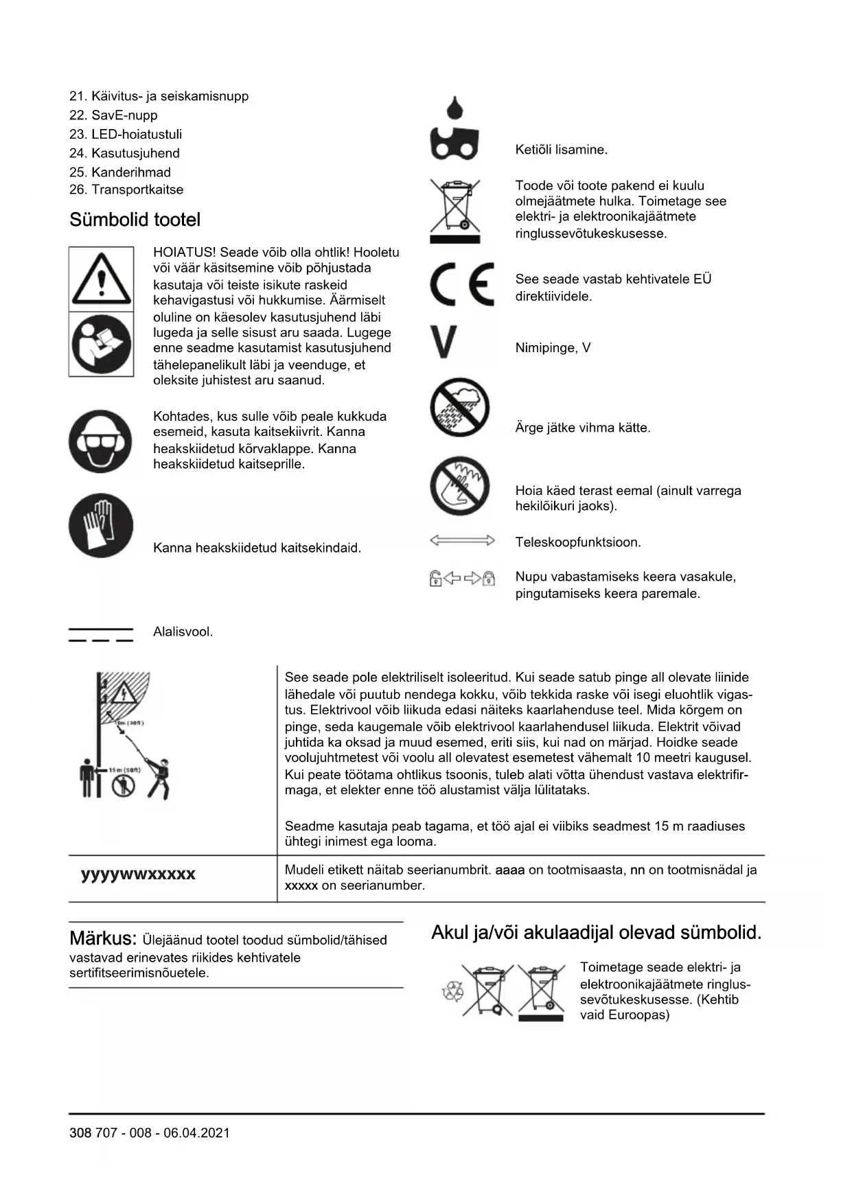 Sümbolid tootel HOIATUS! Seade võib olla ohtlik! Hooletu või väär käsitsemine võib põhjustada kasutaja või teiste isikute raskeid kehavigastusi või hukkumise. Äärmiselt oluline on käesolev kasutusjuhend läbi lugeda ja selle sisust aru saada. Lugege enne seadme kasutamist kasutusjuhend tähelepanelikult läbi ja veenduge, et oleksite juhistest aru saanud. Kohtades, kus sulle võib peale kukkuda esemeid, kasuta kaitsekiivrit. Kanna heakskiidetud kõrvaklappe. Kanna heakskiidetud kaitseprille. Kanna heakskiidetud kaitsekindaid. Alalisvool. Ketiõli lisamine. Toode või toote pakend ei kuulu olmejäätmete hulka. Toimetage see elektri- ja elektroonikajäätmete ringlussevõtukeskusesse. See seade vastab kehtivatele EÜ direktiividele. Nimipinge, V Ärge jätke vihma kätte. Hoia käed terast eemal (ainult varrega hekilõikuri jaoks). Teleskoopfunktsioon. Nupu vabastamiseks keera vasakule, pingutamiseks keera paremale. See seade pole elektriliselt isoleeritud. Kui seade satub pinge all olevate liinide lähedale või puutub nendega kokku, võib tekkida raske või isegi eluohtlik vigas- tus. Elektrivool võib liikuda edasi näiteks kaarlahenduse teel. Mida kõrgem on pinge, seda kaugemale võib elektrivool kaarlahendusel liikuda. Elektrit võivad juhtida ka oksad ja muud esemed, eriti siis, kui nad on märjad. Hoidke seade voolujuhtmetest või voolu all olevatest esemetest vähemalt 10 meetri kaugusel. Kui peate töötama ohtlikus tsoonis, tuleb alati võtta ühendust vastava elektrifir- maga, et elekter enne töö alustamist välja lülitataks. Seadme kasutaja peab tagama, et töö ajal ei viibiks seadmest 15 m raadiuses ühtegi inimest ega looma. yyyywwxxxxx Mudeli etikett näitab seerianumbrit. aaaa on tootmisaasta, nn on tootmisnädal ja xxxxx on seerianumber. Märkus: Ülejäänud tootel toodud sümbolid/tähised vastavad erinevates riikides kehtivatele sertifitseerimisnõuetele. Akul ja/või akulaadijal olevad sümbolid. Toimetage seade elektri- ja elektroonikajäätmete ringlus- sevõtukeskusesse. (Kehtib vaid Euroopas) 308 707 - 008 - 06.04.2021Tõrkekindel trafo. Kasutage ja hoiustage akulaadijat ainult siseruumides. Topeltisolatsioon. Tootevastutus Tootevastutusseaduste alusel ei vastuta me tootest tingitud kahjustuste eest, kui: