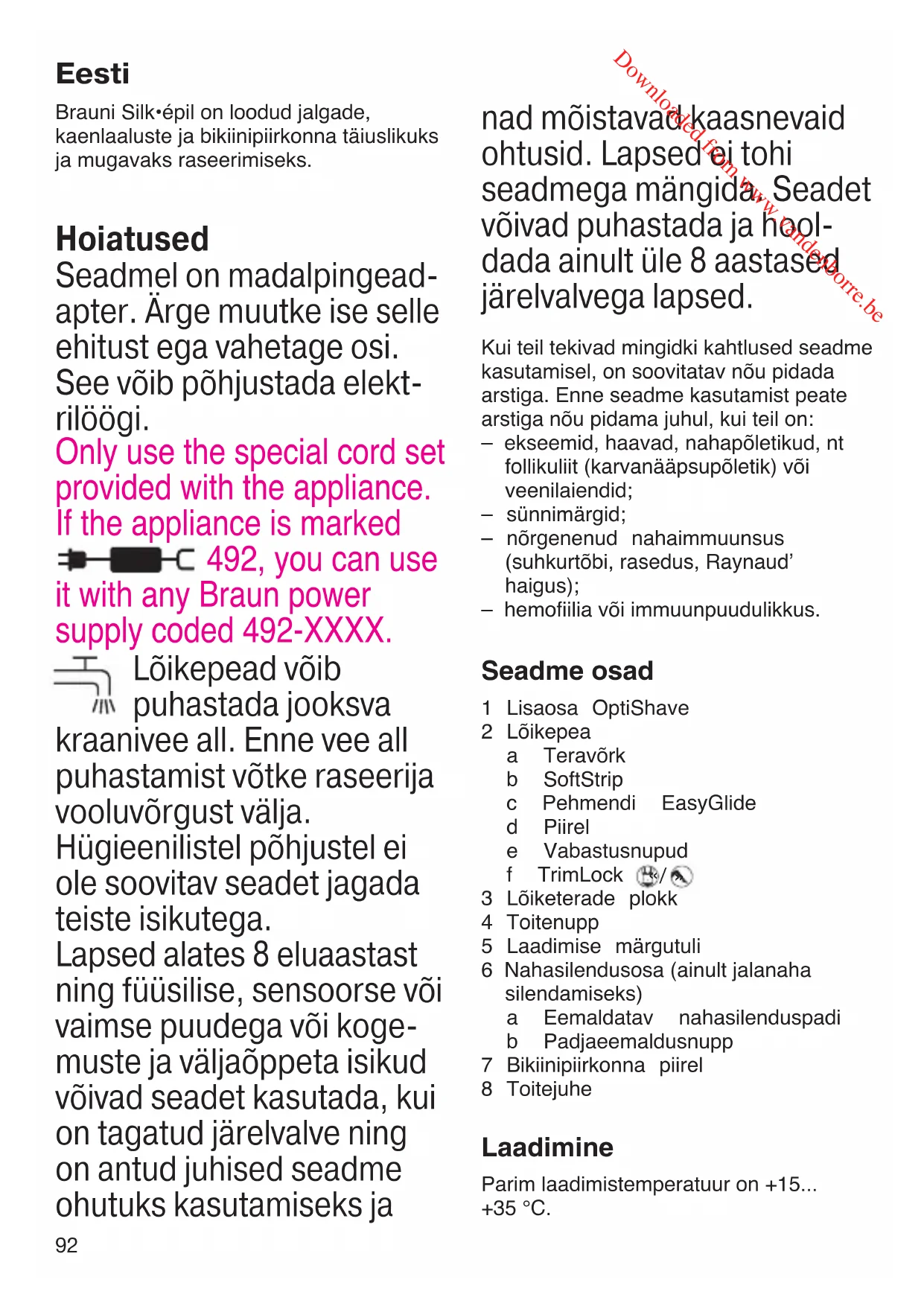 - Varuosi (teravõrk, lõiketerade plokk, nahasilenduspadi) saate osta müüjalt või Brauni volitatud hooldustöökojast. Akude hooldus Maksimaalse mahutavuse ning pika kasutusea tagamiseks tuleb akud umbes iga kuue kuu tagant raseerimise käigus täielikult tühjendada. Seejärel laadige akud uuesti täis. Ärge hoidke seadet pikemat aega temperatuuril üle 50 °C. 91094868_LS_5560_S6-104.indd 9491094868_LS_5560_S6-104.indd 94 27.09.16 13:3627.09.16 13:36 CSS APPROVED Effective Date 4Oct2016 GMT - Printed 04Jan2017 Page 93 of 103 Downloaded from www.vandenborre.be95 Sisaldab akut. Antud toodet ei tohi visata segaolmejäätmete hulka. Kõik kasutuselt kõrvaldatud elektrija elektroonikaseadmed ning patareid ja akud tuleb koguda lahus ja viia selleks ettenähtud lähimasse tasuta vastuvõtu punkti. Kasutuselt kõrvaldatud elektri- ja elektroonikaseadmete ning patareide ja akude lahuskogumine ning materjalide ringlussevõtt aitavad vähendada keskkonnale ja tervisele kohalduvaid riske. Lisainformatsiooni kasutuselt kõrvaldatud seadmete lahuskogumise kohta saad kohalikust omavalitsusest, jäätmekäitlusettevõtetelt või seadmeid müüvatelt kauplustelt. Toodud andmed võivad muutuda ilma etteteatamiseta. Valmistaja: Braun GmbH. Valmistatud Hiinas. Esindaja: Procter & Gamble Services Eesti OÜ, Paldiski mnt 27/29, 10612 Tallinn. Garantii Seadmel on kaheaastane garantii, mis hakkab kehtima seadme müügipäevast (müügitempel talongil). Garantiiaja jooksul kõrvaldatakse tasuta kõik seadmel ilmnenud vead, mis on tingitud ebakvaliteetsest materjalist või valmistamisest ja koostamisest, vahetatakse välja vigased detailid või kogu seade, kui praak on tekkinud tootja süü tõttu. Garantiiparandust ei tehta juhul, kui rikke on põhjustanud seadme vale kasutamine (juhendi järgimata jätmine), ebaõige voolupinge või kui seade on purunenud. Samuti ei kehti garantii seadme normaalse kulumise ning vigade korral, mis ei halvenda seadme väärtust ega kasutust. Garantii ei kehti, kui seadet ei ole parandatud Brauni ametlikus hooldus- ja parandustöökojas ega Brauni varuosadega. Garantiiparanduse alla ei käi seadme puhastamine. Garantii ei kehti pardlite ja kosmeetiliste pardlite võrgukasseti ja lõiketera kohta ning elektriliste hambaharjade harjapeade kohta. Garantii jõustub ainult siis, kui ostukuupäev garantii- ja registreerimistalongil on kinnitatud kaupluse templi ja müüja allkirjaga. Garantii ei anna seadme kasutajale ja teistele isikutele õigust nõuda väärast kasutamisest johtuvate materiaalsete ja isiklike kahjude korvamist. Garantii kehtib riikides, kus käesolevat seadet müüakse kas Brauni tütarfirma või selle ametliku esindaja kaudu ja kus ei ole kehtestatud impordipiiranguid ega muid seadusi, mis takistavad seadmele lubatud garantiiteenindust. Garantiiparandusse viidav seade peab olema komplektne. Klient toimetab seadme parandustöökotta omal kulul. Seadme garantiiaeg pikeneb garantiiparanduses oldud aja võrra. Seadme üksikute ümbervahetatud osade või kogu ümbervahetatud seadme garantii lõpeb kogu seadme garantiiaja lõppemisega (2 aastat). Simson OÜ Türi 5, 11313 Tallinn, Tel: 645 3347 Aleksandri 6, 51004 Tartu, Tel: 734 3494 Laine 4, 80016 Pärnu, Tel: 442 7231 Esindaja: AbeStock AS, Laki 25, 12915 Tallinn, www.abestock.ee +372 6505 555 91094868_LS_5560_S6-104.indd 9591094868_LS_5560_S6-104.indd 95 27.09.16 13:3627.09.16 13:36 CSS APPROVED Effective Date 4Oct2016 GMT - Printed 04Jan2017 Page 94 of 103 Downloaded from www.vandenborre.be96 Руководство по эксплуатации Наши изделия разработаны в соответ-ствии с самыми высокими стандартами качества, функциональности и дизайна. Бритва Braun Silk·épil обеспечивает чис-тое и удобное бритье кожи на ногах, подмышками и в области бикини. Надеемся, что Вам понравится Ваша новая женская бритва Braun. Предупреждение Данное изделие комплек- туется специальным шну- ром с вмонтированным безопасным блоком пита- ния сверхнизкого напряже- ния. Запрещается вносить в него какие-либо измене- ния во избежание пораже- ния электрическим током. Использовать следует только специальный ком- плект проводов, поставля- емый вместе с изделием. Если на устройстве име- ется маркировка 492, то его можно исполь- зовать с любым шнуром сетевого адаптера Braun, маркированном 492-ХХХХ. Бреющую головку можно чистить под струей водопроводной воды. Отсоедините бритву от розетки перед тем, как чистить бреющую головку