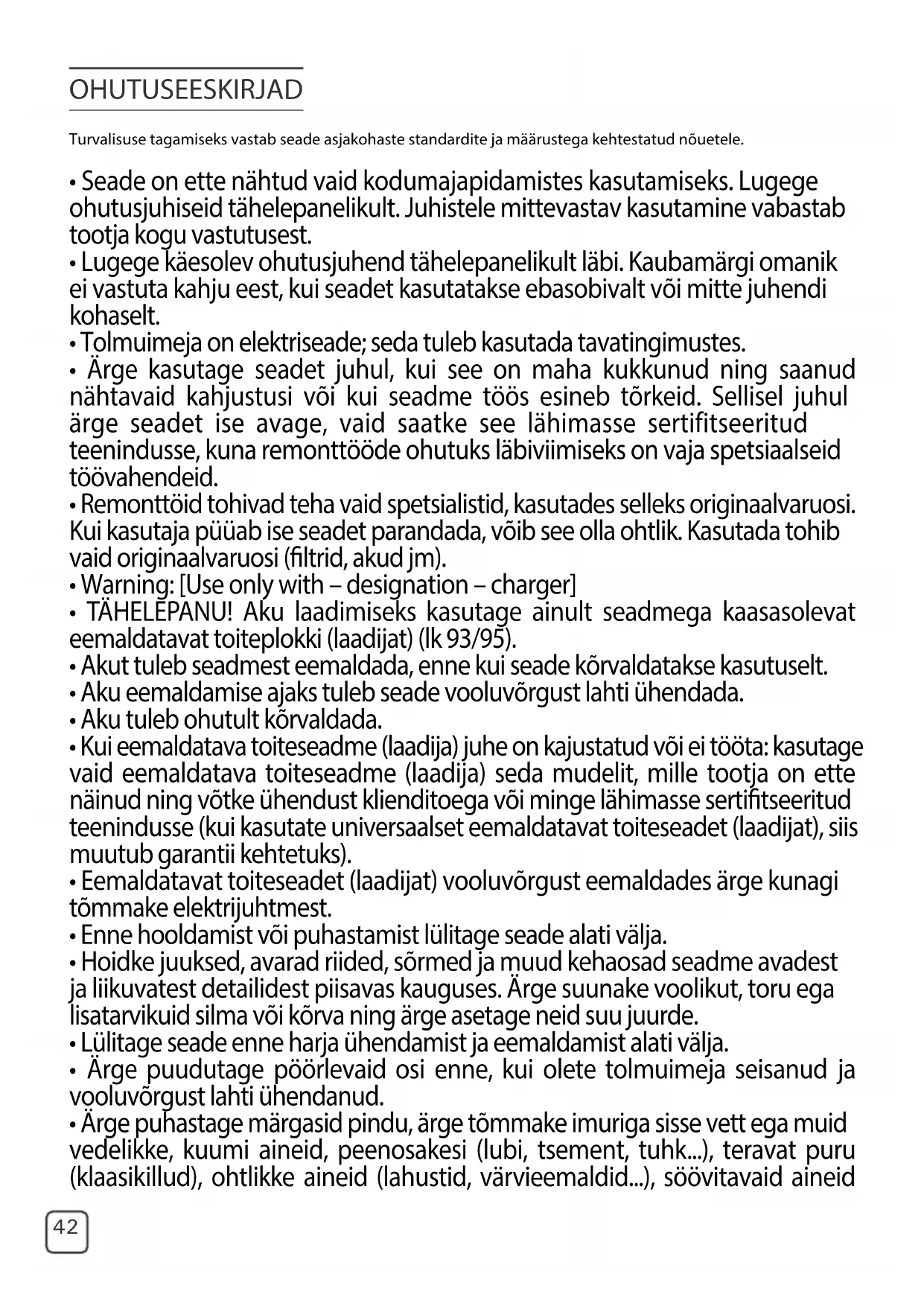 Laadija on soe. See on täiesti normaalne. Tolmuimeja võib jätta pikaks ajaks laadija külge, ilma et sellega kaasneks mingeid riske. Seade on laadijaga ühendatud, kuid ei lae. Laadija on seadmega valesti ühendatud või defektne. Veenduge, et laadija on korralikult ühendatud või pöörduge laadija väljavahetamiseks sertitseeritud teenindusse. Seade seiskub keset töötamist a laadija tuled vilguvad väga kiiresti. Seade võib olla üle kuumenenud. Lülitage seade välja ja laske sellel vähemalt tund aega jahtuda. Seade seiskus pärast laadimise tule vilkumist. Seade on laadimata. Laadige tolmuimeja. Elektrihari ei tööta nii hästi kui varem või teeb imelikku häält. Pöörlev hari ei tööta või voolik on tõkestatud. Peatage tolmuimeja ning puhastage need. Hari on kulunud. Harja väljavahetamiseks pöörduge sertitseeritud teeninduskeskusse. Tihend on kulunud. Tihendi väljavahetamiseks pöörduge sertitseeritud teeninduskeskusse. Seade lülitub tolmu imemise ajal välja. Soojusohutus toimis. Lülitage tolmuimeja välja. Veenduge, et miski ei takista harja liikumist, aga kui see siiski nii on, eemaldage takistav ese ja puhastage elektrihari, seejärel pange tolmuimeja uuesti tööle.45 Juhul kui tolmuimeja ei ime enam sama tõhusalt kui enne, tekitab ebatavalist müra või vilistab. Toru või voolik on kohati ummistunud. Avage need. Tolmumahuti on täis. Tühjendage ja puhastage see. Tolmuanum on valesti paigaldatud. Pange see õigesti sisse. Imiotsik on määrdunud. Ühendage elektrihari lahti a puhastage see. Mootori kaitsmise vahtlter on täis. Puhastage see. Kui tolmuimeja laadima panete, vilguvad laadija tuled aktiivselt. Laadija on vale või kahjustatud. Laadija väljavahetamiseks pöörduge sertitseeritud teeninduskeskusse. Hoidke kasutusjuhend alles. ET46 SAUGUMO INSTRUKCIJOS Jūsų saugumui užtikrinti šis prietaisas atitinka taikomus standartus ir teisės aktus.