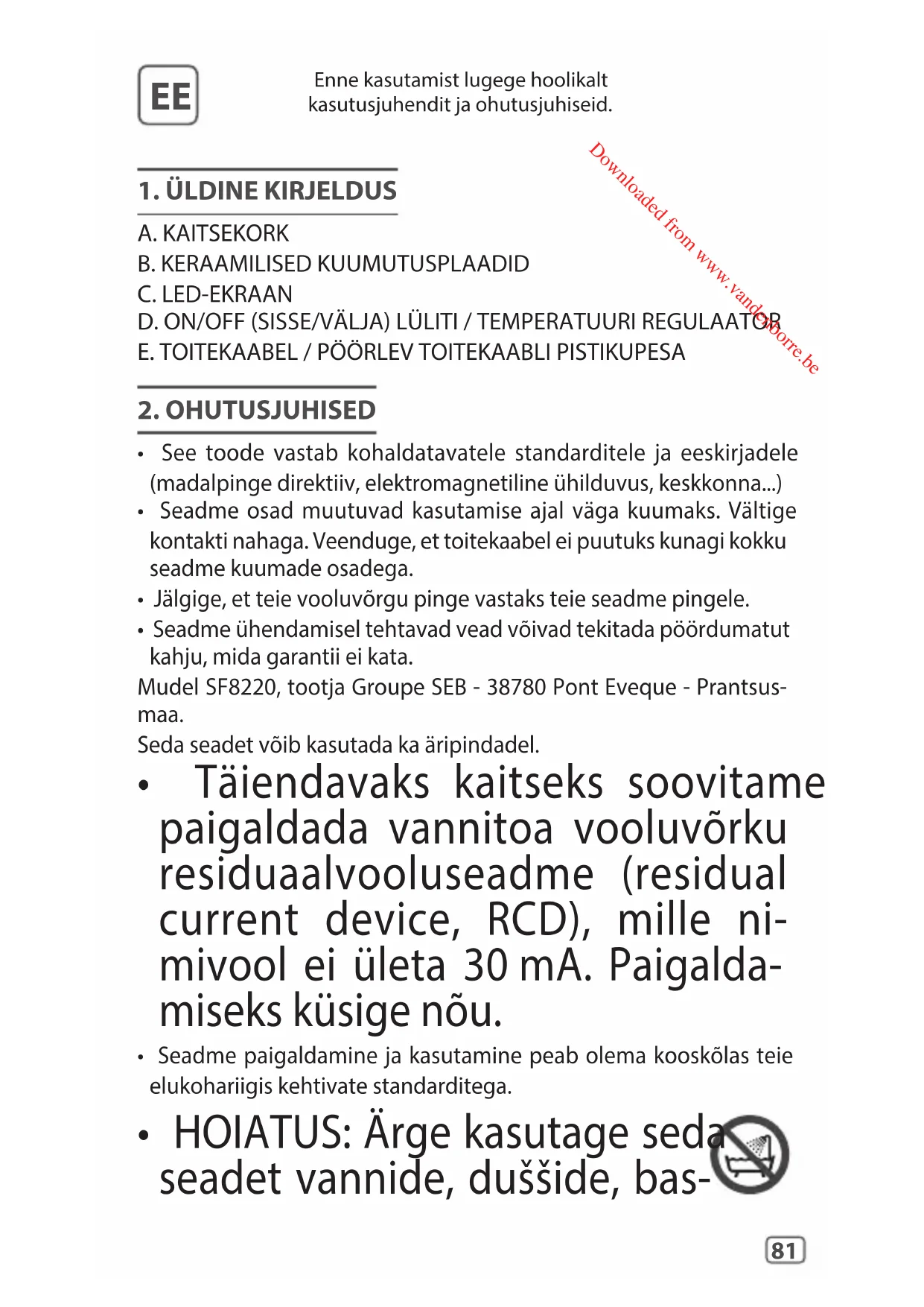 - Seadme ühendamisel tehtavad vead võivad tekitada pöördumatut kahju, mida garantii ei kata. Mudel SF8220, tootja Groupe SEB - 38780 Pont Eveque - Prantsus- maa. Seda seadet võib kasutada ka äripindadel.