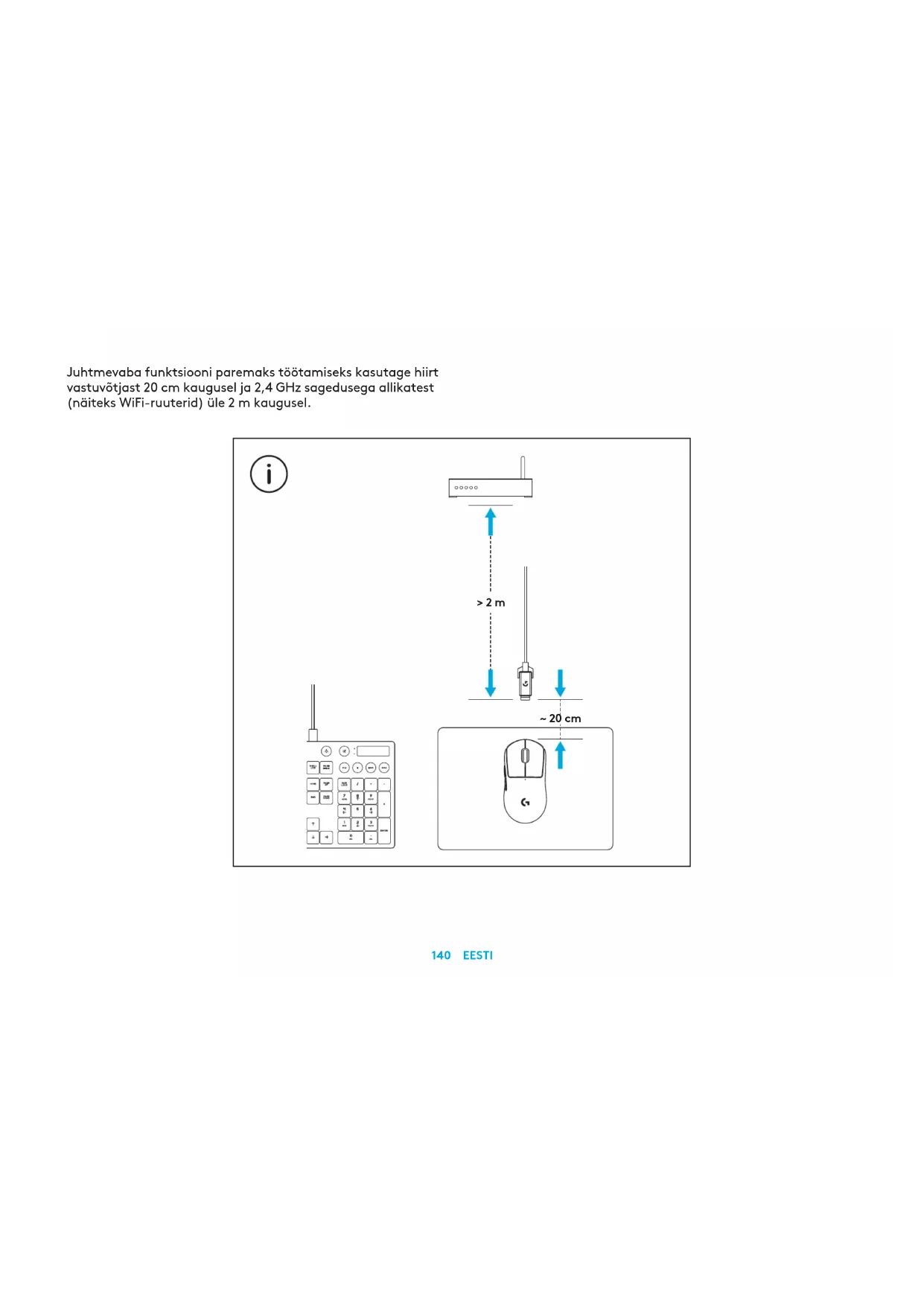 logitechG.com/ghub140 EESTI > 2 m ~ 20 cm Juhtmevaba funktsiooni paremaks töötamiseks kasutage hiirt vastuvõtjast 20 cm kaugusel ja 2,4 GHz sagedusega allikatest (näiteks WiFi-ruuterid) üle 2 m kaugusel.141 EESTI Valikulise kleepriba paigaldamiseks puhastage hiire pinda esmalt sellega kaasas oleva pinna ettevalmistamiseks mõeldud riidelapiga, et eemaldada rasu- või tolmujäägid. Seejärel joondage kleepriba ettevaatlikult hiire pinnaga. 1 2142 EESTI USB-vastuvõtjat saab hoiustada hiire sees, kui eemaldada POWERPLAYavakate. See aitab ära hoida vastuvõtja kaotsiminekut, kui kasutate hiirt Logitech GPOWERPLAY juhtmevaba laadimissüsteemiga. Katte eemaldamine võimaldab ka tavalise avakatte asendamist hiirega kaasas oleva valikulise avakattega, millega on kaasas PTFE jalg. PTFE143 LATVISKI IEPAKOJUMA SATURS