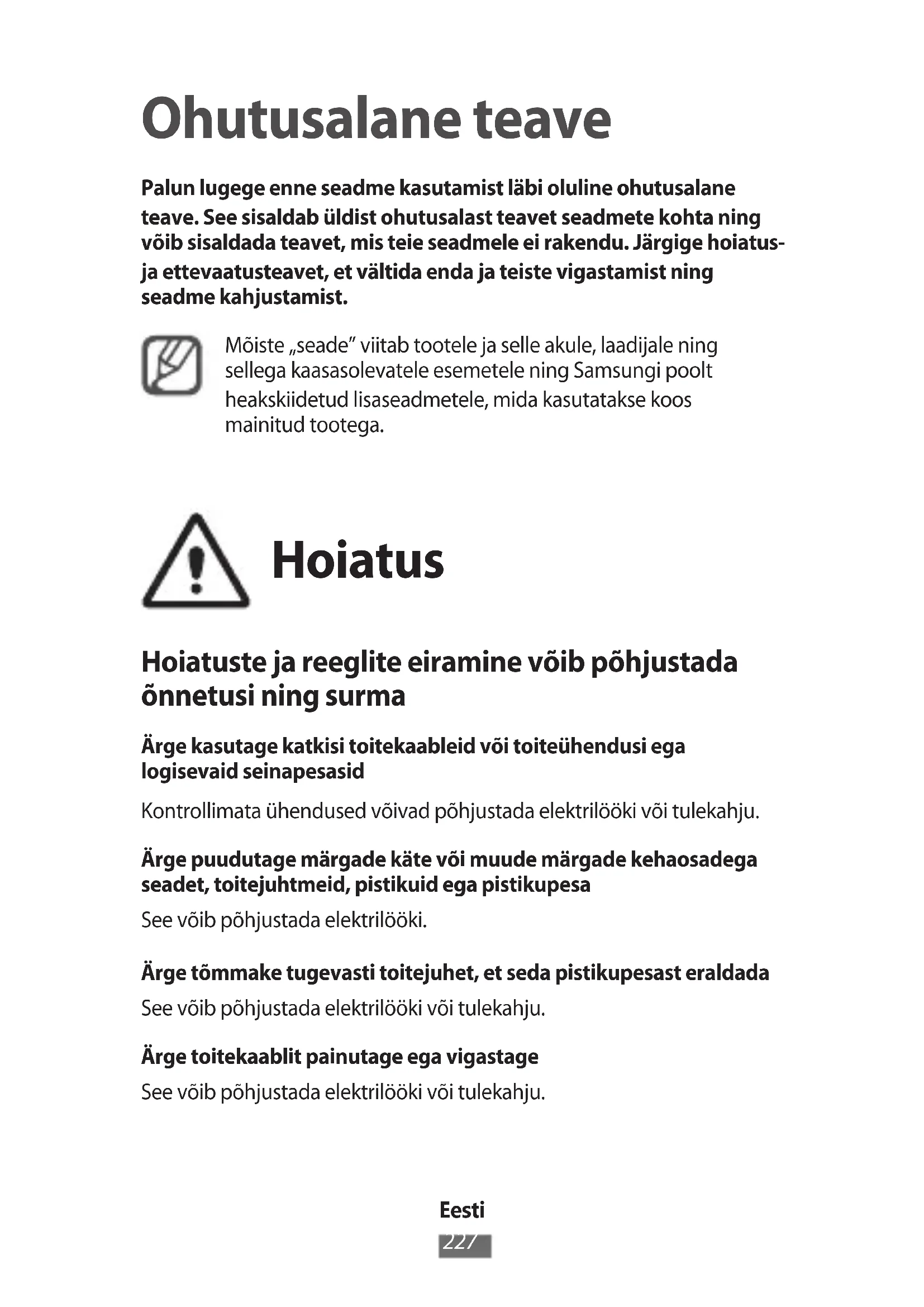 Ohutusalane teave Palun lugege enne seadme kasutamist läbi oluline ohutusalane teave. See sisaldab üldist ohutusalast teavet seadmete kohta ning võib sisaldada teavet, mis teie seadmele ei rakendu. Järgige hoiatus- ja ettevaatusteavet, et vältida enda ja teiste vigastamist ning seadme kahjustamist. Mõiste „seade” viitab tootele ja selle akule, laadijale ning sellega kaasasolevatele esemetele ning Samsungi poolt heakskiidetud lisaseadmetele, mida kasutatakse koos mainitud tootega. Hoiatus Hoiatuste ja reeglite eiramine võib põhjustada õnnetusi ning surma Ärge kasutage katkisi toitekaableid või toiteühendusi ega logisevaid seinapesasid Kontrollimata ühendused võivad põhjustada elektrilööki või tulekahju. Ärge puudutage märgade käte või muude märgade kehaosadega seadet, toitejuhtmeid, pistikuid ega pistikupesa See võib põhjustada elektrilööki. Ärge tõmmake tugevasti toitejuhet, et seda pistikupesast eraldada See võib põhjustada elektrilööki või tulekahju. Ärge toitekaablit painutage ega vigastage See võib põhjustada elektrilööki või tulekahju.Eesti