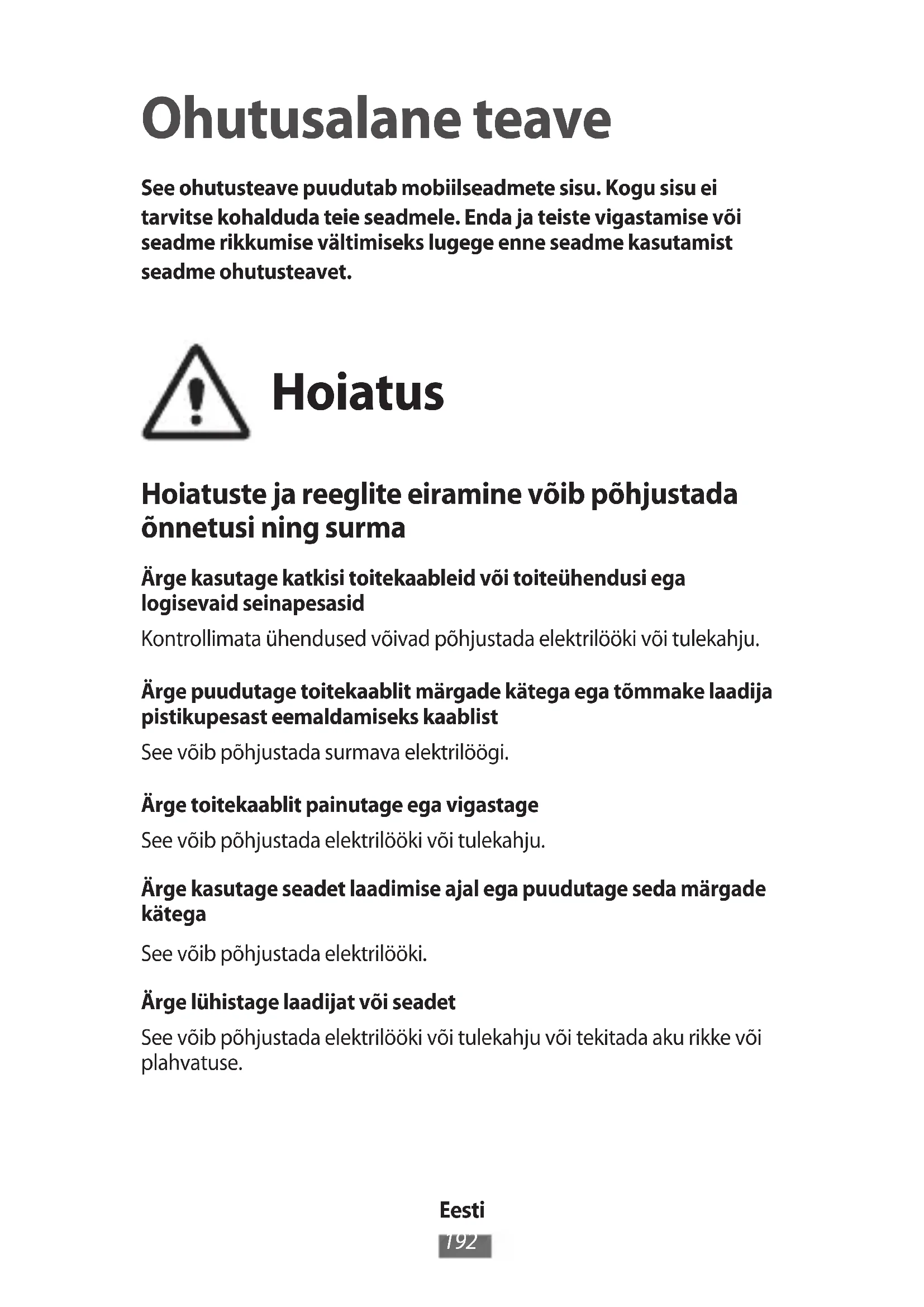 Ohutusalane teave See ohutusteave puudutab mobiilseadmete sisu. Kogu sisu ei tarvitse kohalduda teie seadmele. Enda ja teiste vigastamise või seadme rikkumise vältimiseks lugege enne seadme kasutamist seadme ohutusteavet. Hoiatus Hoiatuste ja reeglite eiramine võib põhjustada õnnetusi ning surma Ärge kasutage katkisi toitekaableid või toiteühendusi ega logisevaid seinapesasid Kontrollimata ühendused võivad põhjustada elektrilööki või tulekahju. Ärge puudutage toitekaablit märgade kätega ega tõmmake laadija pistikupesast eemaldamiseks kaablist See võib põhjustada surmava elektrilöögi. Ärge toitekaablit painutage ega vigastage See võib põhjustada elektrilööki või tulekahju. Ärge kasutage seadet laadimise ajal ega puudutage seda märgade kätega See võib põhjustada elektrilööki. Ärge lühistage laadijat või seadet See võib põhjustada elektrilööki või tulekahju või tekitada aku rikke või plahvatuse.Eesti