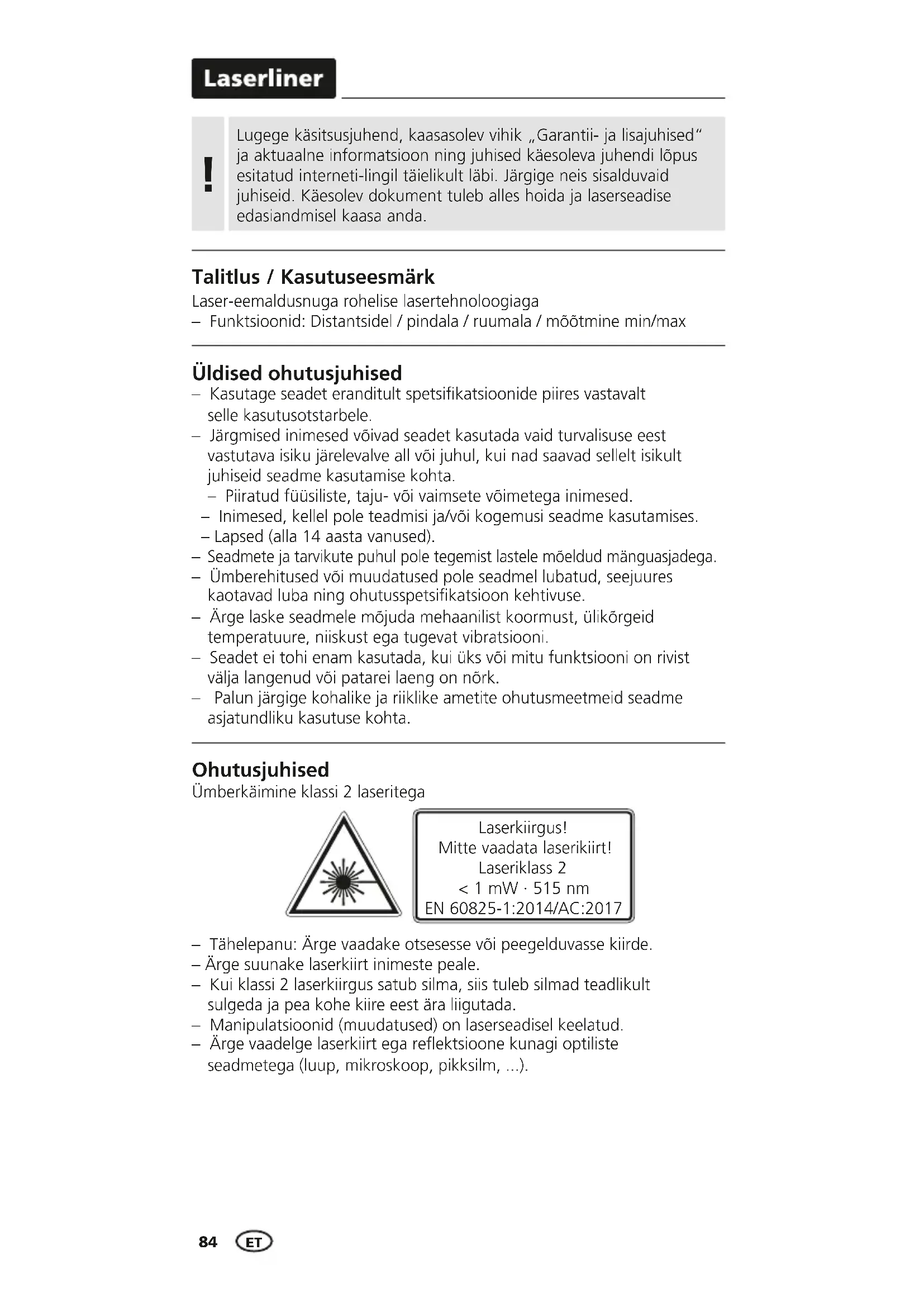 Seadmete ja tarvikute puhul pole tegemist lastele mõeldud mänguasjadega. – Ümberehitused või muudatused pole seadmel lubatud, seejuures kaotavad luba ning ohutusspetsikatsioon kehtivuse. – Ärge laske seadmele mõjuda mehaanilist koormust, ülikõrgeid temperatuure, niiskust ega tugevat vibratsiooni. – Seadet ei tohi enam kasutada, kui üks või mitu funktsiooni on rivist välja langenud või patarei laeng on nõrk. – Palun järgige kohalike ja riiklike ametite ohutusmeetmeid seadme asjatundliku kasutuse kohta. – Tähelepanu: Ärge vaadake otsesesse või peegelduvasse kiirde. – Ärge suunake laserkiirt inimeste peale. – Kui klassi 2 laserkiirgus satub silma, siis tuleb silmad teadlikult sulgeda ja pea kohe kiire eest ära liigutada. – Manipulatsioonid (muudatused) on laserseadisel keelatud. – Ärge vaadelge laserkiirt ega reektsioone kunagi optiliste seadmetega (luup, mikroskoop, pikksilm, ...). Ohutusjuhised Ümberkäimine klassi 2 laseritega Laserkiirgus! Mitte vaadata laserikiirt! Laseriklass 2 < 1 mW · 515 nm EN 60825-1:2014/AC:2017 Laser-eemaldusnuga rohelise lasertehnoloogiaga – Funktsioonid: Distantsidel / pindala / ruumala / mõõtmine min/max Talitlus / Kasutuseesmärk Lugege käsitsusjuhend, kaasasolev vihik „Garantii- ja lisajuhised“ ja aktuaalne informatsioon ning juhised käesoleva juhendi lõpus esitatud interneti-lingil täielikult läbi. Järgige neis sisalduvaid juhiseid. Käesolev dokument tuleb alles hoida ja laserseadise edasiandmisel kaasa anda.