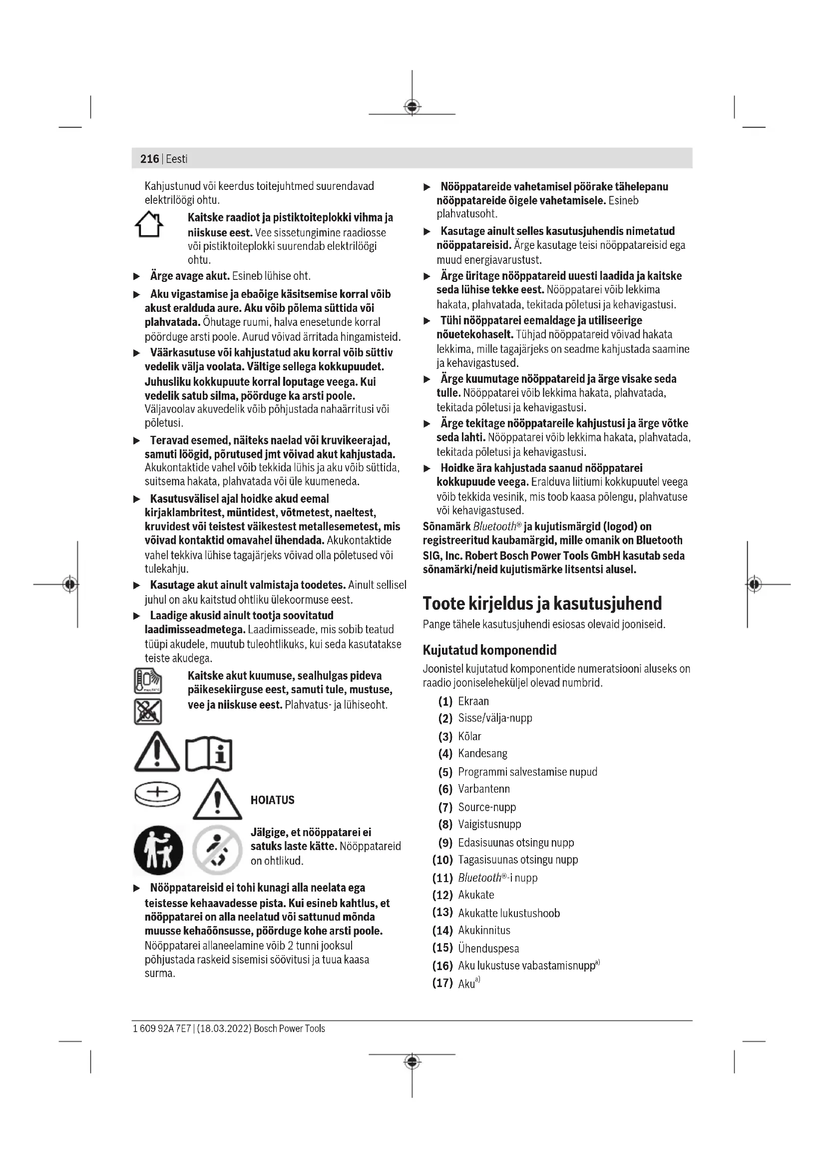 Muud tehnilised andmed leiate veebiaadressilt https://www.bosch-professional.com/ecodesign Raadio energiavarustus Raadiot saab energiaga varustada liitiumioonaku(17) või pistiktoiteploki(20) kaudu. Akurežiim u Kasutage üksnes tehnilistes andmetes loetletud laadimisseadmeid. Ainult need laadimisseadmed on ette nähtud raadios kasutatava liitiumioonaku laadimiseks. Märkus. Raadio jaoks mittesobivate akude kasutamine võib põhjustada raadio väärtalitlust või kahjustumist. Liitiumioonakut kaitseb süvatühjenemise eest akuelementide elektrooniline kaitse "Electronic Cell Protection (ECP)". Tühjenenud aku korral lülitab kaitselüliti raadio välja. u Kui kaitselülitus on raadio välja lülitanud, ärge lülitage seda uuesti sisse. Võite kahjustada akut. Aku vahetamine Avage akukatte lukustushoob(13) ja pöörake akukate(12) lahti. Aku eemaldamiseks vajutage vabastamisnuppu(16) ja tõmmake aku akupesast välja. Ärge rakendage seejuures jõudu. Aku paigaldamiseks lükake aku selliselt akukinnitusse(14), et akuühendused asetseksid akukinnituse ühenduste peal. Laske akul fikseeruda. Sulgege ja lukustage akukate(12). Aku laetuse taseme näidik Kui aku on paigaldatud, saate aku(17) laetuse taset vaadata ekraanilt, eemaldatud aku korral aga akult endalt. Aku laetuse taseme näidik ekraanil Aku laetuse taseme näidik(i) ilmub ekraanile kohe, kui paigaldatud on piisava pingega aku ja raadio ei ole vooluvõrguga pistiktoiteploki(20) kaudu ühendatud. Näidik Mahtuvus 80−100% 60−80% 40−60% 20−40% 5−20% 0−5% Aku laetuse taseme näidik akul Kui aku mõõteriistast välja võetakse, saab laetuse taset vaadata akul olevate roheliste LED-ide järgi. Laetuse taseme vaatamiseks vajutage laetuse taseme näidiku nuppu või . Kui laetuse taseme näidiku nupuvajutamisel ei sütti ükski LED, on aku defektne ja tuleb välja vahetada. Aku tüüp GBA 18V... LEDid Mahtuvus pidev valgus 3× roheline 60−100% pidev valgus 2× roheline 30−60% pidev valgus 1× roheline 5−30% vilkuv valgus 1× roheline 0−5% Aku tüüp ProCORE18V... LEDid Mahtuvus pidev valgus 5× roheline 80−100 % pidev valgus 4× roheline 60−80 % pidev valgus 3× roheline 40−60 % pidev valgus 2× roheline 20−40 % pidev valgus 1× roheline 5−20 % vilkuv valgus 1× roheline 0−5 % Kasutamine pistiktoiteplokiga (vtjoonistA) u Kasutage üksnes tehnilistes andmetes loetletud pistiktoiteplokke. Raadio töötab vaid siis nõuetekohaselt. u Pöörake tähelepanu võrgupingele! Vooluallika pinge peab vastama pistiktoiteploki tüübisildil märgitud andmetele. Avage selleks ühenduspesa kaitsekate(15). Ühendage pistiktoiteploki seadmepistik(21) ühendusliitmikku(22) (DCIN18V). Ühendage võrguadapter vooluvõrguga. Kaitseks mustuse eest sulgege ühenduspesa(15) kaitsekate pärast seadmepistiku(21) eemaldamist uuesti. Nööppatarei vahetamine Kellaaja ja muude sätete salvestamiseks raadiol tuleb paigaldada nööppatarei. Eemaldage enne raadio esimest kasutamist paigaldatud nööppatarei kaitseriba. Avage akukatte lukustushoob(13) ja pöörake akukate(12) lahti. Vajaduse korral eemaldage aku(17). Tõmmake nööppatarei katte(18) all olev kaitseriba välja. Vahetage nööppatarei välja, kui raadiol ei salvestata enam kellaaega ja näidik muutub tuhmimaks. 1 609 92A 7E7 | (18.03.2022) Bosch Power ToolsEesti | 219 Selleks keerake nööppatarei katet(18) vastupäeva (nt mündiga) ja võtke kate ära. Paigaldage uus nööppatarei. Seejuures veenduge, et polaarsus vastab katte(18) siseküljel olevale joonisele. Asetage nööppatarei kate(18) tagasi ja keerake päripäeva kinni. Kate on lukustatud vaid siis, kui kattel ja lukusümbolil olevad märgistused on üksteisega kohakuti. u Kui te raadiot pikemat aega ei kasuta, võtke nööppatarei välja. Nööppatarei võib pikemaajalisel raadios seismisel korrodeeruda või iseeneslikult tühjeneda. Kasutamine u Kaitske raadiot otsese veega kokkupuutumise eest. Vee tungimine raadiosse suurendab elektrilöögi ohtu. u Hoidke akukatet ja ühenduspesa kaitsekatet võimalikult suletuna. Suletud katted kaitsevad raadiot vee ja tolmu eest. Audiorežiim Sisse-/väljalülitamine Raadio sisselülitamiseks vajutage sisse/välja-nuppu(2). Ekraan(1) aktiveeritakse ning edastama hakatakse raadio viimasel väljalülitamisel seadistatud audioallikat. Ekraanil(1) süttib iga nupuvajutuse korral mõneks sekundiks tuli. Raadio väljalülitamiseks vajutage uuesti sisse/välja- nuppu(2). Audioallika praegune seadistus salvestatakse. Helitugevuse reguleerimine Pärast raadio sisselülitamist on alati seadistatud vaikne helitugevus. Helitugevuse suurendamiseks keerake sisse/välja-nuppu(2) päripäeva, vähendamiseks vastupäeva. Helitugevuse seadistust<VL> või<Volume> kuvatakse ekraanil väärtuste vahemikus 0 kuni 30. Seadistage helitugevus enne raadiosaatja seadistamist või vahetamist madalale väärtusele, enne välise audioallika käivitamist keskmisele väärtusele. Heli vaigistamiseks võite lühidalt vajutada vaigistusnuppu(8). Heli uuesti sisselülitamiseks vajutage kas uuesti vaigistusnuppu või keerake sisse/välja-nuppu(2) päripäeva. Helitugevust saab igal ajal muuta. Kui menüüfunktsioon on aktiveeritud, lülitub näidik pärast helitugevuse muutmist menüüsse tagasi. Raadio lülitub 19minuti pärast automaatselt välja, kui sel ajal: – seati raadio helitugevus väärtusele0, – lülitati raadio heli välja või – seati taasesitusseadme (nt nutitelefoni) helitugevus väärtusele0. Audioallika valimine Audioallika valimiseks vajutage Source-nuppu(7) nii kaua, kuni ekraanil kuvatakse soovitud sisemine või väline audioallikas: – DAB/DAB2: digiraadio DAB+ (GPB18V‑2SC) kaudu, – FM/FM2: analoograadio FM kaudu, – AUX: väline audioallikas (nt nutitelefon)(24) ühenduspesas(15) oleva 3,5mm liitmikuAUXIN kaudu, – : väline audioallikas (nt nutitelefon ) Bluetooth®-i ühenduse kaudu. Aktiivset audioallikat kuvatakse audioallika näidikul(b) või Bluetooth®-i näidikul(a). Audi