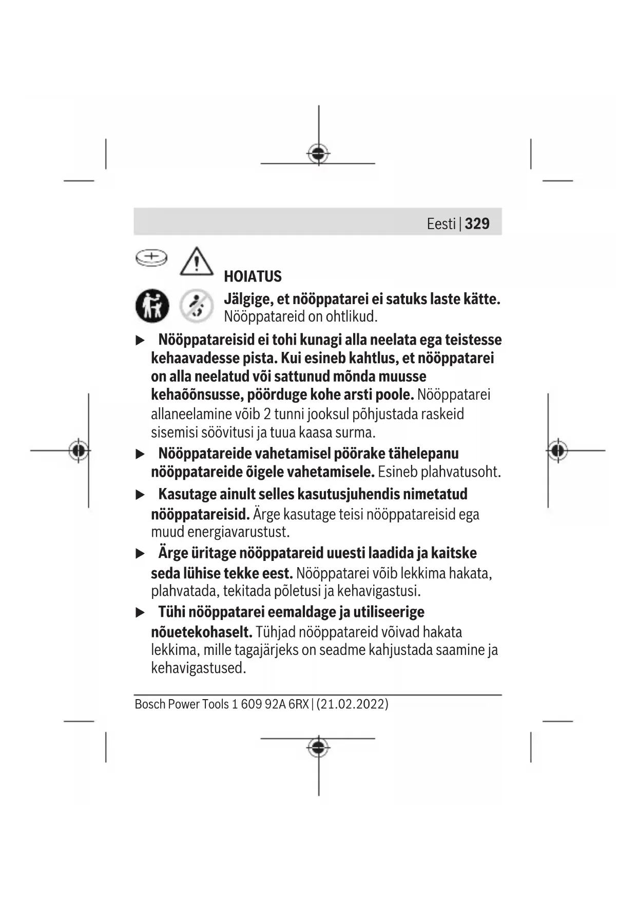 Ulatus võib olenevalt välistest tingimustest, sh kasutatavast vastuvõtuseadmest, tugevalt varieeruda. Suletud ruumides ja metallpiirete tõttu (nt seinad, riiulid, kohvrid jms) võib Bluetooth®-i ulatus olla oluliselt väiksem. Süsteemi eeltingimused GCY 42 Mobiilne lõppseade (tahvelarvuti, nutitelefon) Android 6.0 (ja uuem) iOS 11 (ja uuem) Bosch Power Tools 1 609 92A 6RX | (21.02.2022)334 | Eesti Paigaldamine ja kasutamine Energiavarustus u Eemaldage elektriliselt tööriistalt Bluetooth® Low Energy Module GCY 42 kate nt kruvikeeraja või suure mündi abil. Ebasobivate esemete kasutamisel on oht kahjustada elektroonikat või katet. – Ostmisejärgsel kasutuselevõtul või patarei (1) vahetamisel järgige jooniselehekülgedel toodud kujutisi. Seejuures pöörake tähelepanu järgmistele suunistele. Emakordne kasutuselevõtt (vaata jooniseid A1–A5) Suunis: Hoidke GCY 42 metamärki (3) hoolikalt. Elektrilise tööriista edasiandmisel ilma GCY 42-ta asetage metamärk jälle oma kohale. Asetage patarei (1) plusspoolusega üleval GCY 42-le (2). Patareid ei ole vaja sisse suruda; patarei ei fikseeru ise. See fikseerub ettenähtud asendis alles katte sulgemisel. GCY42 initsialiseerimiseks paigaldamise järel käsitsege elektrilise tööriista sisse-/väljalülitit. 1 609 92A 6RX | (21.02.2022) Bosch Power ToolsEesti | 335 Patarei vahetamine (vaata jooniseid B1–B4) Võtke kasutatud patarei (1) välja ainult sõrmede abil. Enne patarei kasutusressursi täielikku ammendumist kuvatakse rakenduses hoiatus. GCY 42 eemaldamine (vaata jooniseid C1–C2) Ärge rakendage GCY42 (2) eemaldamiseks jõudu. Ärge kasutage teravaid esemeid. Suunis: GCY42 lihtsamaks eemaldamiseks pöörake vajaduse korral elektrilist tööriista. Seadme kasutuselevõtt Niipea kui patarei (1) on kohale asetatud ja vajutatud elektrilise tööriista sisse-/väljalülitit, saadab GCY42 pidevalt välja signaali. Bluetooth®-signaal katkeb alles siis, kui patarei on tühi või vigane või eemaldatakse. Täiendavat teavet saate otse Boschi rakendusest. Bosch Power Tools 1 609 92A 6RX | (21.02.2022)336 | Eesti Rakenduse installimine ja häälestamine GCY42 kasutamise võimaldamiseks peate kõigepealt installima rakenduse Bosch Toolbox. – Laadige vastavast rakendustepoest (Apple App Store, Google Play Store) alla Bosch Toolbox. Suunis: Eelduseks on vastava rakendustepoe kasutajakonto olemasolu. – Valige seejärel rakendusest alapunkt MyTools. – Teie mobiilse lõppseadme ekraanil kuvatakse kõiki järgnevaid samme elektrilise tööriista ühendamiseks lõppseadmega. Suunis: Tehke kõigepealt täielikult läbi rakenduse kasutamise näidisprotsess. Nii saate parema ülevaate ühendamistoimingust ja ühenduvusfunktsioonide kasutamisest. Andmete ülekandmine Bluetooth’i® abil GCY42-l on korrapärane saatmisintervall. Olenevalt keskkonnast võib vaja minna mitut saatmisintervalli, enne kui 1 609 92A 6RX | (21.02.2022) Bosch Power ToolsEesti | 337 GCY 42 tuvastatakse. Kui seadet GCY42 ei tuvastata, kontrollige järgmisi asjaolusid. – Kas kaugus mobiilsest lõppseadmest on liiga suur? Vähendage vahekaugust mobiilse lõppseadme ja GCY42 vahel. – Kas patarei on liiga nõrk või tühi? Vahetage patarei välja. – Lülitage oma mobiilsel lõppseadmel Bluetooth® välja ja jälle sisse. Kontrollige, kas nüüd tuvastatakse GCY42. Hooldus ja korrashoid Hooldus ja puhastamine Eemaldage mustus pintsliga. Ärge kasutage puhastusvahendeid või lahusteid. Klienditeenindus ja kasutusalane nõustamine Klienditeeninduse töötajad vastavad teie küsimustele teie toote remondi ja hoolduse ning varuosade kohta. Joonised ja info varuosade kohta leiate ka veebisaidilt: www.bosch-pt.com Bosch Power Tools 1 609 92A 6RX | (21.02.2022)338 | Eesti Boschi nõustajad on meeleldi abiks, kui teil on küsimusi toodete ja lisatarvikute kasutamise kohta. Päringute esitamisel ja varuosade tellimisel teatage meile kindlasti toote tüübisildil olev 10‑kohaline tootenumber. Eesti Vabariik Teeninduskeskus Tel.: (+372) 6549 575 Faks: (+372) 6549 576 E-posti: service-pt@lv.bosch.com Muud teeninduse aadressid leiate jaotisest: www.bosch-pt.com/serviceaddresses Kasutuskõlbmatuks muutunud seadmete ringlussevõtt GCY42 moodulid, lisavarustus ja pakendid tuleb suunata loodushoidlikult taaskasutusse. Ärge visake elektroonikadetaile ja patareisid olmejäätmete hulka! 1 609 92A 6RX | (21.02.2022) Bosch Power ToolsLatviešu | 339 Üksnes ELliikmesriikidele: Vastavalt direktiivile 2012/19/EL elektri- ja elektroonikaseadmete jäätmete kohta ning nende kohaldamisele riigi õigusaktides tuleb kasutusressursi ammendanud elektritööriistad ja vastavalt direktiivile 2006/66/EÜ defektsed või kasutusressursi ammendanud akud/patareid eraldi kokku koguda ja suunata keskkonnasäästlikku taaskasutusse. Vale jäätmekäitluse korral võivad vanad elektri- ja elektroonikaseadmed, milles sisaldub kahjulikke aineid, kahjustada keskkonda ja inimeste tervist. Latviešu Drošības noteikumi Lai varētu arGCY42 strādāt droši un bez riska, rūpīgi izlasiet un ievērojiet visus norādījumus. Saglabājiet šos norādījumus un, ja nododatGCY42 tālāk, nododiet tos līdzi. Bosch Power Tools 1 609 92A 6RX | (21.02.2022)340 | Latviešu u Lietojiet kopā ar šo moduli vienīgi šajā lietošanas pamācībā norādīto bateriju. Nelietojiet nekādus citus elektroapgādes avotus.