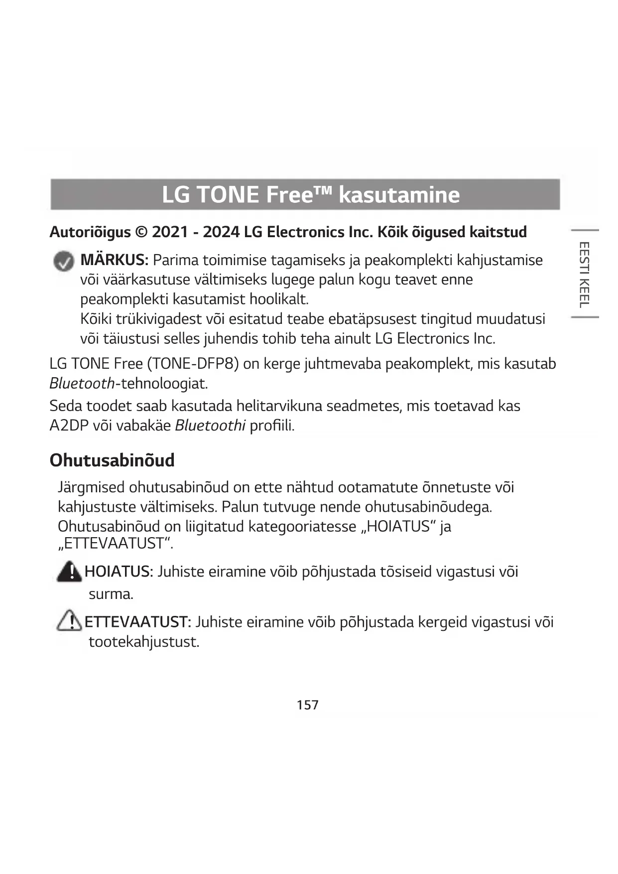Autoriõigus © 2021 - 2024 LG Electronics Inc. Kõik õigused kaitstud MÄRKUS: Parima toimimise tagamiseks ja peakomplekti kahjustamise või väärkasutuse vältimiseks lugege palun kogu teavet enne peakomplekti kasutamist hoolikalt. Kõiki trükivigadest või esitatud teabe ebatäpsusest tingitud muudatusi või täiustusi selles juhendis tohib teha ainult LG Electronics Inc. LG TONE Free (TONE-DFP8) on kerge juhtmevaba peakomplekt, mis kasutab Bluetooth-tehnoloogiat. Seda toodet saab kasutada helitarvikuna seadmetes, mis toetavad kas A2DP või vabakäe Bluetoothi proili. Ohutusabinõud Järgmised ohutusabinõud on ette nähtud ootamatute õnnetuste või kahjustuste vältimiseks. Palun tutvuge nende ohutusabinõudega. Ohutusabinõud on liigitatud kategooriatesse „HOIATUS“ ja „ETTEVAATUST“.