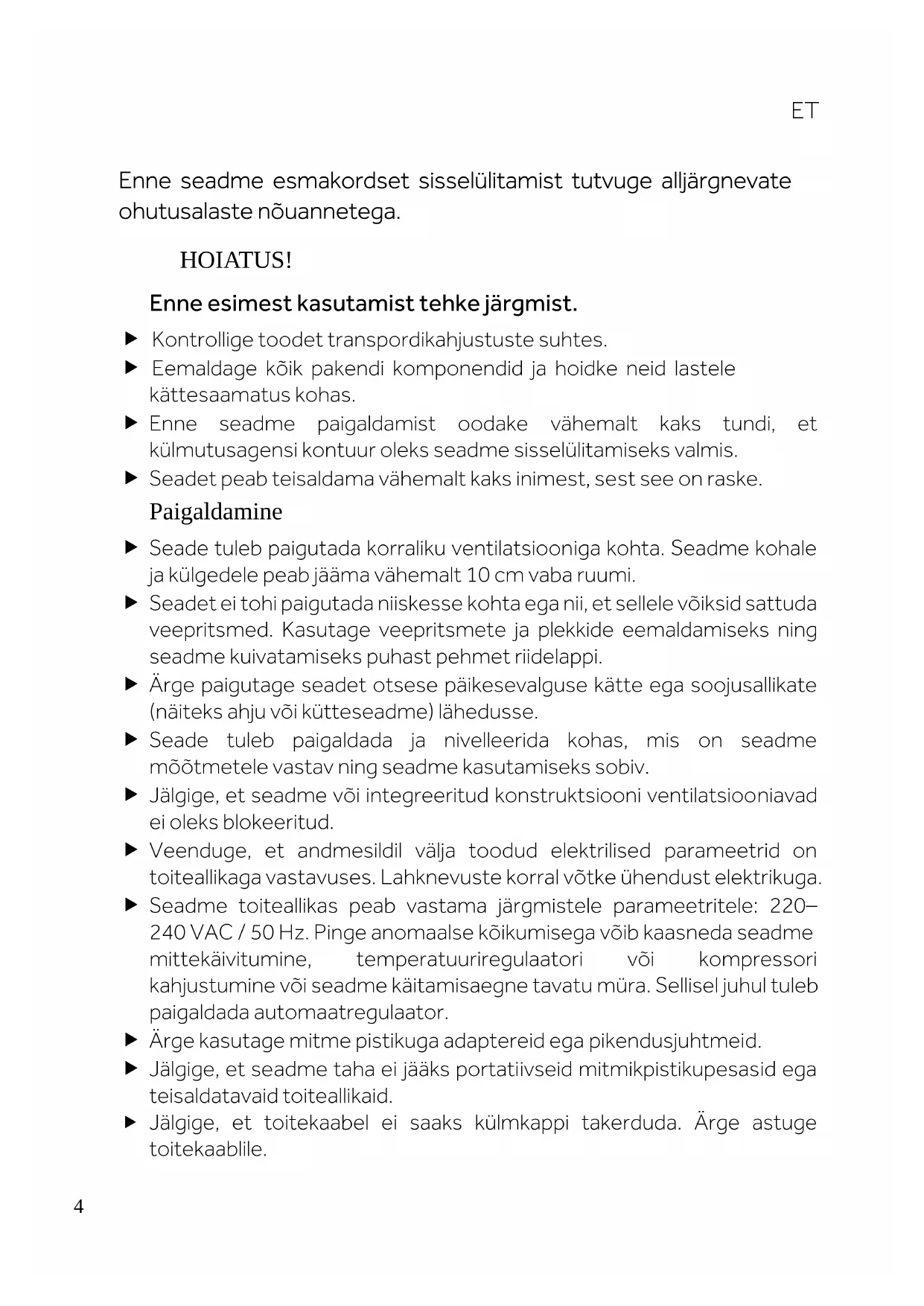 HOIATUS! Enne esimest kasutamist tehke järgmist. Kontrollige toodet transpordikahjustuste suhtes. Eemaldage kõik pakendi komponendid ja hoidke neid lastele kättesaamatus kohas. Enne seadme paigaldamist oodake vähemalt kaks tundi, et külmutusagensi kontuur oleks seadme sisselülitamiseks valmis. Seadet peab teisaldama vähemalt kaks inimest, sest see on raske. Paigaldamine Seade tuleb paigutada korraliku ventilatsiooniga kohta. Seadme kohale ja külgedele peab jääma vähemalt 10 cm vaba ruumi. Seadet ei tohi paigutada niiskesse kohta ega nii, et sellele võiksid sattuda veepritsmed. Kasutage veepritsmete ja plekkide eemaldamiseks ning seadme kuivatamiseks puhast pehmet riidelappi. Ärge paigutage seadet otsese päikesevalguse kätte ega soojusallikate (näiteks ahju või kütteseadme) lähedusse. Seade tuleb paigaldada ja nivelleerida kohas, mis on seadme mõõtmetele vastav ning seadme kasutamiseks sobiv. Jälgige, et seadme või integreeritud konstruktsiooni ventilatsiooniavad ei oleks blokeeritud. Veenduge, et andmesildil välja toodud elektrilised parameetrid on toiteallikaga vastavuses. Lahknevuste korral võtke ühendust elektrikuga. Seadme toiteallikas peab vastama järgmistele parameetritele: 220– 240 VAC / 50 Hz. Pinge anomaalse kõikumisega võib kaasneda seadme mittekäivitumine, temperatuuriregulaatori või kompressori kahjustumine või seadme käitamisaegne tavatu müra. Sellisel juhul tuleb paigaldada automaatregulaator. Ärge kasutage mitme pistikuga adaptereid ega pikendusjuhtmeid. Jälgige, et seadme taha ei jääks portatiivseid mitmikpistikupesasid ega teisaldatavaid toiteallikaid. Jälgige, et toitekaabel ei saaks külmkappi takerduda. Ärge astuge toitekaablile.Ohutusteave