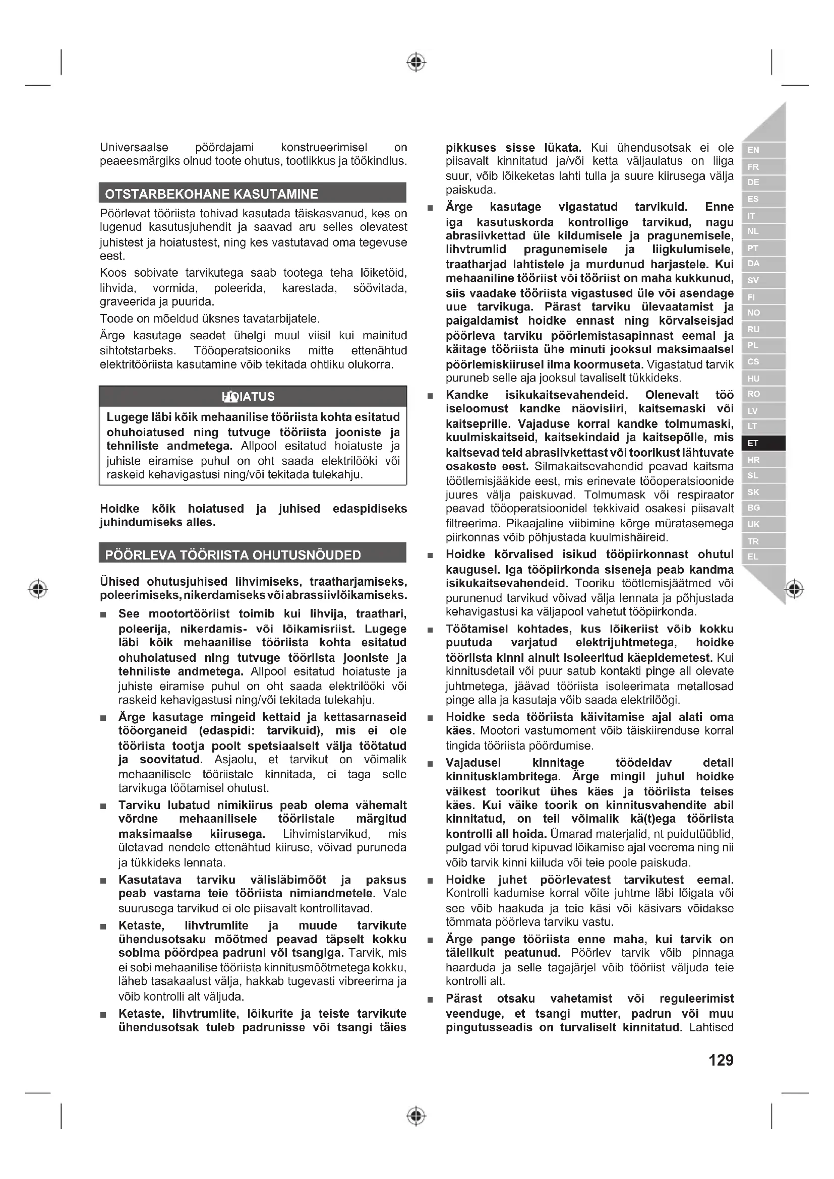 Universaalse pöördajami konstrueerimisel on peaeesmärgiks olnud toote ohutus, tootlikkus ja töökindlus. OTSTARBEKOHANE KASUTAMINE Pöörlevat tööriista tohivad kasutada täiskasvanud, kes on lugenud kasutusjuhendit ja saavad aru selles olevatest juhistest ja hoiatustest, ning kes vastutavad oma tegevuse eest. Koos sobivate tarvikutega saab tootega teha lõiketöid, lihvida, vormida, poleerida, karestada, söövitada, graveerida ja puurida. Toode on mõeldud üksnes tavatarbijatele. Ärge kasutage seadet ühelgi muul viisil kui mainitud sihtotstarbeks. Tööoperatsiooniks mitte ettenähtud elektritööriista kasutamine võib tekitada ohtliku olukorra. HOIATUS Lugege läbi kõik mehaanilise tööriista kohta esitatud ohuhoiatused ning tutvuge tööriista jooniste ja tehniliste andmetega. Allpool esitatud hoiatuste ja juhiste eiramise puhul on oht saada elektrilööki või raskeid kehavigastusi ning/või tekitada tulekahju. Hoidke kõik hoiatused ja juhised edaspidiseks juhindumiseks alles.