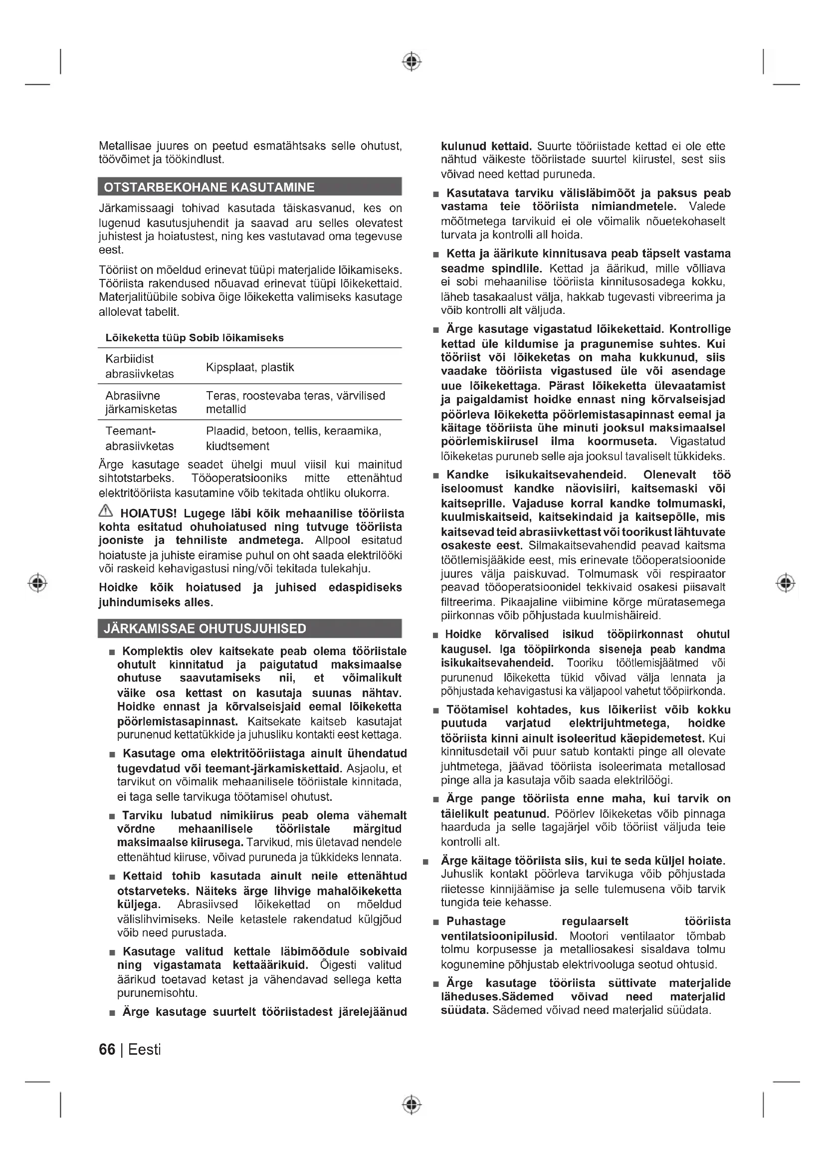 Tagasilöök ja sellega seotud hoiatused Kinnikiilunud või haardunud lõikeketas põhjustab ootamatu tagasilöögi. Kinnikiilumine või haardumine põhjustab pöörleva lõikeketta kiire peatumise, mis omakorda tingib kinnijäämispunktis vastassuunaliste kontrollimatute jõudude mõjumise lõikeketta pöörlemisele vastassuunas. Näiteks juhul, kui abrasiivketas on toorikuga haardunud või sellesse kinni jäänud, võib ketta sisenev serv kinnijäämise punktis materjali pinna sisse kaevuda ja põhjustada ketta väljaliikumise või tagasilöögi. Ketas võib hüpata operaatori suunas või temast eemale, sõltuvalt ketta liikumissuunast kinnijäämise punktis. Abrasiivkettad võivad selliste tingimuste korral puruneda. Tagasilöök on tööriista väära kasutamise, ebaõigete töövõtete või tööks mittevastavate töötingimuste tulemus ja seda saab vältida allpool esitatud ettevaatusabinõude rakendamisega. ■ Tagasilöögist tulenevate jõudude vastuvõtmiseks kasutage oma keha ja käsivart ning hoidke tööriistast tugevasti kinni. Kasutage alati komplektis olevat lisakäepidet, et hoida tagasilööki või puutereaktsioonist tingitud reaktsiooni kontrolli all. Operaatoril on võimalik puutereaktsioone ja tagasilöögist tekkivaid jõudusid hallata, kui selleks vastavaid meetmeid võtta. ■ Ärge hoidke mingil juhul oma kätt pöörleva tarviku läheduses. Tarvik võib tagasilöögiga tabada teie kätt. ■ Ärge seiske tööriista taga pöörleva ketta tasapinnas. Tagasilöök paiskab kinnijäämise kohas tööriista vastuspidisesse suunda ketta pöörlemisele. ■ Olge eriti ettevaatlik töötamisel nurkades, teravatel servadel jne. Vältige tarviku põrkumist ja kinnijäämist. Nurkades ja teravatel servadel või põrkumisel on kalduvus pöörlevat tarvikut kinni kiiluda ja põhjustada sellega kontrolli kadumist või tagasilööki. ■ Ärge kinnitage seadmele kettsaagi, freesi, hammastatud saeketast ega pilutatud teemantketast, mille pilude vahe on 10 mm. Selliste ketaste kasutamisel ilmneb tihti tagasilööki ja kontrolli kadumist. ■ Ärge laske lõikekettal kinni jääda ega suruge sellele liigselt peale. Ärge püüdke kasutada liiga suurt lõikesügavust. Liigse jõu avaldamine suurendab ketta koormust, väändumist või kinnijäämist lõiketees ning suurendab tagasilöögi või ketta purunemise tõenäosust. ■ Kui ketas jääb kinni või lõikamine katkeb mingil muul põhjusel, lülitage tööriist välja ja hoidke seda liikumatuna seni, kui ketas täielikult seiskub. Ärge püüdke võtta lõikeketast lõikekohast välja ketta pöörlemise ajal, muidu võib ilmneda tagasilöök. Uurige ketta kinnijäämise põhjus välja ja võtke meetmeid selle kõrvaldamiseks. ■ Ärge alustage lõikamisoperatsiooni uuesti siis, kui ketas on tooriku sees. Laske kettal saavutada täiskiirus ja pange ketas uuesti lõikekohta. Kui lõikamist jätkata ilma, et ketas oleks välja võetud, siis võib see kinni jääda, üles tõusta või anda tagasilöögi. ■ Toetage lõigatavaid plaate ja suuremõõtmelisi toorikuid, et minimeerida ketta kinnijäämise ning tagasilöögi ohtu. Suurtel toorikutel on kalduvus oma raskuse all läbi vajuda. Toetage toorikuid altpoolt lõikejoone lähedal ja serva lähedal mõlemal pool lõikejoont. ■ Olge pesa lõikamisel seina sisse või varjatud kohtadesse ettevaatlik. Väljuv ketas võib lõigata läbi gaasi- või veetorud, elektrijuhtmed või muud objektid ja need võivad põhjustada tagasilööki.
