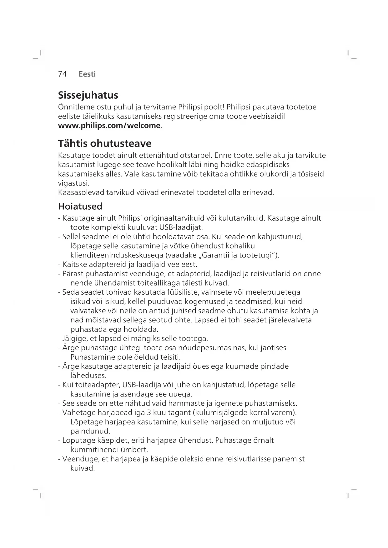 Eesti Sissejuhatus Õnnitleme ostu puhul ja tervitame Philipsi poolt! Philipsi pakutava tootetoe eeliste täielikuks kasutamiseks registreerige oma toode veebisaidil www.philips.com/welcome. Tähtis ohutusteave Kasutage toodet ainult ettenähtud otstarbel. Enne toote, selle aku ja tarvikute kasutamist lugege see teave hoolikalt läbi ning hoidke edaspidiseks kasutamiseks alles. Vale kasutamine võib tekitada ohtlikke olukordi ja tõsiseid vigastusi. Kaasasolevad tarvikud võivad erinevatel toodetel olla erinevad. Hoiatused - Kasutage ainult Philipsi originaaltarvikuid või kulutarvikuid. Kasutage ainult toote komplekti kuuluvat USB-laadijat. - Sellel seadmel ei ole ühtki hooldatavat osa. Kui seade on kahjustunud, lõpetage selle kasutamine ja võtke ühendust kohaliku klienditeeninduskeskusega (vaadake „Garantii ja tootetugi”). - Kaitske adaptereid ja laadijaid vee eest. - Pärast puhastamist veenduge, et adapterid, laadijad jareisivutlarid on enne nende ühendamist toiteallikaga täiesti kuivad. - Seda seadet tohivad kasutada füüsiliste, vaimsete või meelepuuetega isikud või isikud, kellel puuduvad kogemused ja teadmised, kui neid valvatakse või neile on antud juhised seadme ohutu kasutamise kohta ja nad mõistavad sellega seotud ohte. Lapsed ei tohi seadet järelevalveta puhastada ega hooldada. - Jälgige, et lapsed ei mängiks selle tootega. - Ärge puhastage ühtegi toote osa nõudepesumasinas, kui jaotises Puhastamine pole öeldud teisiti. - Ärge kasutage adaptereid ja laadijaid õues ega kuumade pindade läheduses. - Kui toiteadapter, USB-laadija või juhe on kahjustatud, lõpetage selle kasutamine ja asendage see uuega. - See seade on ette nähtud vaid hammaste ja igemete puhastamiseks. - Vahetage harjapead iga 3 kuu tagant (kulumisjälgede korral varem). Lõpetage harjapea kasutamine, kui selle harjased on muljutud või paindunud. - Loputage käepidet, eriti harjapea ühendust. Puhastage õrnalt kummitihendi ümbert. - Veenduge, et harjapea ja käepide oleksid enne reisivutlarisse panemist kuivad.75 Eesti - Vältige kokkupuudet eeterlike õlide või kookosõliga. Kokkupuute tagajärjel võivad harjased paigalt nihkuda. - Seadme kasutamise maksimaalne kõrgus merepinnast on 4500m. - Teave REACH ainete kohta, sisalduvad Philipsi toodetes, leiab aadressilt www.philips.com/REACH Meditsiinilised hoiatused - Lõpetage seadme kasutamine ja konsulteerige oma hambaarstiga, kui pärast kasutamist tekib liigne või kauakestev veritsemine või kui tunnete kasutamise ajal ebamugavust või valu. - Kui kasutate südamestimulaatorit või muud implantaatseadet, võtke enne hambaharja kasutamist ühendust arsti või implantaadi tootjaga. - See seade on isikliku hoolduse seade ja ei ole mõeldud mitme kasutaja jaoks. Aku ohutusjuhised - See seade sisaldab patareisid, mida saavad eemaldada ainult asjatundjad. - Vältige toote ja aku sattumist lahtise tule lähedusse ning ärge laske neil kokku puutuda otsese päikesevalguse või kõrge temperatuuriga. - Kui toode läheb ebatavaliselt kuumaks või eritab ebatavalist lõhna, muudab värvi või kui laadimine võtab tavapärasest kauem aega, lõpetage toote kasutamine ja laadimine ning võtke ühendust Philipsiga. - Ärge asetage toodet ega akut mikrolaineahju ega induktsioonipliidi peale. - Et vältida aku kuumenemist või toksiliste või ohtlike ainete vabastamist, ärge avage, muutke, läbistage, kahjustage ega demonteerige toodet või akut. Akut ei tohi lühistada, üle laadida ega vale polaarsusega laadida. - See seade sisaldab akut, mida ei saa vahetada. Kui aku eluiga hakkab lõppema, tuleb seade nõuetekohaselt kasutusest kõrvaldada, vt jaotist Ringlussevõtt. - Laadige ainult Philipsi poolt kontrollitud IPX4 adapteritega WAA1001, WAA2001, mille sisendparameetrid on (100‑240V~; 50/60Hz; 3,5W) ja väljundparameetrid (5VDC; 2,5W). Adapterite loendi leiate veebilehel www.philips.com/support. - Laadige ja kasutage toodet temperatuuril vahemikus 0°C ja 40°C. Säilitamis- ja transportimistingimused Temperatuur –20 kuni +60°C. Elektromagnetväljad (EMF) See Philipsi seade vastab kõikidele kokkupuudet elektromagnetiliste väljadega käsitlevatele kohaldatavatele standarditele ja õigusnormidele.76 Eesti