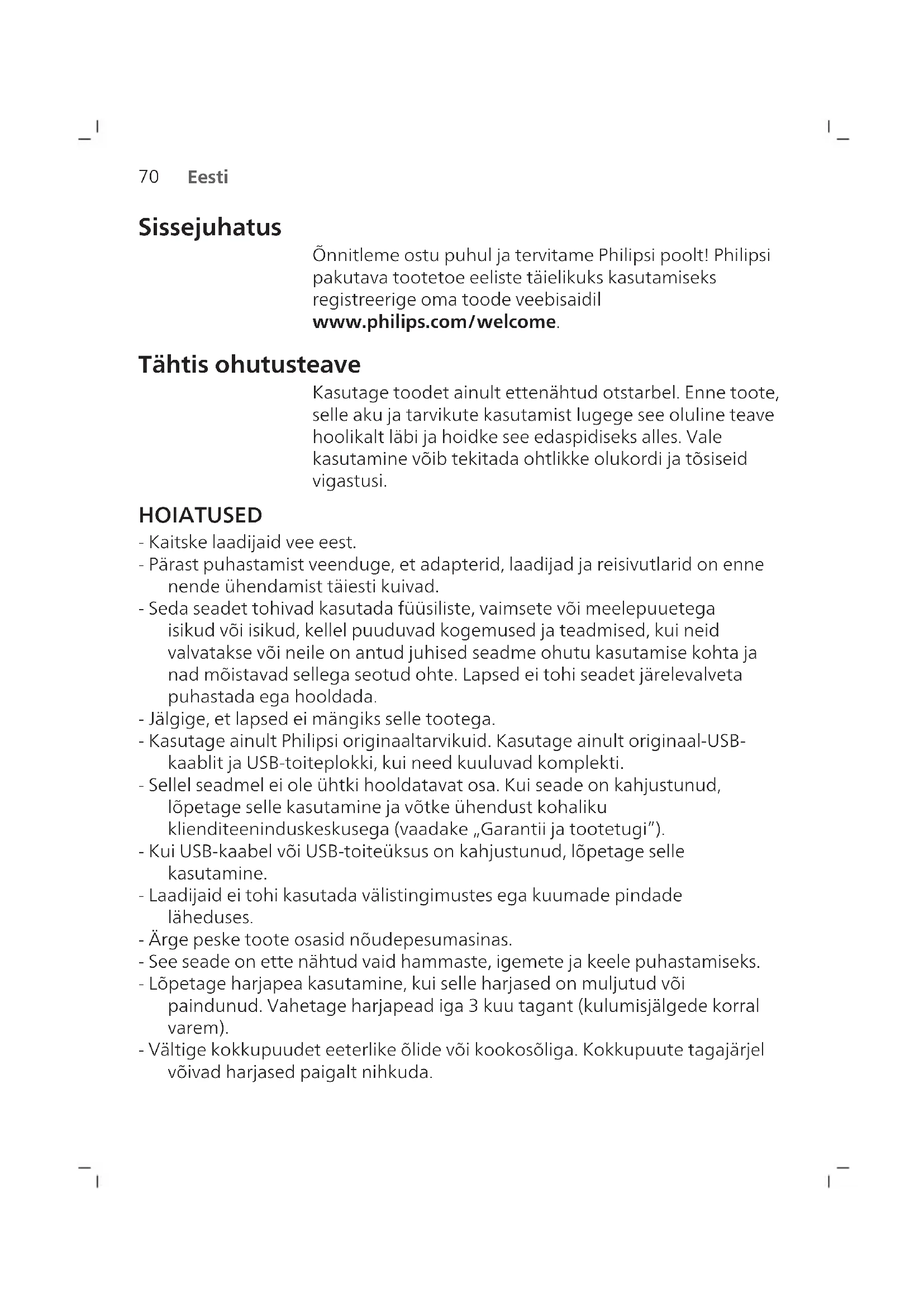 Eesti Sissejuhatus Õnnitleme ostu puhul ja tervitame Philipsi poolt! Philipsi pakutava tootetoe eeliste täielikuks kasutamiseks registreerige oma toode veebisaidil www.philips.com/welcome. Tähtis ohutusteave Kasutage toodet ainult ettenähtud otstarbel. Enne toote, selle aku ja tarvikute kasutamist lugege see oluline teave hoolikalt läbi ja hoidke see edaspidiseks alles. Vale kasutamine võib tekitada ohtlikke olukordi ja tõsiseid vigastusi. HOIATUSED - Kaitske laadijaid vee eest. - Pärast puhastamist veenduge, et adapterid, laadijad jareisivutlarid on enne nende ühendamist täiesti kuivad. - Seda seadet tohivad kasutada füüsiliste, vaimsete või meelepuuetega isikud või isikud, kellel puuduvad kogemused ja teadmised, kui neid valvatakse või neile on antud juhised seadme ohutu kasutamise kohta ja nad mõistavad sellega seotud ohte. Lapsed ei tohi seadet järelevalveta puhastada ega hooldada. - Jälgige, et lapsed ei mängiks selle tootega. - Kasutage ainult Philipsi originaaltarvikuid. Kasutage ainult originaal-USB- kaablit ja USB-toiteplokki, kui need kuuluvad komplekti. - Sellel seadmel ei ole ühtki hooldatavat osa. Kui seade on kahjustunud, lõpetage selle kasutamine ja võtke ühendust kohaliku klienditeeninduskeskusega (vaadake „Garantii ja tootetugi”). - Kui USB-kaabel või USB-toiteüksus on kahjustunud, lõpetage selle kasutamine. - Laadijaid ei tohi kasutada välistingimustes ega kuumade pindade läheduses. - Ärge peske toote osasid nõudepesumasinas. - See seade on ette nähtud vaid hammaste, igemete ja keele puhastamiseks. - Lõpetage harjapea kasutamine, kui selle harjased on muljutud või paindunud. Vahetage harjapead iga 3 kuu tagant (kulumisjälgede korral varem). - Vältige kokkupuudet eeterlike õlide või kookosõliga. Kokkupuute tagajärjel võivad harjased paigalt nihkuda.71 Eesti MEDITSIINILISED HOIATUSED - Lõpetage seadme kasutamine ja pidage nõu hambaarsti/arstiga, kui pärast kasutamist esineb liigset veritsemist, kui veritsemine jätkub pärast 1. kasutusnädalat või kui tunnete ebamugavust või valu. - Kui teil on olnud viimase 2 kuu jooksul suuõõne või igemete operatsioon, pidage enne seadme kasutamist nõu hambaarstiga. - Kui kasutate südamestimulaatorit või muud implantaatseadet, võtke enne hambaharja kasutamist ühendust arsti või implantaadi tootjaga. - Kui teil on meditsiinilisi küsimusi, võtke enne seadme kasutamist ühendust oma arstiga. - See seade on personaalne hügieeniseade ega ole mõeldud üldiseks kasutamiseks hambaravikabinetis või -asutuses. AKU OHUTUSJUHISED - Laadige ainult Philipsi WAA1001, WAA2001 või heakskiidetud ohutute adapteritega, mille sisendnimiandmed on 100–240V~; 50/60Hz; 3,5W ja väljundnimiandmed 5V(alalisvool); 2,5W. Adapterite nimekirja leiate aadressilt www.philips.com/support - See seade sisaldab patareisid, mida saavad eemaldada ainult asjatundjad. - Laadige ja kasutage toodet temperatuuril 32 °F / 0–104 °F / 40°C. - Kasutage toodet ainult ettenähtud otstarbel. Enne toote, selle patareide ja tarvikute kasutamist lugege see teave hoolikalt läbi ja hoidke edaspidiseks kasutamiseks alles. Vale kasutamine võib tekitada ohtlikke olukordi ja tõsiseid vigastusi. Kaasasolevad tarvikud võivad erinevatel toodetel olla erinevad. - Kasutage ainult Philipsi originaaltarvikuid. - Hoidke toode ja akud eemal tulest ja ärge jätke neid otsese päikesevalguse või kõrge temperatuuri kätte. - Kui toode läheb ebatavaliselt kuumaks või eritab ebatavalist lõhna, muudab värvi või kui laadimine võtab tavapärasest kauem aega, lõpetage toote kasutamine ja laadimine ning võtke ühendust Philipsiga. - Ärge pange tooteid ja nende akusid mikrolaineahju või induktsioonpliitidele. - Akude kuumenemise või mürgiste või ohtlike ainete vabanemise vältimiseks ärge toodet ega akusid avage, muutke, augustage, kahjustage ega võtke osadeks lahti. Ärge akusid lühistage, üle laadige ega laadige pööratud polaarsusega. - See seade sisaldab akusid, mida ei saa vahetada. Kui aku eluiga hakkab lõppema, tuleb seade nõuetekohaselt kasutusest kõrvaldada, vt jaotist Ringlussevõtt.72 Eesti - See seade sisaldab laetavat liitiumioonakut. TULEB NÕUDEID JÄRGIDES RINGLUSSE VÕTTA VÕI KASUTUSEST KÕRVALDADA. Tootel võivad olla järgmised sümbolid: Lugege kasutusjuhendit. Eemaldatava toiteploki osa:„xxxxxx” tähistab kasutamiseks sobivat laadija mudeli numbrit. Säilitamis- ja transportimistingimused - Temperatuur (transport ja hoiustamine) –10°C kuni +60°C. Elektromagnetväljad (EMF) Käesolev Philips seade on vastavuses kõigi elektromagnetvälja mõju alla sattumist käsitlevate standardite ja määrustega. Ettenähtud kasutamine Seeria 1000 ja 2000 Series elektrilised hambaharjad on ette nähtud hammastelt katu ja toidujääkide eemaldamiseks, et vähendada hammaste lagunemist ning parandada ja hoida suuhügieeni. Seeria 1000 ja 2000 Series elektrilised hambaharjad on ette nähtud koduseks kasutamiseks. Lapsed tohivad neid kasutada üksnes täiskasvanute järelevalve all. Philips Sonicare'i hambahari 1 Hügieeniline reisikork 2 Harjapea 3 Käepide73 Eesti 4 Toitenupp 5 Aku laetuse näidik 6 USB-laadija (seinaadapter ei kuulu komplekti) Märkus. Seinaadapter ei kuulu komplekti. Kasutage ainult 5V IPX4 adapterit (tüüp A). Alustamine Harjapea kinnitamine