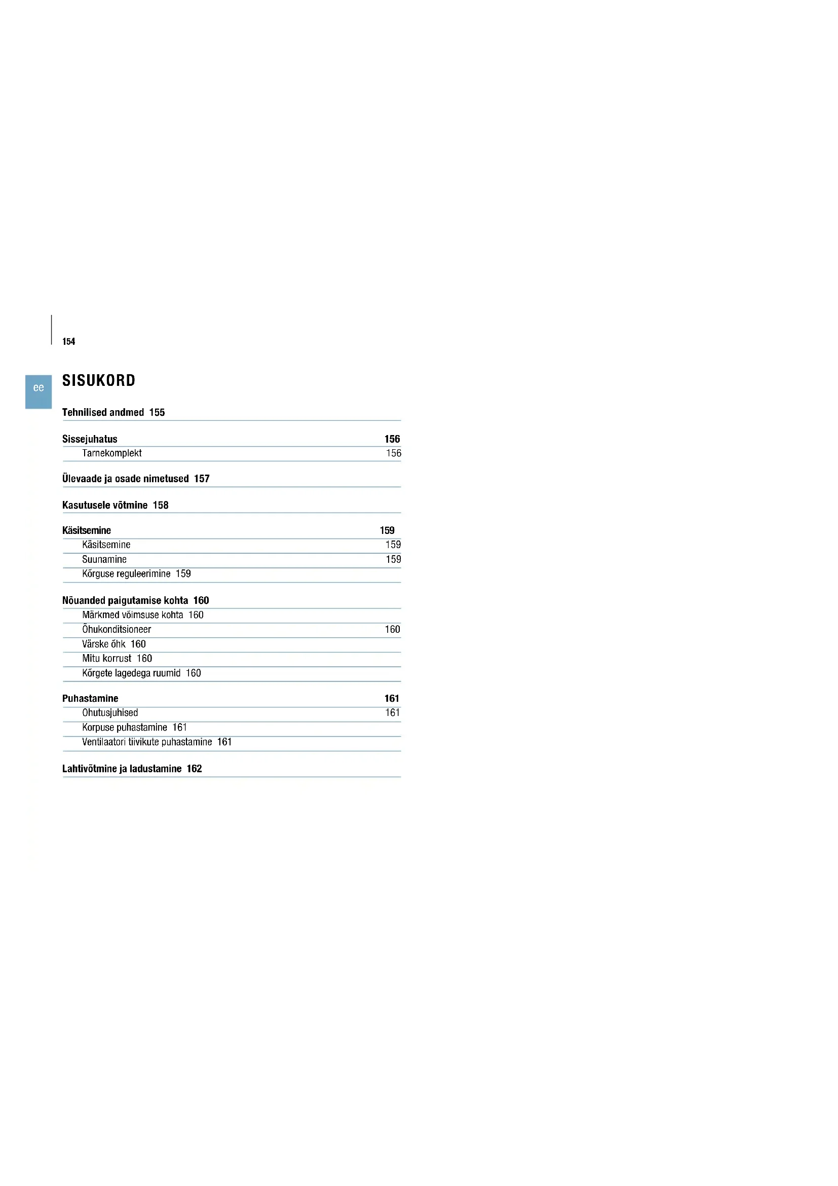 SISUKORD Tehnilised andmed 155 Sissejuhatus 156 Tarnekomplekt 156 Ülevaade ja osade nimetused 157 Kasutusele võtmine 158 Käsitsemine 159 Käsitsemine 159 Suunamine 159 Kõrguse reguleerimine 159 Nõuanded paigutamise kohta 160 Märkmed võimsuse kohta 160 Õhukonditsioneer 160 Värske õhk 160 Mitu korrust 160 Kõrgete lagedega ruumid 160 Puhastamine 161 Ohutusjuhised 161 Korpuse puhastamine 161 Ventilaatori tiivikute puhastamine 161 Lahtivõtmine ja ladustamine 162155
