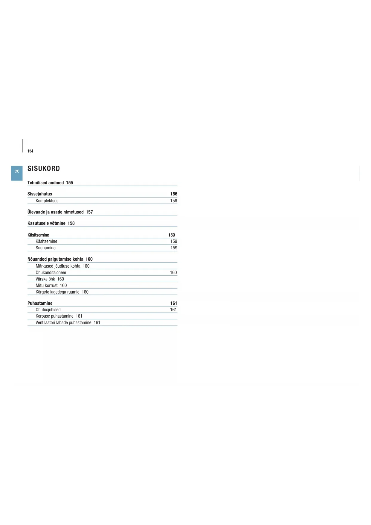 SISUKORD Tehnilised andmed 155 Sissejuhatus 156 Komplektsus 156 Ülevaade ja osade nimetused 157 Kasutusele võtmine 158 Käsitsemine 159 Käsitsemine 159 Suunamine 159 Nõuanded paigutamise kohta 160 Märkused jõudluse kohta 160 Õhukonditsioneer 160 Värske õhk 160 Mitu korrust 160 Kõrgete lagedega ruumid 160 Puhastamine 161 Ohutusjuhised 161 Korpuse puhastamine 161 Ventilaatori labade puhastamine 161155