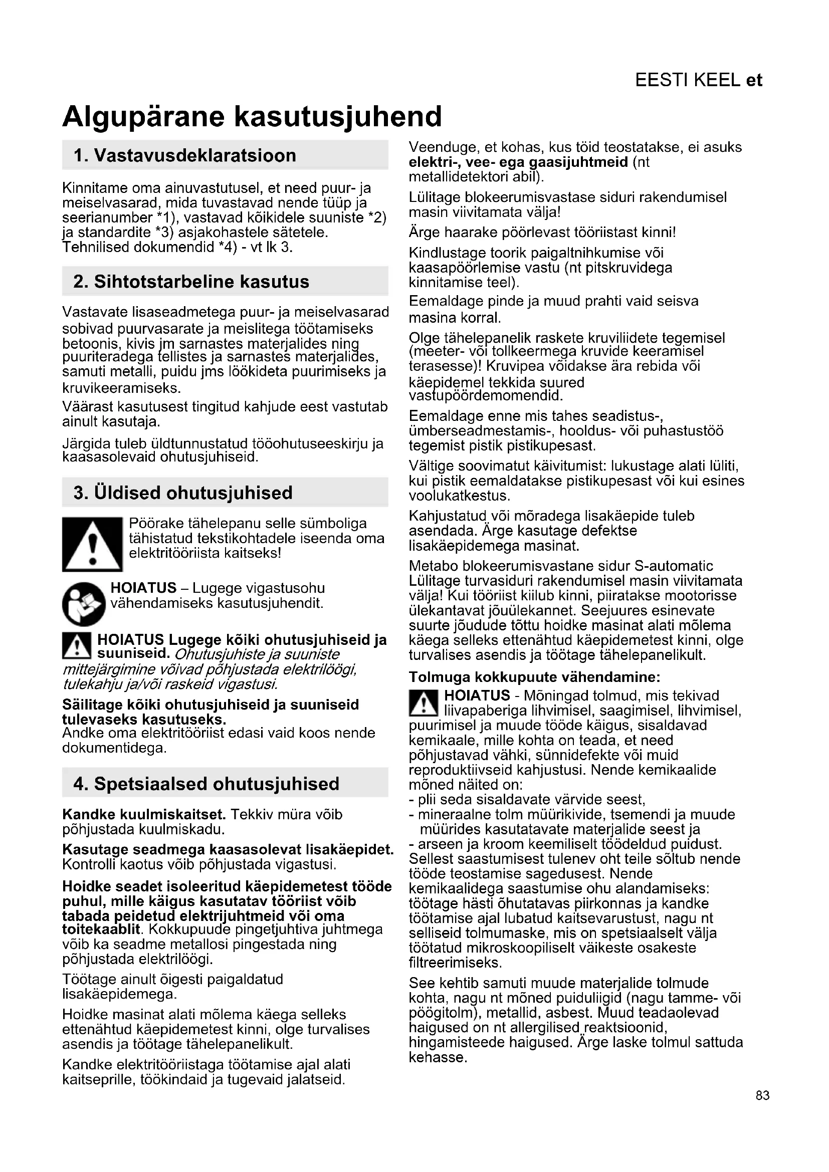Kinnitame oma ainuvastutusel, et need puur- ja meiselvasarad, mida tuvastavad nende tüüp ja seerianumber *1), vastavad kõikidele suuniste *2) ja standardite *3) asjakohastele sätetele. Tehnilised dokumendid *4) - vt lk 3. Vastavate lisaseadmetega puur- ja meiselvasarad sobivad puurvasarate ja meislitega töötamiseks betoonis, kivis jm sarnastes materjalides ning puuriteradega tellistes ja sarnastes materjalides, samuti metalli, puidu jms löökideta puurimiseks ja kruvikeeramiseks. Väärast kasutusest tingitud kahjude eest vastutab ainult kasutaja. Järgida tuleb üldtunnustatud tööohutuseeskirju ja kaasasolevaid ohutusjuhiseid. Pöörake tähelepanu selle sümboliga tähistatud tekstikohtadele iseenda oma elektritööriista kaitseks! HOIATUS – Lugege vigastusohu vähendamiseks kasutusjuhendit. HOIATUS Lugege kõiki ohutusjuhiseid ja suuniseid. Ohutusjuhiste ja suuniste mittejärgimine võivad põhjustada elektrilöögi, tulekahju ja/või raskeid vigastusi. Säilitage kõiki ohutusjuhiseid ja suuniseid tulevaseks kasutuseks. Andke oma elektritööriist edasi vaid koos nende dokumentidega. Kandke kuulmiskaitset. Tekkiv müra võib põhjustada kuulmiskadu. Kasutage seadmega kaasasolevat lisakäepidet. Kontrolli kaotus võib põhjustada vigastusi. Hoidke seadet isoleeritud käepidemetest tööde puhul, mille käigus kasutatav tööriist võib tabada peidetud elektrijuhtmeid või oma toitekaablit. Kokkupuude pingetjuhtiva juhtmega võib ka seadme metallosi pingestada ning põhjustada elektrilöögi. Töötage ainult õigesti paigaldatud lisakäepidemega. Hoidke masinat alati mõlema käega selleks ettenähtud käepidemetest kinni, olge turvalises asendis ja töötage tähelepanelikult. Kandke elektritööriistaga töötamise ajal alati kaitseprille, töökindaid ja tugevaid jalatseid. Veenduge, et kohas, kus töid teostatakse, ei asuks elektri-, vee- ega gaasijuhtmeid (nt metallidetektori abil). Lülitage blokeerumisvastase siduri rakendumisel masin viivitamata välja! Ärge haarake pöörlevast tööriistast kinni! Kindlustage toorik paigaltnihkumise või kaasapöörlemise vastu (nt pitskruvidega kinnitamise teel). Eemaldage pinde ja muud prahti vaid seisva masina korral. Olge tähelepanelik raskete kruviliidete tegemisel (meeter- või tollkeermega kruvide keeramisel terasesse)! Kruvipea võidakse ära rebida või käepidemel tekkida suured vastupöördemomendid. Eemaldage enne mis tahes seadistus-, ümberseadmestamis-, hooldus- või puhastustöö tegemist pistik pistikupesast. Vältige soovimatut käivitumist: lukustage alati lüliti, kui pistik eemaldatakse pistikupesast või kui esines voolukatkestus. Kahjustatud või mõradega lisakäepide tuleb asendada. Ärge kasutage defektse lisakäepidemega masinat. Metabo blokeerumisvastane sidur S-automatic Lülitage turvasiduri rakendumisel masin viivitamata välja! Kui tööriist kiilub kinni, piiratakse mootorisse ülekantavat jõuülekannet. Seejuures esinevate suurte jõudude tõttu hoidke masinat alati mõlema käega selleks ettenähtud käepidemetest kinni, olge turvalises asendis ja töötage tähelepanelikult. Tolmuga kokkupuute vähendamine: HOIATUS - Mõningad tolmud, mis tekivad liivapaberiga lihvimisel, saagimisel, lihvimisel, puurimisel ja muude tööde käigus, sisaldavad kemikaale, mille kohta on teada, et need põhjustavad vähki, sünnidefekte või muid reproduktiivseid kahjustusi. Nende kemikaalide mõned näited on: - plii seda sisaldavate värvide seest, - mineraalne tolm müürikivide, tsemendi ja muude müürides kasutatavate materjalide seest ja - arseen ja kroom keemiliselt töödeldud puidust. Sellest saastumisest tulenev oht teile sõltub nende tööde teostamise sagedusest. Nende kemikaalidega saastumise ohu alandamiseks: töötage hästi õhutatavas piirkonnas ja kandke töötamise ajal lubatud kaitsevarustust, nagu nt selliseid tolmumaske, mis on spetsiaalselt välja töötatud mikroskoopiliselt väikeste osakeste filtreerimiseks. See kehtib samuti muude materjalide tolmude kohta, nagu nt mõned puiduliigid (nagu tamme- või pöögitolm), metallid, asbest. Muud teadaolevad haigused on nt allergilised reaktsioonid, hingamisteede haigused. Ärge laske tolmul sattuda kehasse. Algupärane kasutusjuhend