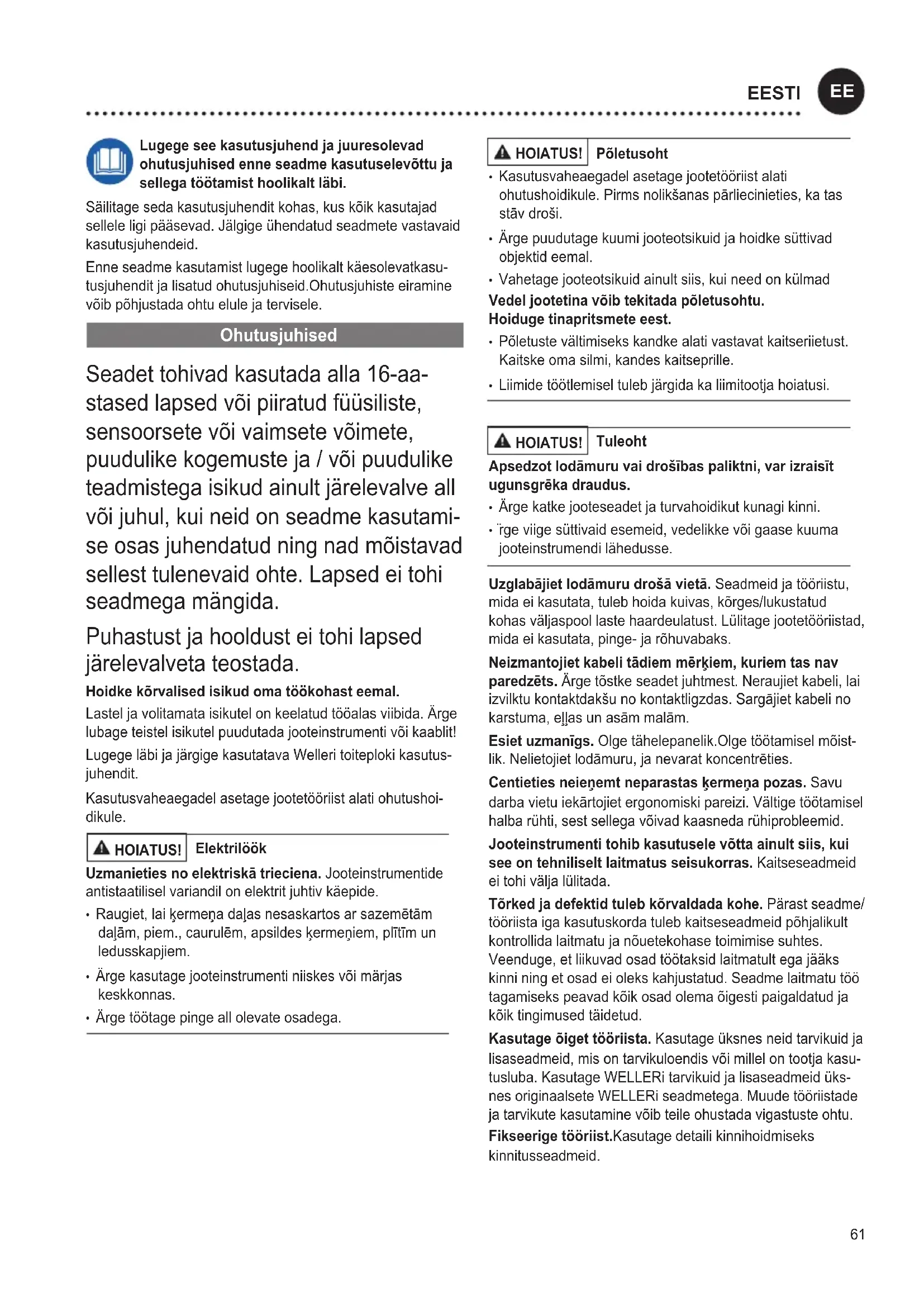 SLOVENŠČINA61 Lugege see kasutusjuhend ja juuresolevad ohutusjuhised enne seadme kasutuselevõttu ja sellega töötamist hoolikalt läbi. Säilitage seda kasutusjuhendit kohas, kus kõik kasutajad sellele ligi pääsevad. Jälgige ühendatud seadmete vastavaid kasutusjuhendeid. Enne seadme kasutamist lugege hoolikalt käesolevatkasu- tusjuhendit ja lisatud ohutusjuhiseid.Ohutusjuhiste eiramine võib põhjustada ohtu elule ja tervisele. Ohutusjuhised Seadet tohivad kasutada alla 16-aa- stased lapsed või piiratud füüsiliste, sensoorsete või vaimsete võimete, puudulike kogemuste ja / või puudulike teadmistega isikud ainult järelevalve all või juhul, kui neid on seadme kasutami- se osas juhendatud ning nad mõistavad sellest tulenevaid ohte. Lapsed ei tohi seadmega mängida. Puhastust ja hooldust ei tohi lapsed järelevalveta teostada. Hoidke kõrvalised isikud oma töökohast eemal. Lastel ja volitamata isikutel on keelatud tööalas viibida. Ärge lubage teistel isikutel puudutada jooteinstrumenti või kaablit! Lugege läbi ja järgige kasutatava Welleri toiteploki kasutus- juhendit. Kasutusvaheaegadel asetage jootetööriist alati ohutushoi- dikule. HOIATUS! Elektrilöök Uzmanieties no elektriskā trieciena. Jooteinstrumentide antistaatilisel variandil on elektrit juhtiv käepide.