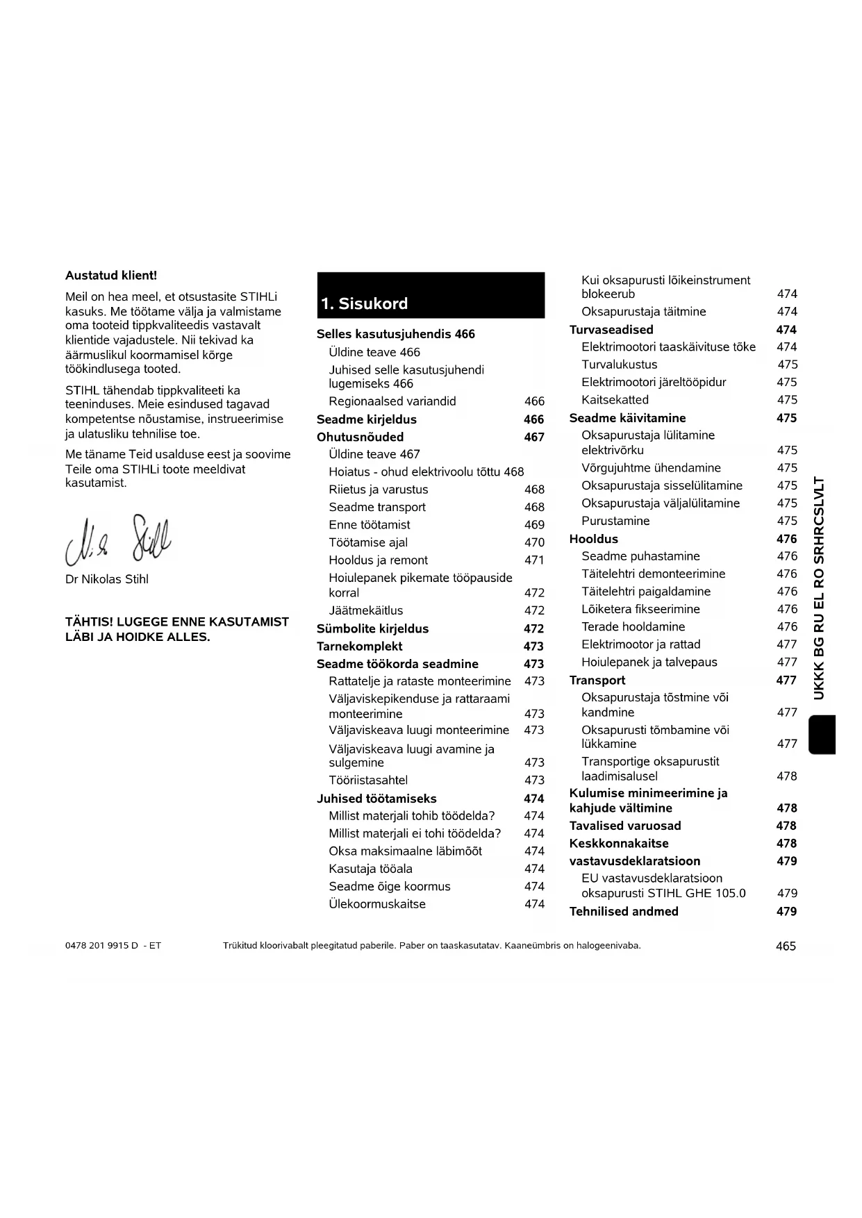 Selles kasutusjuhendis 466 Üldine teave 466 Juhised selle kasutusjuhendi lugemiseks 466 Regionaalsed variandid 466 Seadme kirjeldus 466 Ohutusnõuded 467 Üldine teave 467 Hoiatus - ohud elektrivoolu tõttu 468 Riietus ja varustus 468 Seadme transport 468 Enne töötamist 469 Töötamise ajal 470 Hooldus ja remont 471 Hoiulepanek pikemate tööpauside korral 472 Jäätmekäitlus 472 Sümbolite kirjeldus 472 Tarnekomplekt 473 Seadme töökorda seadmine 473 Rattatelje ja rataste monteerimine 473 Väljaviskepikenduse ja rattaraami monteerimine 473 Väljaviskeava luugi monteerimine 473 Väljaviskeava luugi avamine ja sulgemine 473 Tööriistasahtel 473 Juhised töötamiseks 474 Millist materjali tohib töödelda? 474 Millist materjali ei tohi töödelda? 474 Oksa maksimaalne läbimõõt 474 Kasutaja tööala 474 Seadme õige koormus 474 Ülekoormuskaitse 474 Kui oksapurusti lõikeinstrument blokeerub 474 Oksapurustaja täitmine 474 Turvaseadised 474 Elektrimootori taaskäivituse tõke 474 Turvalukustus 475 Elektrimootori järeltööpidur 475 Kaitsekatted 475 Seadme käivitamine 475 Oksapurustaja lülitamine elektrivõrku 475 Võrgujuhtme ühendamine 475 Oksapurustaja sisselülitamine 475 Oksapurustaja väljalülitamine 475 Purustamine 475 Hooldus 476 Seadme puhastamine 476 Täitelehtri demonteerimine 476 Täitelehtri paigaldamine 476 Lõiketera fikseerimine 476 Terade hooldamine 476 Elektrimootor ja rattad 477 Hoiulepanek ja talvepaus 477 Transport 477 Oksapurustaja tõstmine või kandmine 477 Oksapurusti tõmbamine või lükkamine 477 Transportige oksapurustit laadimisalusel 478 Kulumise minimeerimine ja kahjude vältimine 478 Tavalised varuosad 478 Keskkonnakaitse 478 vastavusdeklaratsioon 479 EU vastavusdeklaratsioon oksapurusti STIHL GHE 105.0 479 Tehnilised andmed 4790478 201 9915 D - ET