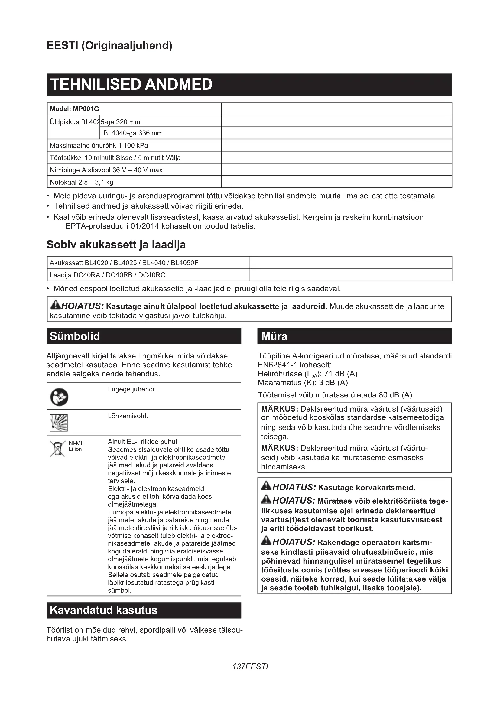- Mõned eespool loetletud akukassetid ja -laadijad ei pruugi olla teie riigis saadaval. HOIATUS: Kasutage ainult ülalpool loetletud akukassette ja laadureid. Muude akukassettide ja laadurite kasutamine võib tekitada vigastusi ja/või tulekahju. Sümbolid Alljärgnevalt kirjeldatakse tingmärke, mida võidakse seadmetel kasutada. Enne seadme kasutamist tehke endale selgeks nende tähendus. Lugege juhendit. Lõhkemisoht. Ni-MH Li-ion Ainult EL-i riikide puhul Seadmes sisalduvate ohtlike osade tõttu võivad elektri- ja elektroonikaseadmete jäätmed, akud ja patareid avaldada negatiivset mõju keskkonnale ja inimeste tervisele. Elektri- ja elektroonikaseadmeid ega akusid ei tohi kõrvaldada koos olmejäätmetega! Euroopa elektri- ja elektroonikaseadmete jäätmete, akude ja patareide ning nende jäätmete direktiivi ja riiklikku õigusesse üle- võtmise kohaselt tuleb elektri- ja elektroo- nikaseadmete, akude ja patareide jäätmed koguda eraldi ning viia eraldiseisvasse olmejäätmete kogumispunkti, mis tegutseb kooskõlas keskkonnakaitse eeskirjadega. Sellele osutab seadmele paigaldatud läbikriipsutatud ratastega prügikasti sümbol. Kavandatud kasutus Tööriist on mõeldud rehvi, spordipalli või väikese täispu- hutava ujuki täitmiseks. Müra Tüüpiline A-korrigeeritud müratase, määratud standardi EN62841-1 kohaselt: Helirõhutase (L