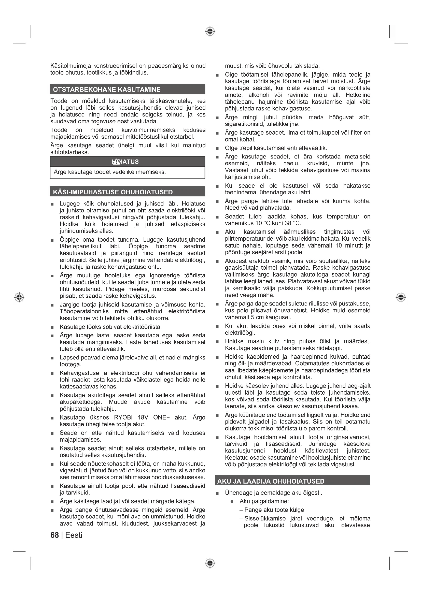 Ŷ Lugege kõik ohuhoiatused ja juhised läbi. Hoiatuse ja juhiste eiramise puhul on oht saada elektrilööki või raskeid kehavigastusi ning/või põhjustada tulekahju. Hoidke kõik hoiatused ja juhised edaspidiseks juhindumiseks alles. Ŷ Õppige oma toodet tundma. Lugege kasutusjuhend tähelepanelikult läbi. Õppige tundma seadme kasutusalasid ja piiranguid ning nendega seotud eriohtusid. Selle juhise järgimine vähendab elektrilöögi, tulekahju ja raske kehavigastuse ohtu. Ŷ Ärge muutuge hooletuks ega ignoreerige tööriista ohutusnõudeid, kui te seadet juba tunnete ja olete seda tihti kasutanud. Pidage meeles, murdosa sekundist piisab, et saada raske kehavigastus. Ŷ Järgige tootja juhiseid kasutamise ja võimsuse kohta. Tööoperatsiooniks mitte ettenähtud elektritööriista kasutamine võib tekitada ohtliku olukorra. Ŷ Kasutage tööks sobivat elektritööriista. Ŷ Ärge lubage lastel seadet kasutada ega laske seda kasutada mängimiseks. Laste läheduses kasutamisel tuleb olla eriti ettevaatlik. Ŷ Lapsed peavad olema järelevalve all, et nad ei mängiks tootega. Ŷ Kehavigastuse ja elektrilöögi ohu vähendamiseks ei tohi raadiot lasta kasutada väikelastel ega hoida neile kättesaadavas kohas. Ŷ Kasutage akutoitega seadet ainult selleks ettenähtud akupakettidega. Muude akude kasutamine võib põhjustada tulekahju. Ŷ Kasutage üksnes RYOBI 18V ONE+ akut. Ärge kasutage ühegi teise tootja akut. Ŷ Seade on ette nähtud kasutamiseks vaid koduses majapidamises. Ŷ Kasutage seadet ainult selleks otstarbeks, millele on osutatud selles kasutusjuhendis. Ŷ Kui seade nõuetekohaselt ei tööta, on maha kukkunud, vigastatud, jäetud õue või on kukkunud vette, siis andke see remontimiseks oma lähimasse hoolduskeskusesse. Ŷ Kasutage ainult tootja poolt ette nähtud lisaseadiseid ja tarvikuid. Ŷ Ärge käsitsege laadijat või seadet märgade kätega. Ŷ Ärge pange õhutusavadesse mingeid esemeid. Ärge kasutage seadet, kui mõni ava on ummistunud. Hoidke avad vabad tolmust, kiududest, juuksekarvadest ja muust, mis võib õhuvoolu takistada. Ŷ Olge töötamisel tähelepanelik, jägige, mida teete ja kasutage tööriistaga töötamisel tervet mõistust. Ärge kasutage seadet, kui olete väsinud või narkootiliste ainete, alkoholi või ravimite mõju all. Hetkeline tähelepanu hajumine tööriista kasutamise ajal võib põhjustada raske kehavigastuse. Ŷ Ärge mingil juhul püüdke imeda hõõguvat sütt, sigaretikonisid, tuletikke jne. Ŷ Ärge kasutage seadet, ilma et tolmukuppel või filter on omal kohal. Ŷ Olge trepil kasutamisel eriti ettevaatlik. Ŷ Ärge kasutage seadet, et ära koristada metalseid esemeid, näiteks naelu, kruvisid, münte jne. Vastasel juhul võib tekkida kehavigastuse või masina kahjustamise oht. Ŷ Kui seade ei ole kasutusel või seda hakatakse teenindama, ühendage aku lahti. Ŷ Ärge pange lahtise tule lähedale või kuuma kohta. Need võivad plahvatada. Ŷ Seadet tuleb laadida kohas, kus temperatuur on vahemikus 10 °C kuni 38 °C. Ŷ Aku kasutamisel äärmuslikes tingimustes või piirtemperatuuridel võib aku lekkima hakata. Kui vedelik satub nahale, loputage seda vähemalt 10 minutit ja pöörduge seejärel arsti poole. Ŷ Akudest eraldub vesinik, mis võib süüteallika, näiteks gaasisüütaja toimel plahvatada. Raske kehavigastuse vältimiseks ärge kasutage akutoitega seadet kunagi lahtise leegi läheduses. Plahvatavast akust võivad tükid ja kemikaalid välja paiskuda. Kokkupuutumisel peske need veega maha. Ŷ Ärge paigaldage seadet suletud riiulisse või püstakusse, kus pole piisavat õhuvahetust. Hoidke muid esemeid vähemalt 5 cm kaugusel. Ŷ Kui akut laadida õues või niiskel pinnal, võite saada elektrilöögi. Ŷ Hoidke masin kuiv ning puhas õlist ja määrdest. Kasutage seadme puhastamiseks riidelappi. Ŷ Hoidke käepidemed ja haardepinnad kuivad, puhtad ning õli- ja määrdevabad. Ootamatutes olukordades ei saa libedate käepidemete ja haardepindadega tööriista ohutult käsitseda ega kontrollida. Ŷ Hoidke käesolev juhend alles. Lugege juhend aeg-ajalt uuesti läbi ja kasutage seda teiste juhendamiseks, kes võivad seda tööriista kasutada. Kui tööriista välja laenate, siis andke käesolev kasutusjuhend kaasa. Ŷ Ärge küünitage end töötamisel liigselt välja. Hoidke end pidevalt jalgadel ja tasakaalus. Siis on teil ootamatu olukorra tekkimisel tööriista üle parem kontroll. Ŷ Kasutage hooldamisel ainult tootja originaalvaruosi, tarvikuid ja lisaseadiseid. Juhinduge käesoleva kasutusjuhendi hooldust käsitlevatest juhistest. Keelatud osade kasutamine või hooldusjuhiste eiramine võib põhjustada elektrilöögi või tekitada vigastusi.