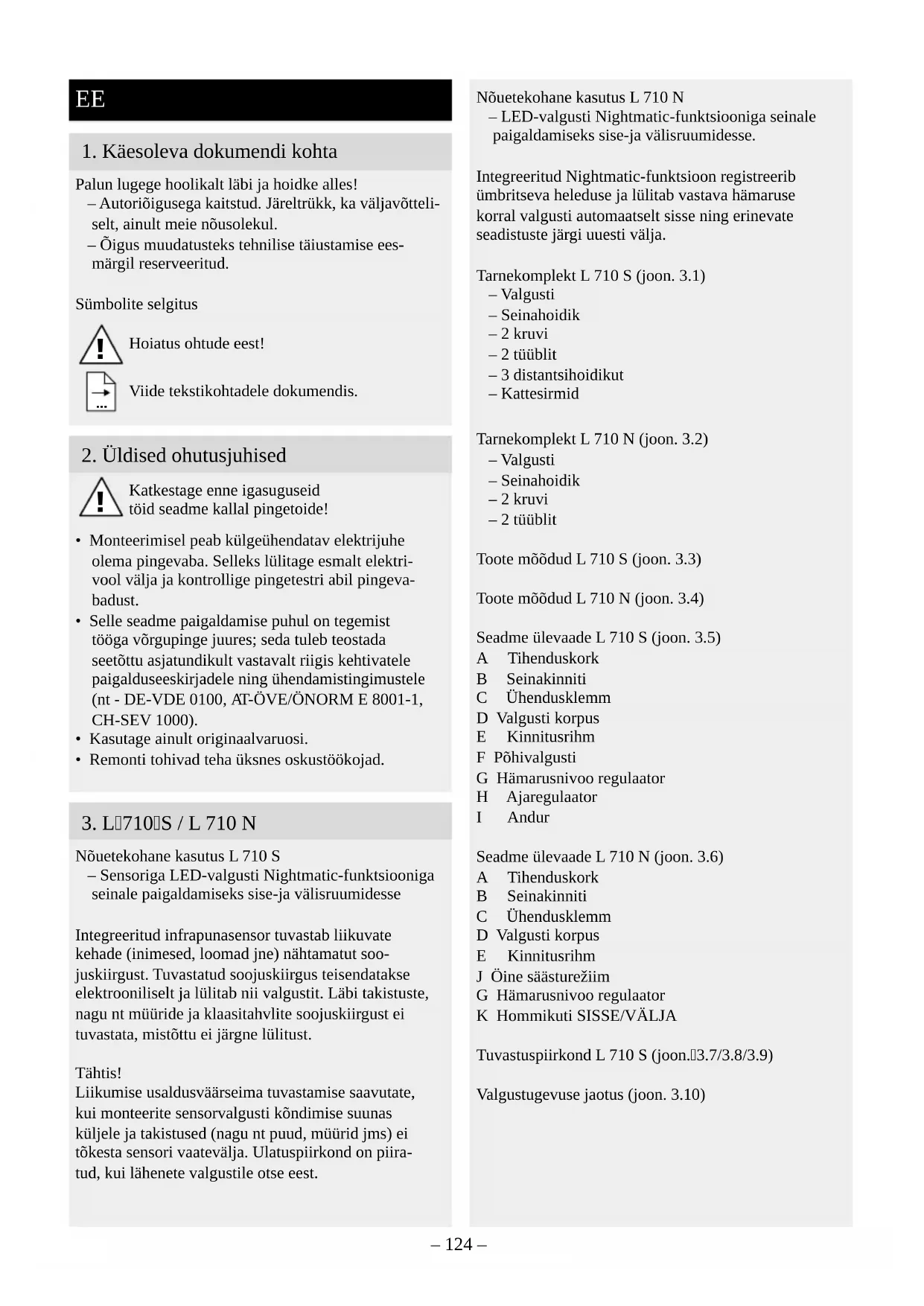 Nõuetekohane kasutus L 710 S – Sensoriga LED-valgusti Nightmatic-funktsiooniga seinale paigaldamiseks sise-ja välisruumidesse Integreeritud infrapunasensor tuvastab liikuvate kehade (inimesed, loomad jne) nähtamatut soo- juskiirgust. Tuvastatud soojuskiirgus teisendatakse elektrooniliselt ja lülitab nii valgustit. Läbi takistuste, nagu nt müüride ja klaasitahvlite soojuskiirgust ei tuvastata, mistõttu ei järgne lülitust. Tähtis! Liikumise usaldusväärseima tuvastamise saavutate, kui monteerite sensorvalgusti kõndimise suunas küljele ja takistused (nagu nt puud, müürid jms) ei tõkesta sensori vaatevälja. Ulatuspiirkond on piira- tud, kui lähenete valgustile otse eest. Nõuetekohane kasutus L 710 N – LED-valgusti Nightmatic-funktsiooniga seinale paigaldamiseks sise-ja välisruumidesse. Integreeritud Nightmatic-funktsioon registreerib ümbritseva heleduse ja lülitab vastava hämaruse korral valgusti automaatselt sisse ning erinevate seadistuste järgi uuesti välja. Tarnekomplekt L 710 S (joon. 3.1) – Valgusti – Seinahoidik – 2 kruvi – 2 tüüblit – 3 distantsihoidikut – Kattesirmid Tarnekomplekt L 710 N (joon. 3.2) – Valgusti – Seinahoidik – 2 kruvi – 2 tüüblit Toote mõõdud L 710 S (joon. 3.3) Toote mõõdud L 710 N (joon. 3.4) Seadme ülevaade L 710 S (joon. 3.5) A Tihenduskork B Seinakinniti C Ühendusklemm D Valgusti korpus E Kinnitusrihm F Põhivalgusti G Hämarusnivoo regulaator H Ajaregulaator I Andur Seadme ülevaade L 710 N (joon. 3.6) A Tihenduskork B Seinakinniti C Ühendusklemm D Valgusti korpus E Kinnitusrihm J Öine säästurežiim G Hämarusnivoo regulaator K Hommikuti SISSE/VÄLJA Tuvastuspiirkond L 710 S (joon.3.7/3.8/3.9) Valgustugevuse jaotus (joon. 3.10)– 125 –