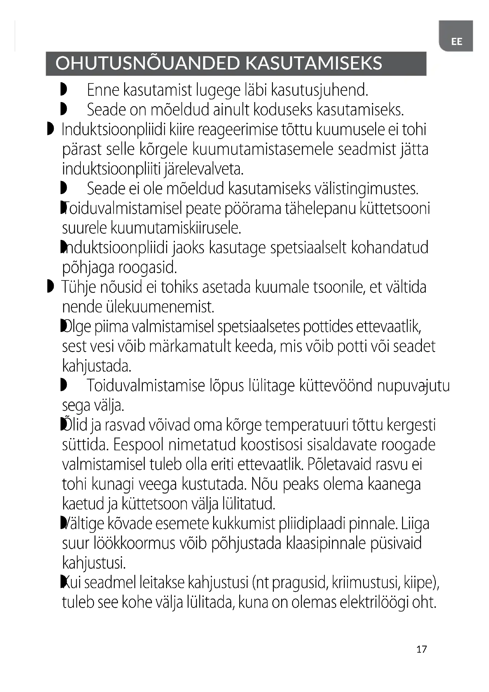 Enne kasutamist lugege läbi kasutusjuhend. Seade on mõeldud ainult koduseks kasutamiseks. Induktsioonpliidi kiire reageerimise tõttu kuumusele ei tohi pärast selle kõrgele kuumutamistasemele seadmist jätta induktsioonpliiti järelevalveta. Seade ei ole mõeldud kasutamiseks välistingimustes.