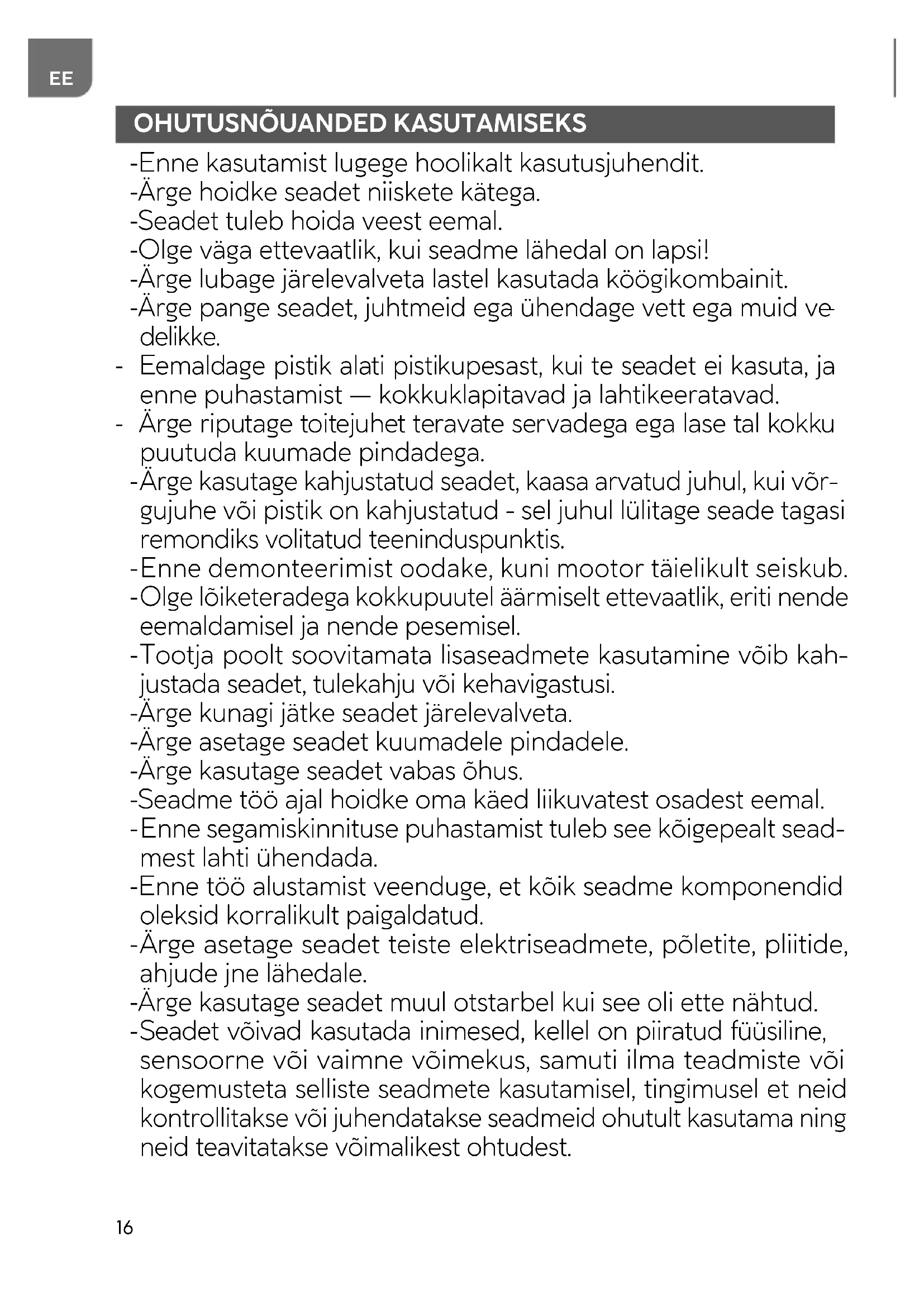 - Enne kasutamist lugege hoolikalt kasutusjuhendit. - Ärge hoidke seadet niiskete kätega. - Seadet tuleb hoida veest eemal. - Olge väga ettevaatlik, kui seadme lähedal on lapsi! - Ärge lubage järelevalveta lastel kasutada köögikombainit. - Ärge pange seadet, juhtmeid ega ühendage vett ega muid ve