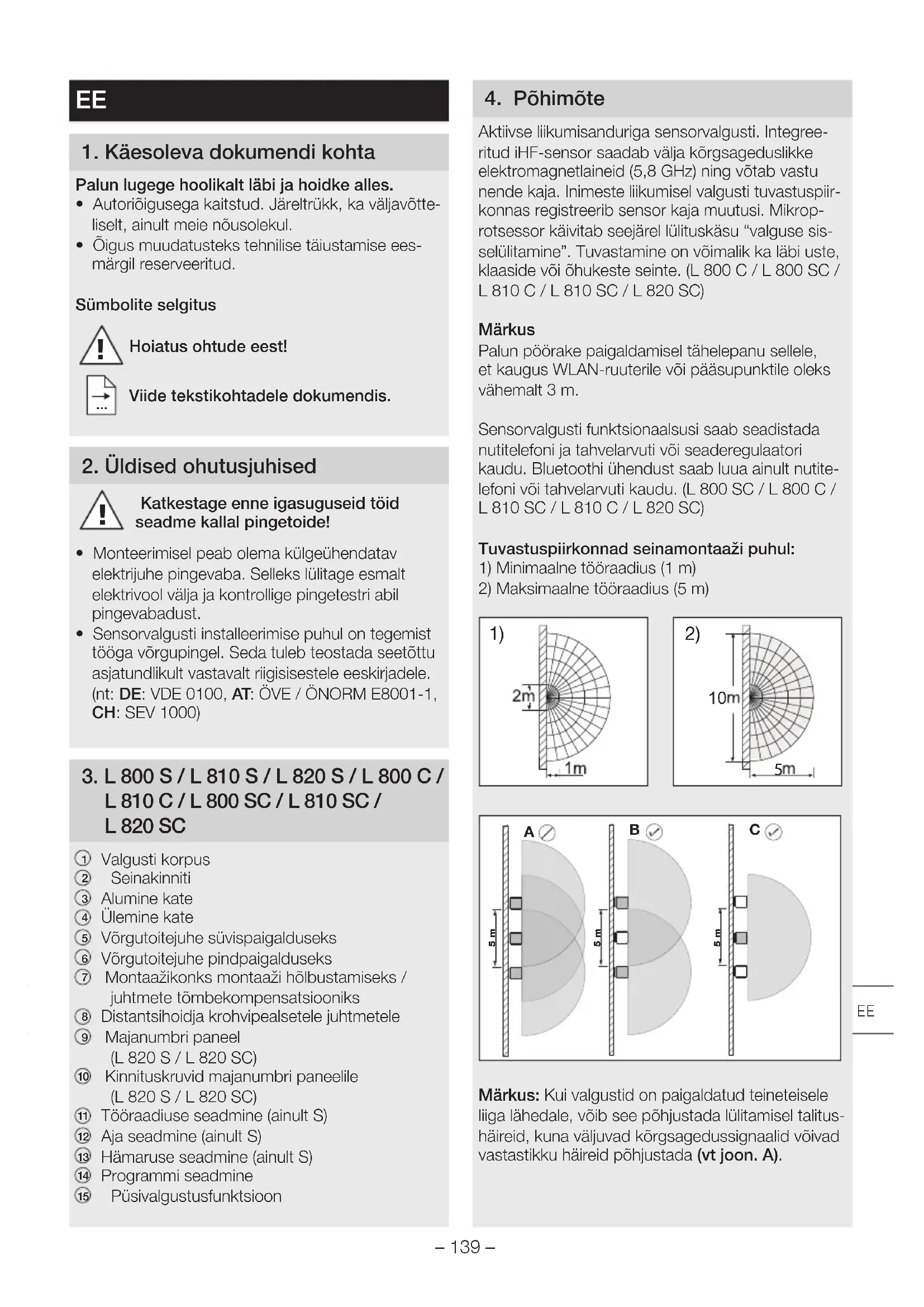 Valgusti korpus Seinakinniti Alumine kate Ülemine kate Võrgutoitejuhe süvispaigalduseks Võrgutoitejuhe pindpaigalduseks Montaažikonks montaaži hõlbustamiseks / juhtmete tõmbekompensatsiooniks Distantsihoidja krohvipealsetele juhtmetele Majanumbri paneel (L820S / L820SC) Kinnituskruvid majanumbri paneelile (L820S / L820SC) Tööraadiuse seadmine (ainult S) Aja seadmine (ainult S) Hämaruse seadmine (ainult S) Programmi seadmine Püsivalgustusfunktsioon EE– 140 – Seda viga vältida aitavad järgmised meetmed: