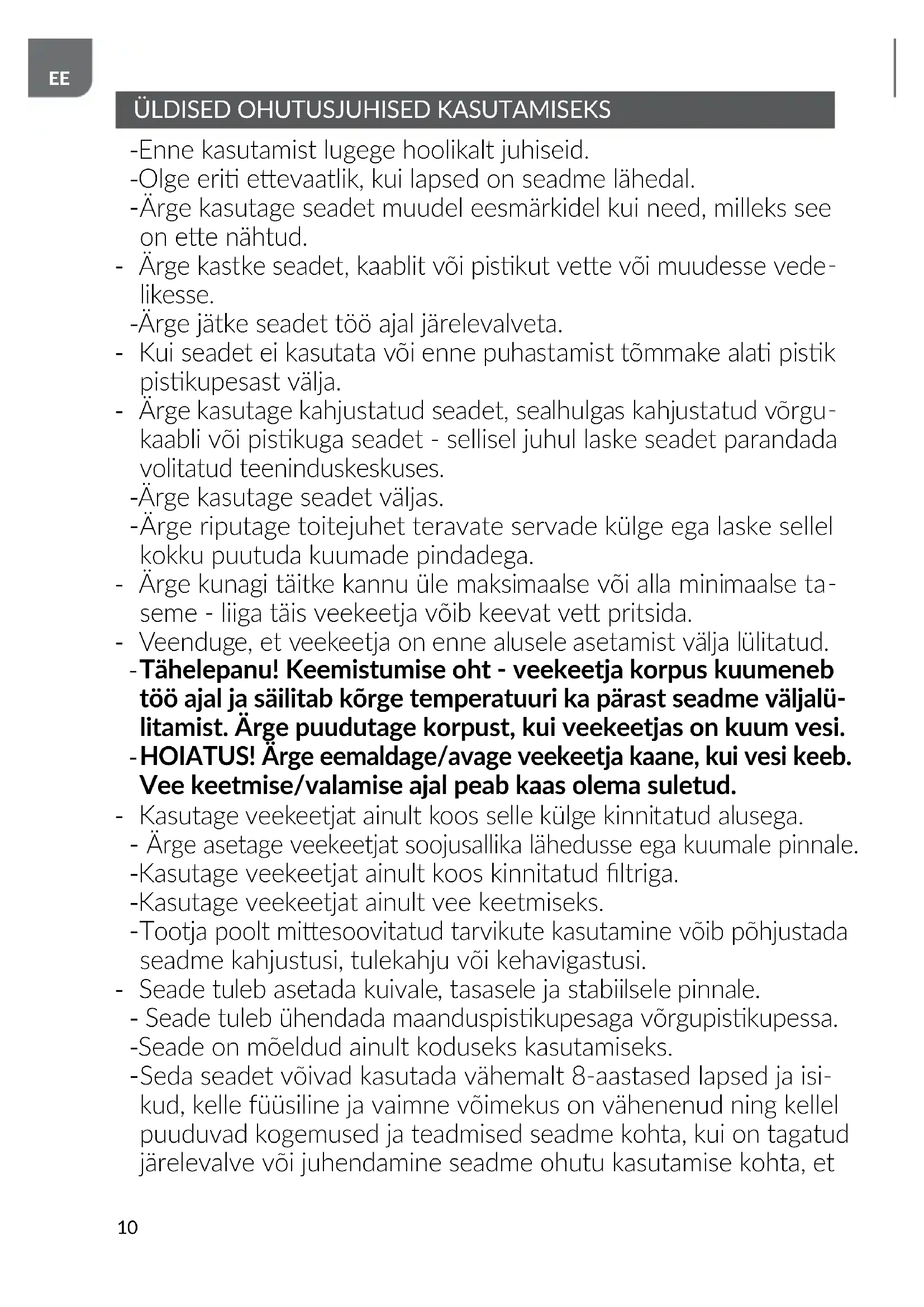 Tähelepanu! Keemistumise oht - veekeetja korpus kuumeneb töö ajal ja säilitab kõrge temperatuuri ka pärast seadme väljalü- litamist. Ärge puudutage korpust, kui veekeetjas on kuum vesi.