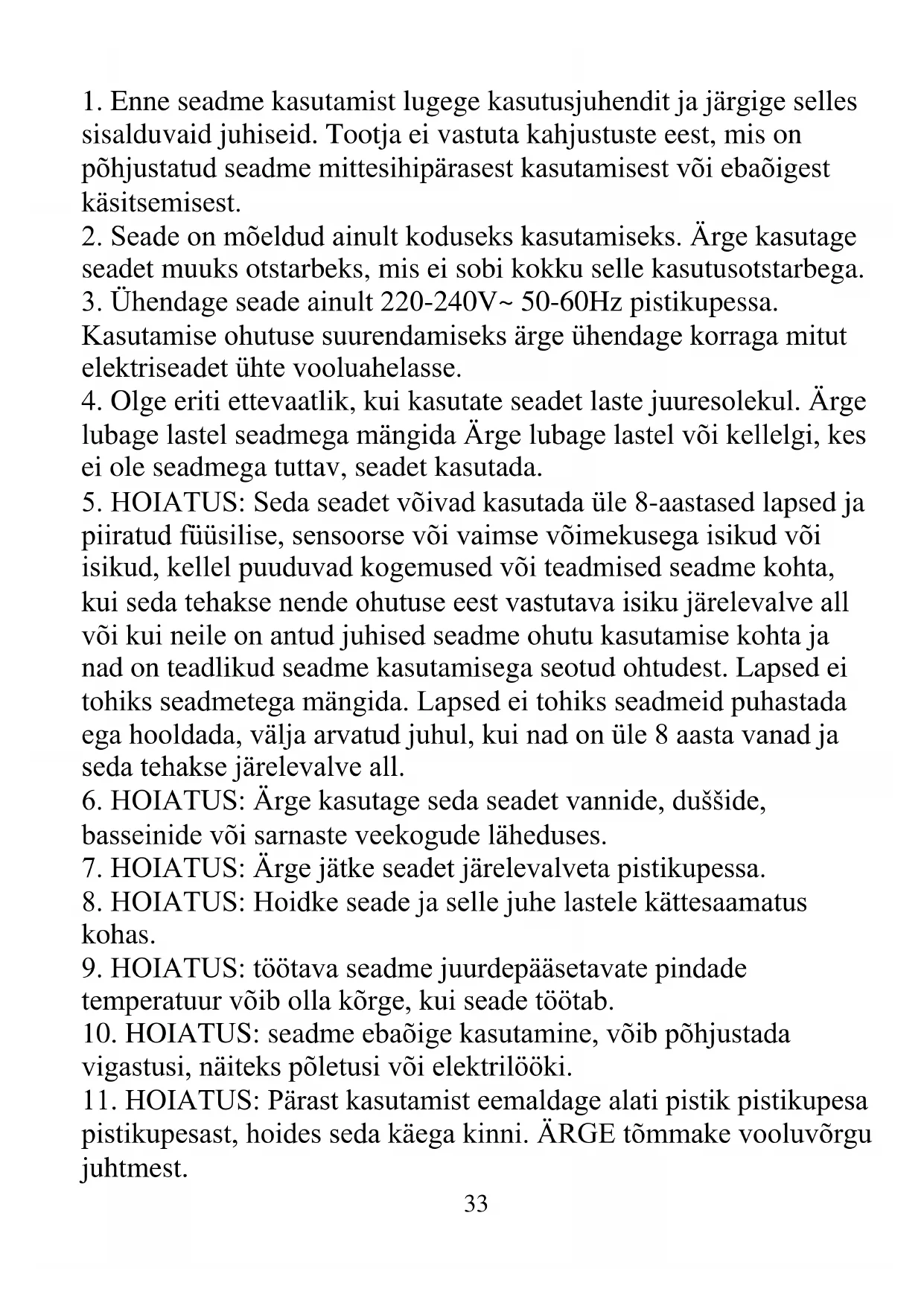 11. HOIATUS: Pärast kasutamist eemaldage alati pistik pistikupesa