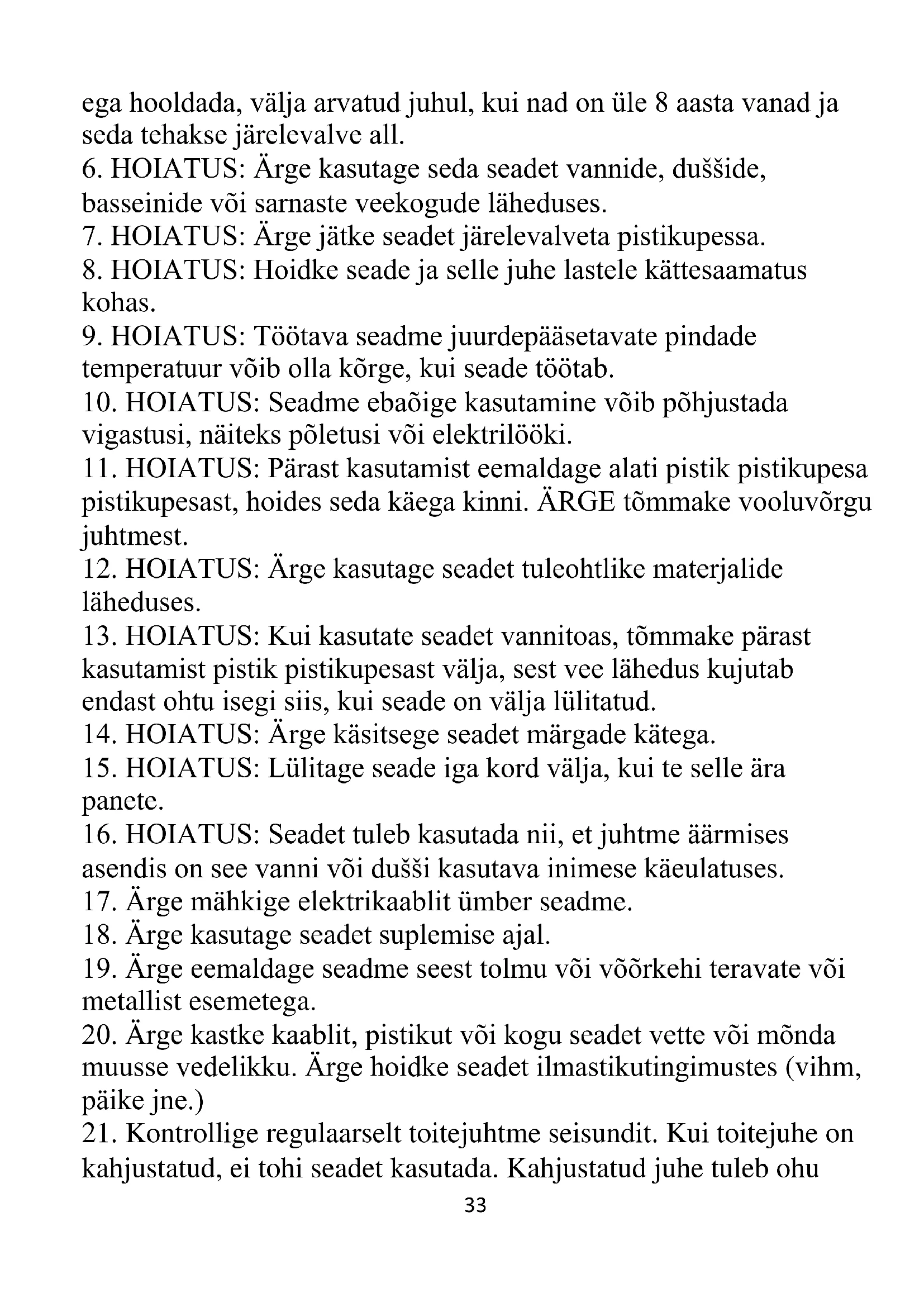 8. HOIATUS: Hoidke seade ja selle juhe lastele kättesaamatus
