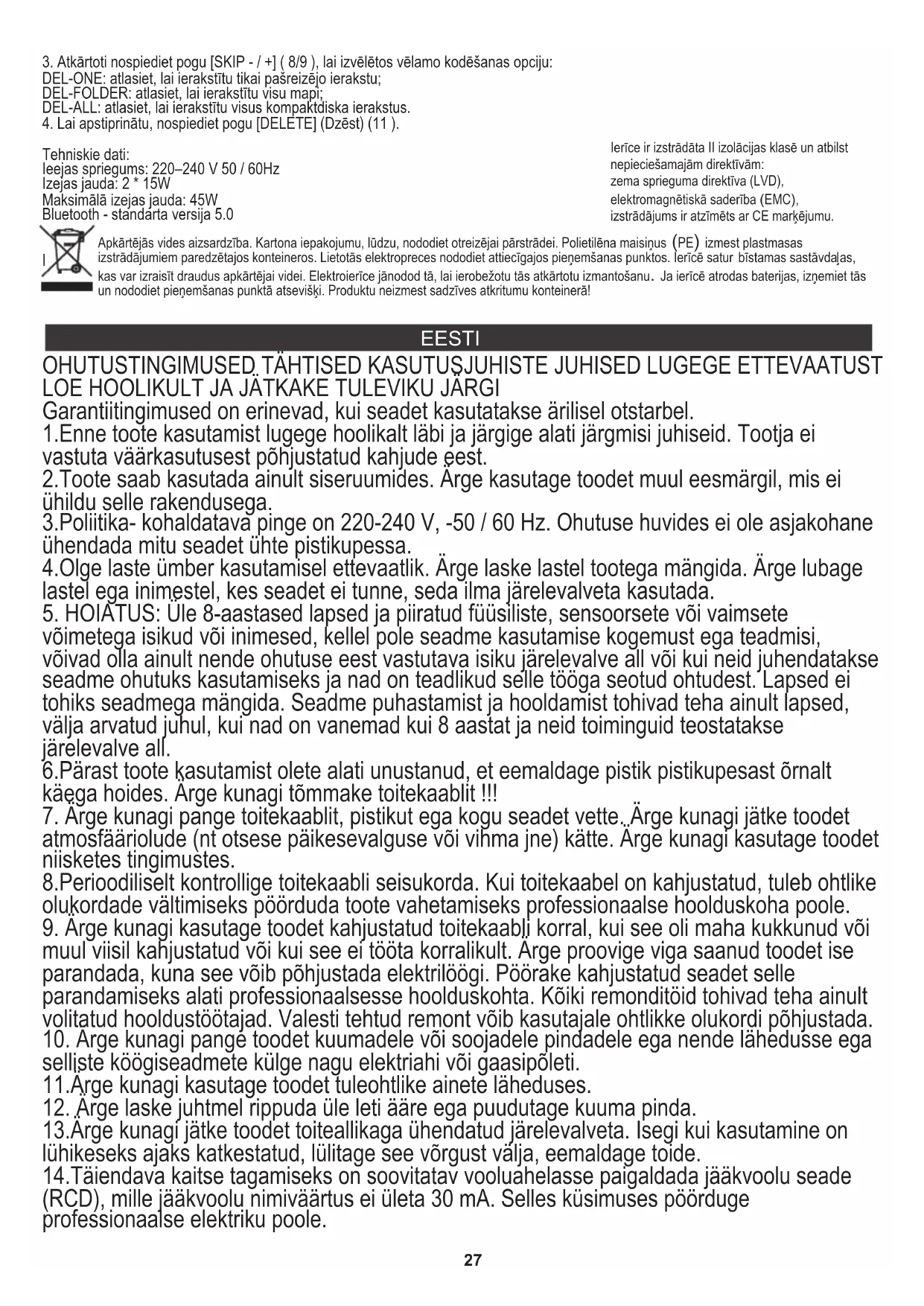 Tehnilised andmed: Sisendpinge: 220-240V 50 / 60Hz Väljundvõimsus: 2 * 15W Maksimaalne väljundvõimsus: 45W Bluetooth - standardversioon 5.0 Seade on valmistatud II ohutusklassis ja ei vaja maandamist. Seade on vastavuses direktiivide nõudmistega: Madalpinge elektriseade (LVD) Elektromagneetiline ühilduvus (EMC) Toode on märgistatud andmeplaadil CE märgiga Hoolitse keskkonnakaitse eest. Kartongist pakendid vii makulatuuri. Kilekotid (PE) viska kasutatud plastiku jaoks ettenähtud mahutitesse. Kasutatud seadmed vii selleks ettenähtud kogumispunktidesse, sest seadmes leiduvad ohtlikud elemendid võivad olla kahjulikud keskkonnale. Elektriseadmed tuleb anda nii ära, et seadet ei saaks enam uuesti kasutada. Kui seadmes on patareid, tuleb need välja võtta ja anda eraldi kogumispunkti. Seadet ei tohi visata olmejäätmete konteineritesse!! ROMÂNĂ CONDIȚII DE SIGURANȚĂ INSTRUCȚIUNI IMPORTANTE PRIVIND SIGURANȚA DE UTILIZARE VĂ RUGĂM CITIȚI ÎNCETARE ȘI Păstrați-o pentru referință viitoare Condițiile de garanție sunt diferite, dacă dispozitivul este utilizat în scop comercial.