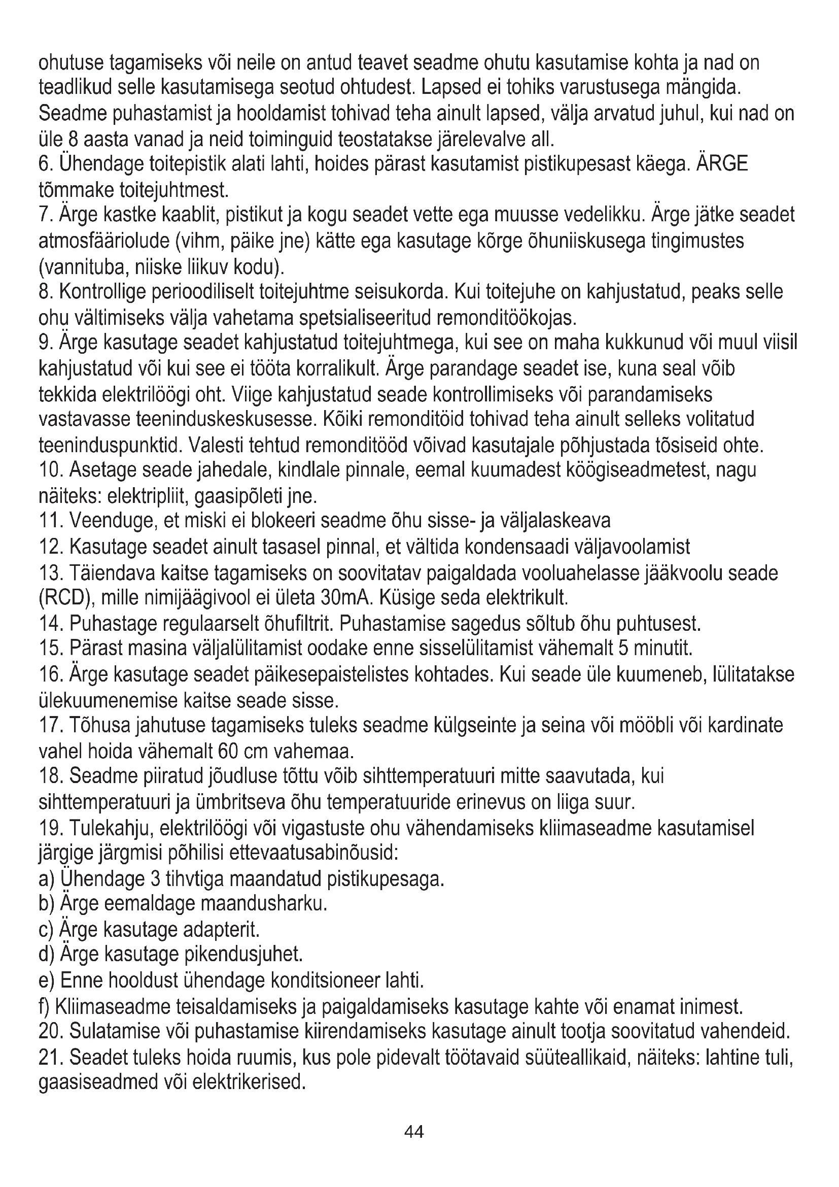 19. Tulekahju, elektrilöögi või vigastuste ohu vähendamiseks kliimaseadme kasutamisel