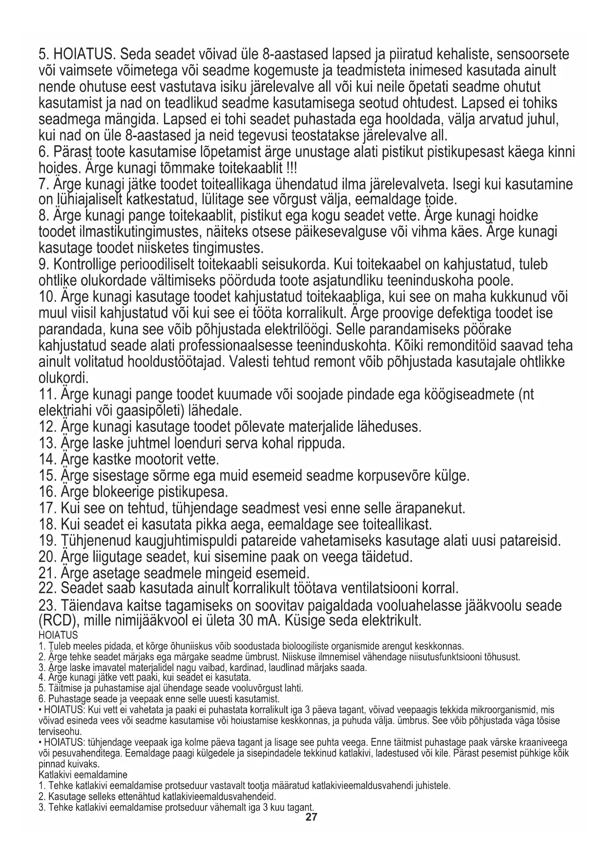 lubage lastel ega inimestel, kes seadet ei tunne, seda ilma järelevalveta kasutada.27