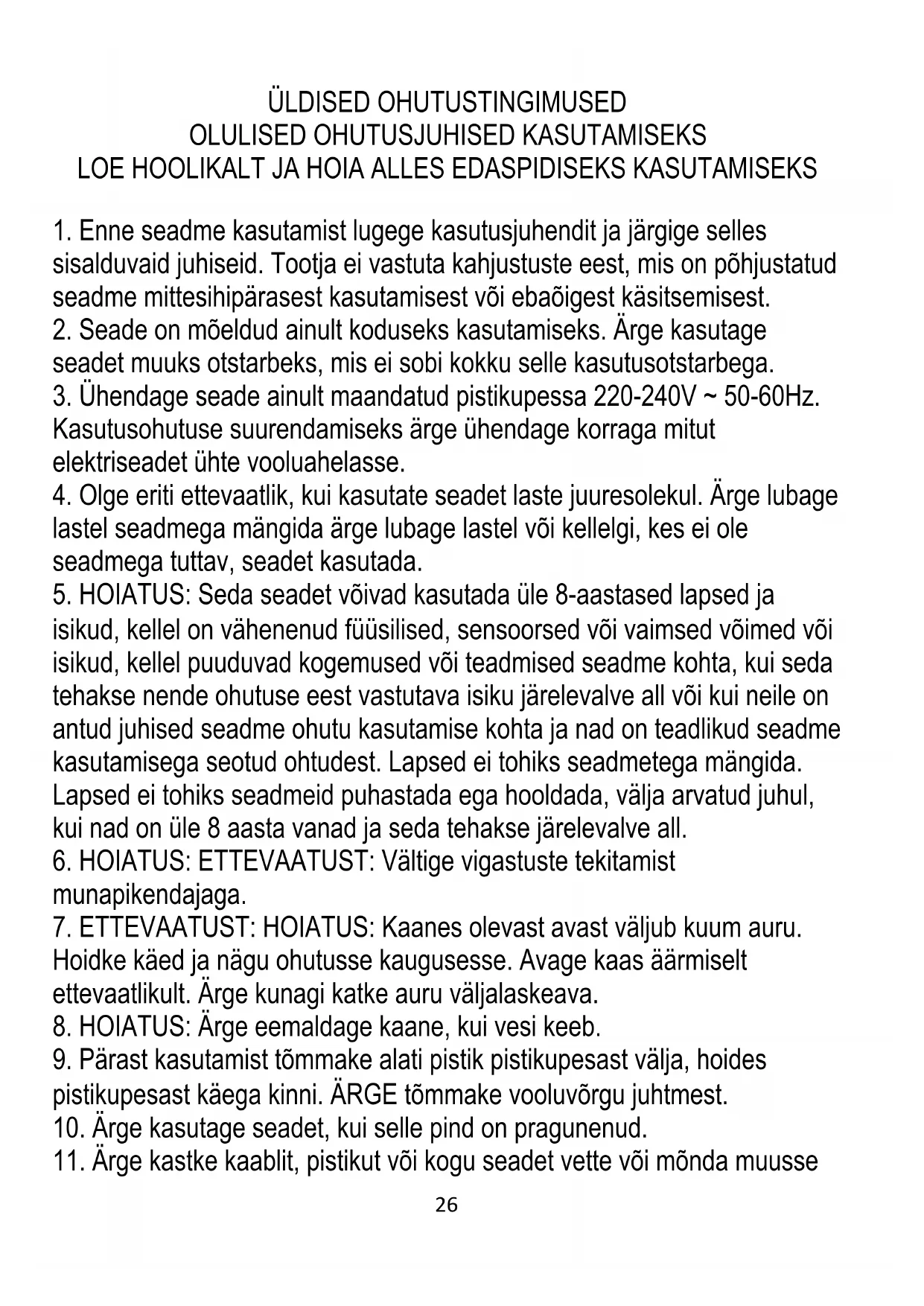 11. Ärge kastke kaablit, pistikut või kogu seadet vette või mõnda muusse27