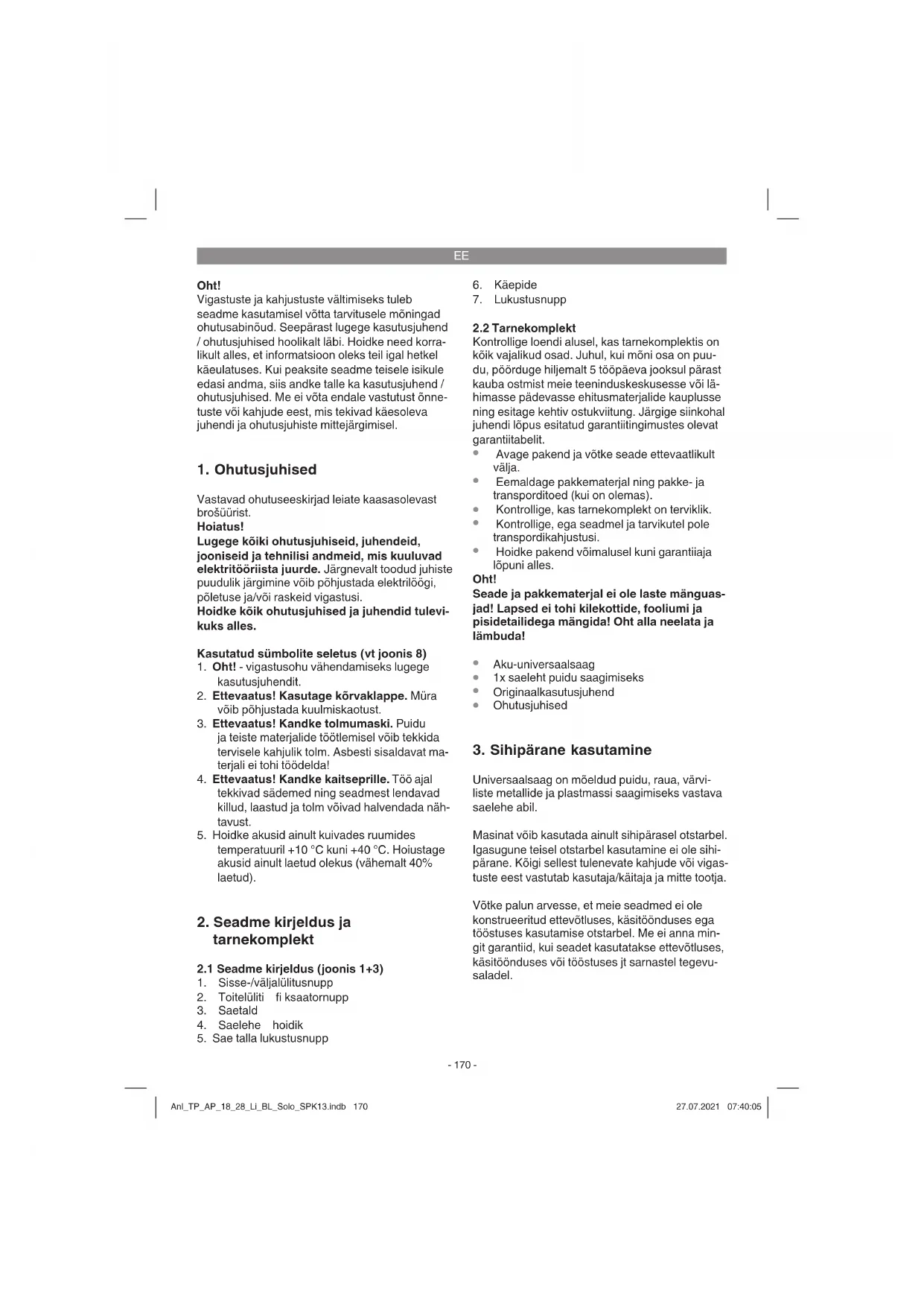 Universaalsaag on mõeldud puidu, raua, värvi- liste metallide ja plastmassi saagimiseks vastava saelehe abil. Masinat võib kasutada ainult sihipärasel otstarbel. Igasugune teisel otstarbel kasutamine ei ole sihi- pärane. Kõigi sellest tulenevate kahjude või vigas- tuste eest vastutab kasutaja/käitaja ja mitte tootja. Võtke palun arvesse, et meie seadmed ei ole konstrueeritud ettevõtluses, käsitöönduses ega tööstuses kasutamise otstarbel. Me ei anna min- git garantiid, kui seadet kasutatakse ettevõtluses, käsitöönduses või tööstuses jt sarnastel tegevu- saladel. Anl_TP_AP_18_28_Li_BL_Solo_SPK13.indb 170Anl_TP_AP_18_28_Li_BL_Solo_SPK13.indb 170 27.07.2021 07:40:0527.07.2021 07:40:05EE