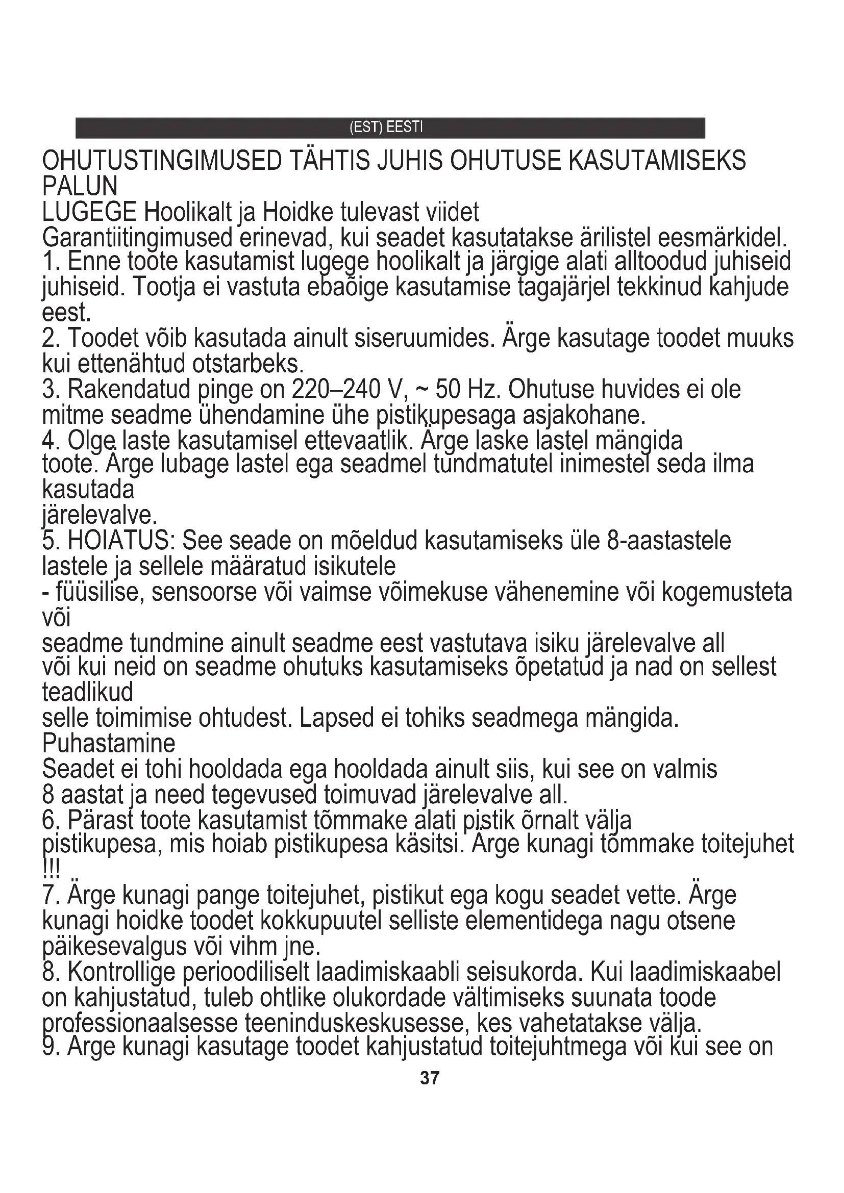 kasutada ainult täiskasvanute järelevalve all, 8–14-aastased noorukid võivad seadet ohutult kasutada täiskasvanute järelevalve all või pärast seadme ohutuks kasutamiseks õpetamist. ja mõistke sellega seotud ohtusid, inimesed, kellel on piiratud füüsilised, sensoorsed või vaimsed võimed või puuduvad kogemused ja teadmised, saavad toodet kasutada pärast seda, kui on neile seadme kasutamise kohta piisava järelevalve andnud või juhendanud ja sellega seotud ohtudest aru saanud.