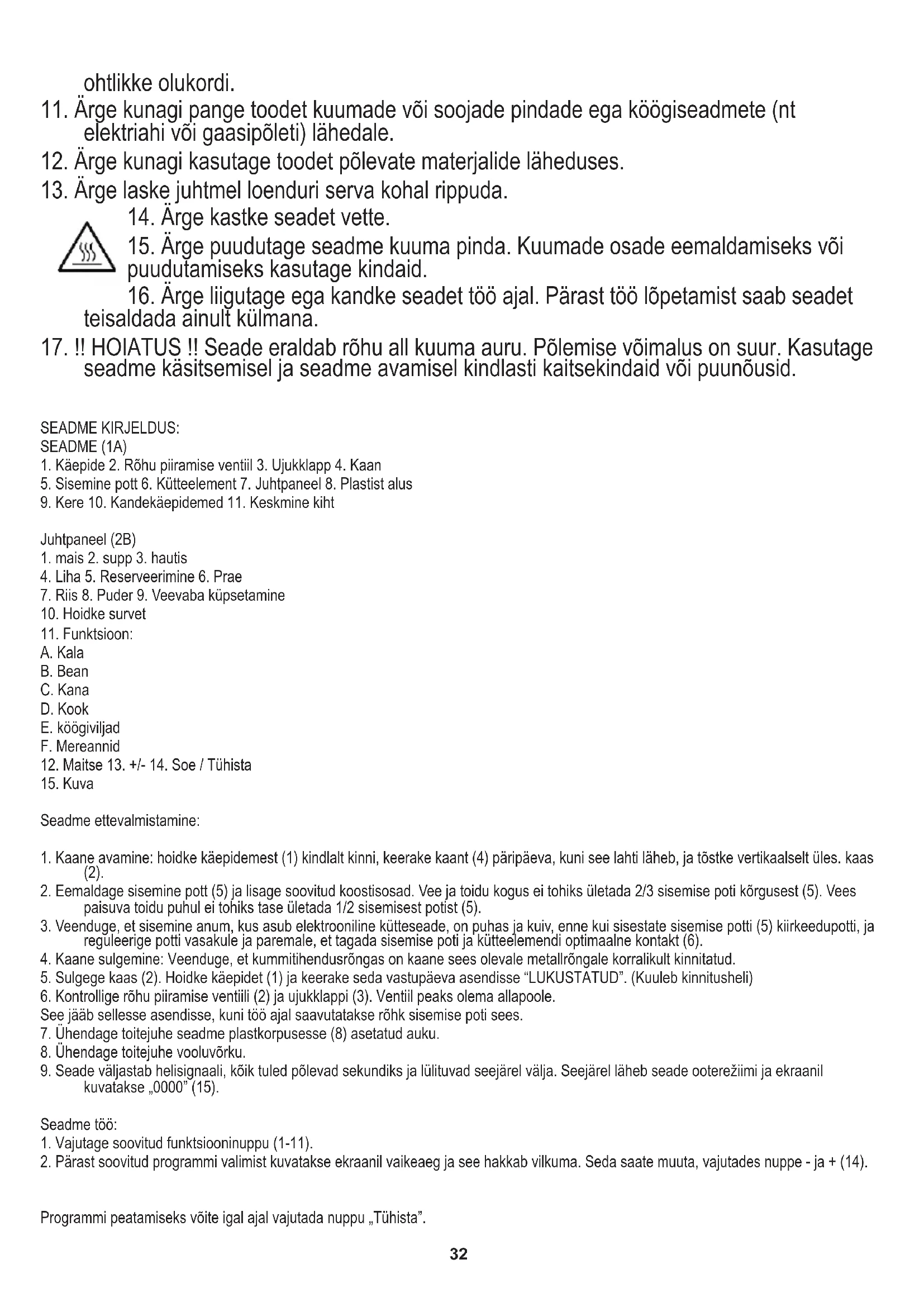 17. !! HOIATUS !! Seade eraldab rõhu all kuuma auru. Põlemise võimalus on suur. Kasutage