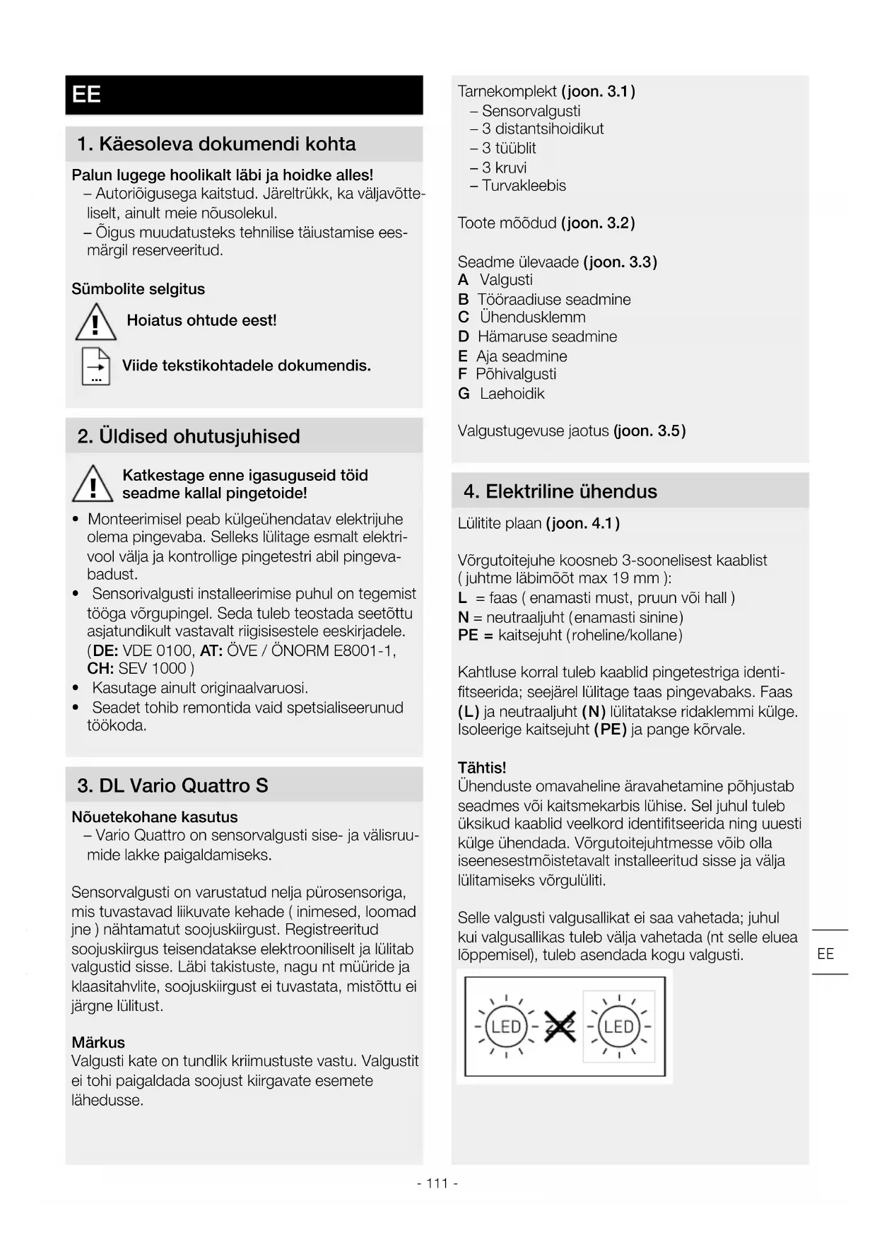 Nõuetekohane kasutus – Vario Quattro on sensorvalgusti sise- ja välisruu- mide lakke paigaldamiseks. Sensorvalgusti on varustatud nelja pürosensoriga, mis tuvastavad liikuvate kehade ( inimesed, loomad jne ) nähtamatut soojuskiirgust. Registreeritud soojuskiirgus teisendatakse elektrooniliselt ja lülitab valgustid sisse. Läbi takistuste, nagu nt müüride ja klaasitahvlite, soojuskiirgust ei tuvastata, mistõttu ei järgne lülitust. Märkus Valgusti kate on tundlik kriimustuste vastu. Valgustit ei tohi paigaldada soojust kiirgavate esemete lähedusse.