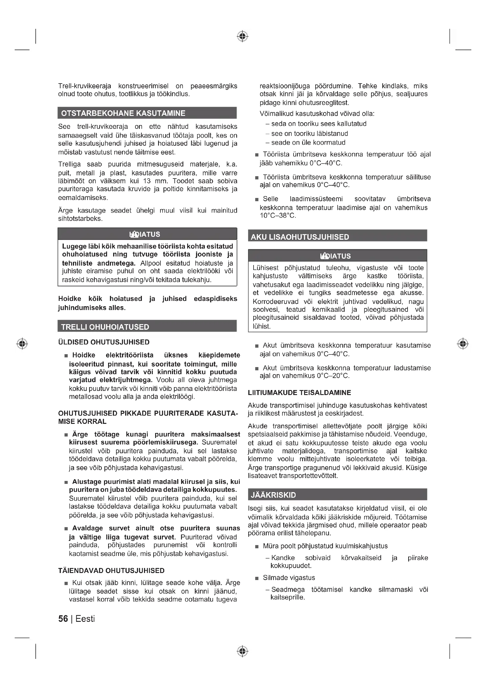 ■ Kui otsak jääb kinni, lülitage seade kohe välja. Ärge lülitage seadet sisse kui otsak on kinni jäänud, vastasel korral võib tekkida seadme ootamatu tugeva reaktsioonijõuga pöördumine. Tehke kindlaks, miks otsak kinni jäi ja kõrvaldage selle põhjus, sealjuures pidage kinni ohutusreeglitest. Võimalikud kasutuskohad võivad olla: – seda on tooriku sees kallutatud – see on tooriku läbistanud – seade on üle koormatud ■ Tööriista ümbritseva keskkonna temperatuur töö ajal jääb vahemikku 0°C‒40°C. ■ Tööriista ümbritseva keskkonna temperatuur säilituse ajal on vahemikus 0°C‒40°C. ■ Selle laadimissüsteemi soovitatav ümbritseva keskkonna temperatuur laadimise ajal on vahemikus 10°C‒38°C. AKU LISAOHUTUSJUHISED HOIATUS Lühisest põhjustatud tuleohu, vigastuste või toote kahjustuste vältimiseks ärge kastke tööriista, vahetusakut ega laadimisseadet vedelikku ning jälgige, et vedelikke ei tungiks seadmetesse ega akusse. Korrodeeruvad või elektrit juhtivad vedelikud, nagu soolvesi, teatud kemikaalid ja pleegitusained või pleegitusaineid sisaldavad tooted, võivad põhjustada lühist. ■ Akut ümbritseva keskkonna temperatuur kasutamise ajal on vahemikus 0°C‒40°C. ■ Akut ümbritseva keskkonna temperatuur ladustamise ajal on vahemikus 0°C‒20°C. LIITIUMAKUDE TEISALDAMINE Akude transportimisel juhinduge kasutuskohas kehtivatest ja riiklikest määrustest ja eeskirjadest. Akude transportimisel allettevõtjate poolt järgige kõiki spetsiaalseid pakkimise ja tähistamise nõudeid. Veenduge, et akud ei satu kokkupuutesse teiste akude ega voolu juhtivate materjalidega, transportimise ajal kaitske klemme voolu mittejuhtivate isoleerkatete või teibiga. Ärge transportige pragunenud või lekkivaid akusid. Küsige lisateavet transportettevõttelt. JÄÄKRISKID Isegi siis, kui seadet kasutatakse kirjeldatud viisil, ei ole võimalik kõrvaldada kõiki jääkriskide mõjureid. Töötamise ajal võivad tekkida järgmised ohud, millele operaator peab pöörama erilist tähelepanu. ■ Müra poolt põhjustatud kuulmiskahjustus – Kandke sobivaid kõrvakaitseid ja piirake kokkupuudet. ■ Silmade vigastus – Seadmega töötamisel kandke silmamaski või kaitseprille.57 Eesti |