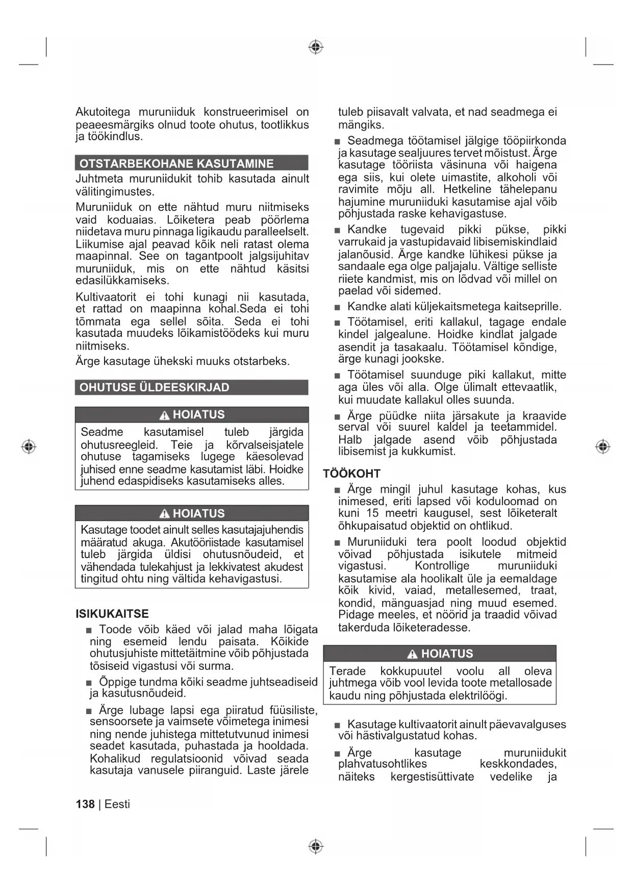 RASHOID ■ Lugege aku ja akulaadija komplektis olevad ohutusjuhised läbi ja tehke need endale selgeks. Selle nõude eiramine võib põhjustada elektrilööki, tulekahju ja muid ohtlikke olukordi. Hoidke kõiki juhiseid ühes kindlas kohas, et saaksite neid tulevikus lugeda. ■ Akutoitega seadmeid ei pea pingestamiseks vooluvõrgu pistikupessa ühendama – need on pinge all kogu aeg. Kui seadet ei kasutata, eemaldage sellelt lahklüliti võti. ■ Enne reguleerimist, hooldamist või lõigatavast materjalist puhastamist võtke akupakett välja. ■ Enne akupaketi sissepanekut võtke lülitusvõti välja. ■ Akupaketti tohib laadida ainult tootja poolt ettenähtud laadijaga. Akupaketiga mittesobiva laadija kasutamine võib põhjustada tuleohtu. Kasutage akupaketi laadimiseks ainult juhendis mainitud laadijat. ■ Kasutage ainult seda akupaketti, mis on sellele seadmele ette nähtud. Muude akupakettide kasutamise korral võib tekkida tulekahju, elektrilöögi või kehavigastuse oht. ■ Sel ajal kui akupakett ei ole kasutusel, hoidke seda eemal metallesemetest nagu kirjaklambrid, mündid, võtmed, naelad, kruvid ja muudest väikestest metallobjektidest, mis võivad akuklemmid lühistada. Akupaketi klemmide lühistamine võib põhjustada sädemeid, põletust, tulekahju või plahvatust. ■ Ärge jätke akusid või toiteelemente lahtise tule lähedusse või kuuma kohta. Selle juhise järgimine vähendab plahvatuse ja võimaliku kehavigastuse ohtu. ■ Ärge akupaketti avage ega osadeks lahutage. Vabanev elektrolüüt on korrodeeriv ja võib põhjustada silma- ja nahavigastusi. Allaneelamisel on see mürgine. ■ Kaitske akut niiskuse ja vee vastu. Ärge laadige akut niiskes või märjas kohas. Selle reegli järgimine vähendab elektrilöögi ohtu. ■ Aku vigastamise või ebaõige kasutamise korral võib eralduda gaase. Kaebuste korral minge värske õhu kätte ja kutsuge arstiabi. Gaasid võivad ärritada hingamissüsteemi. ■ Ärge jätke akupaketti sõidukisse kuuma või külma kätte. ■ Ärge püüdke akut põletamise teel hävitada. ■ Aku vale kasutamise korral võib akuvedelik välja voolata - vältige sellega kokkupuudet. Akuvedeliku nahale sattumisel peske see veega maha. Akuvedeliku silma sattumisel pöörduge arsti poole. Väljapritsiv akuvedelik võib tekitada nahaärritust või -põletust. MURUNIIDUKI OHUTUSEESKIRJAD ■ Enne kasutamist kontrollige välise vaatluse teel, et lõiketerad, lõiketerade poldid ega kinnitid pole kulunud või vigastatud. ■ Ärakulunud ja vigastatud lõiketerad ning poldid tuleb asendada komplektis, et säilitada tasakaalustatus. ■ Seadme lõiketera on terav. Olge nende paigaldamise, asendamise ja kinnituspoldi kinnituse kontrollimise ajal väga ettevaatlik ning kandke tugevdatud kaitsekindaid. ■ Pöörduge vigastatud ja loetamatute kleebiste asendamiseks volitatud hoolduskeskuse poole. 139 Eesti