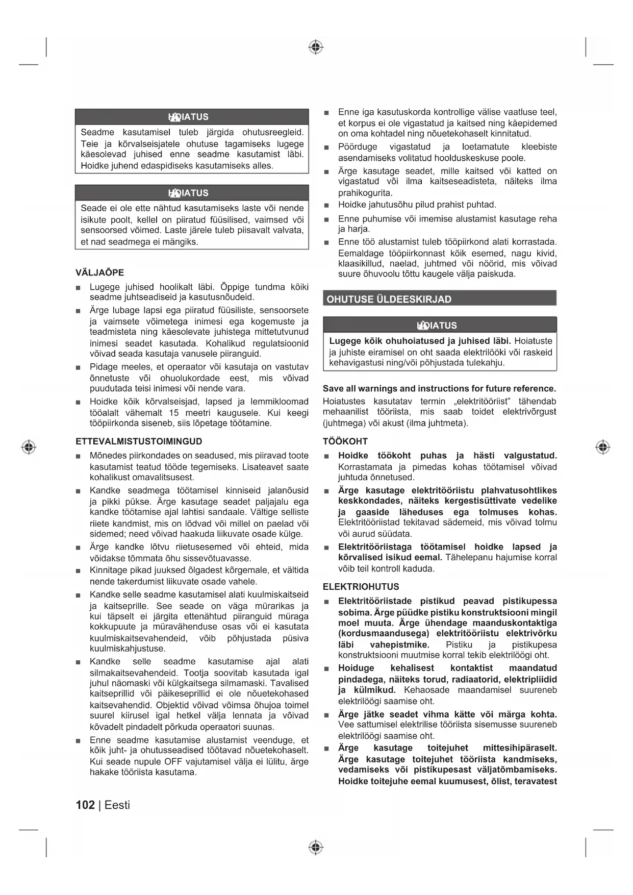 Save all warnings and instructions for future reference. Hoiatustes kasutatav termin „elektritööriist” tähendab mehaanilist tööriista, mis saab toidet elektrivõrgust (juhtmega) või akust (ilma juhtmeta). TÖÖKOHT Ŷ Hoidke töökoht puhas ja hästi valgustatud. Korrastamata ja pimedas kohas töötamisel võivad juhtuda õnnetused. Ŷ Ärge kasutage elektritööriistu plahvatusohtlikes keskkondades, näiteks kergestisüttivate vedelike ja gaaside läheduses ega tolmuses kohas. Elektritööriistad tekitavad sädemeid, mis võivad tolmu või aurud süüdata. Ŷ Elektritööriistaga töötamisel hoidke lapsed ja kõrvalised isikud eemal. Tähelepanu hajumise korral võib teil kontroll kaduda. ELEKTRIOHUTUS Ŷ Elektritööriistade pistikud peavad pistikupessa sobima. Ärge püüdke pistiku konstruktsiooni mingil moel muuta. Ärge ühendage maanduskontaktiga (kordusmaandusega) elektritööriistu elektrivõrku läbi vahepistmike. Pistiku ja pistikupesa konstruktsiooni muutmise korral tekib elektrilöögi oht. Ŷ Hoiduge kehalisest kontaktist maandatud pindadega, näiteks torud, radiaatorid, elektripliidid ja külmikud. Kehaosade maandamisel suureneb elektrilöögi saamise oht. Ŷ Ärge jätke seadet vihma kätte või märga kohta. Vee sattumisel elektrilise tööriista sisemusse suureneb elektrilöögi saamise oht. Ŷ Ärge kasutage toitejuhet mittesihipäraselt. Ärge kasutage toitejuhet tööriista kandmiseks, vedamiseks või pistikupesast väljatõmbamiseks. Hoidke toitejuhe eemal kuumusest, õlist, teravatestEN