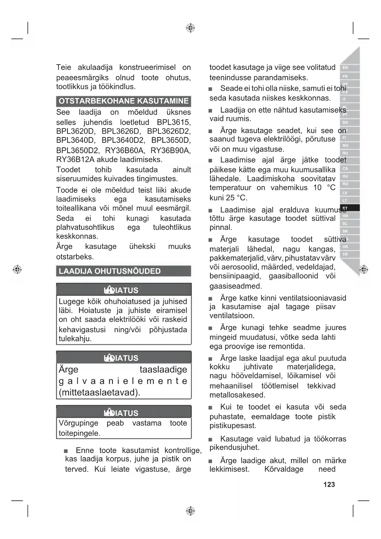 Teie akulaadija konstrueerimisel on peaeesmärgiks olnud toote ohutus, tootlikkus ja töökindlus. OTSTARBEKOHANE KASUTAMINE See laadija on mõeldud üksnes selles juhendis loetletud BPL3615, BPL3620D, BPL3626D, BPL3626D2, BPL3640D, BPL3640D2, BPL3650D, BPL3650D2, RY36B60A, RY36B90A, RY36B12A akude laadimiseks. Toodet tohib kasutada ainult siseruumides kuivades tingimustes. Toode ei ole mõeldud teist liiki akude laadimiseks ega kasutamiseks toiteallikana või mõnel muul eesmärgil. Seda ei tohi kunagi kasutada plahvatusohtlikus ega tuleohtlikus keskkonnas. Ärge kasutage ühekski muuks otstarbeks.