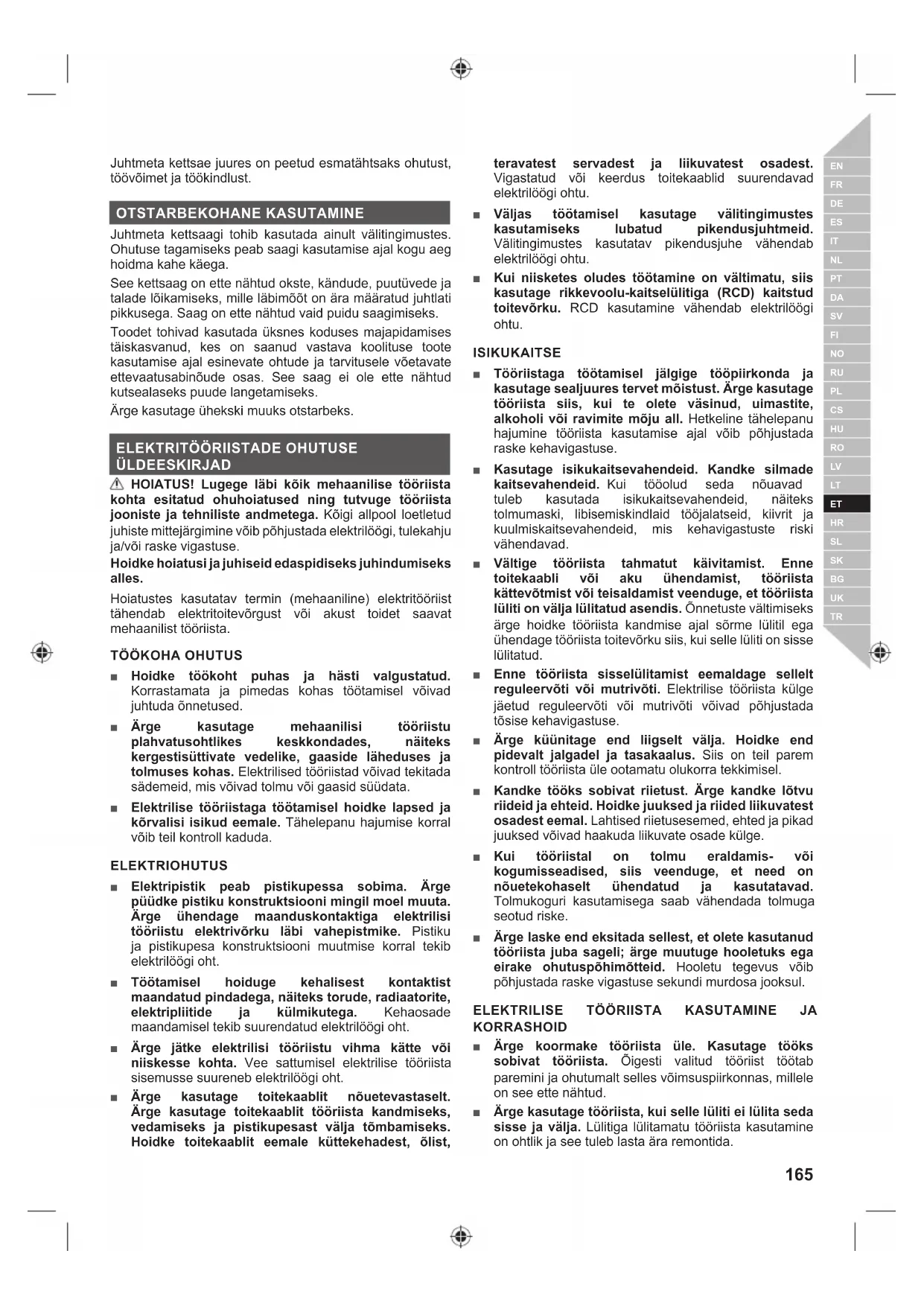 TR■ Tõmmake pistik vooluvõrgust välja ja/või eemaldage (võimalusel) tööriista aku enne iga reguleerimistööd, tarvikute vahetamist või tööriista hoiustamist. Need ennetavad turvameetmed vähendavad tööriista tahtmatu käivitumise riski. ■ Hoidke kasutuses mitteolevaid tööriistu lastele kättesaamatus kohas ja ärge lubage tööriista mittetundvaid või kasutusjuhendiga mittetutvunud isikuid tööriista kasutada. Oskamatu kasutaja käes olev tööriist on ohtlik. ■ Elektrilise tööriista ja tarvikute hooldus. Kontrollige liikuvate osade tsentreeritust, kinnitust ja vigastusi ning muude osade seisundit, mis võivad mõjustada tööriista tööd. Kui mõni osa on vigastatud, siis laske tööriist enne kasutamist ära parandada. Halvasti hooldatud tööriistad põhjustavad palju õnnetusi. ■ Hoidke lõikeriistad teravad ja puhtad. Teravate lõikeservadega ja nõuetekohaselt hooldatud lõikeriistad jäävad harvemini kinni ja neid on kergem juhtida. ■ Tööriistade, tarvikute, otsakute ja muude lisaseadmete kasutamisel juhinduge nende kasutusjuhenditest, võttes arvesse tehtavat tööd ja tööolusid. Tööoperatsiooniks mitte ettenähtud tööriista kasutamine võib tekitada ohtliku olukorra. ■ Hoidke käepidemed ja pinnad, millest saab kinni haarata, kuivad, puhtad ning õli- ja määrdevabad. Libedad käepidemed ja kinnihaaratavad pinnad ei võimalda ootamatutes olukordades tööriista ohutult käsitseda ja kontrolli all hoida.