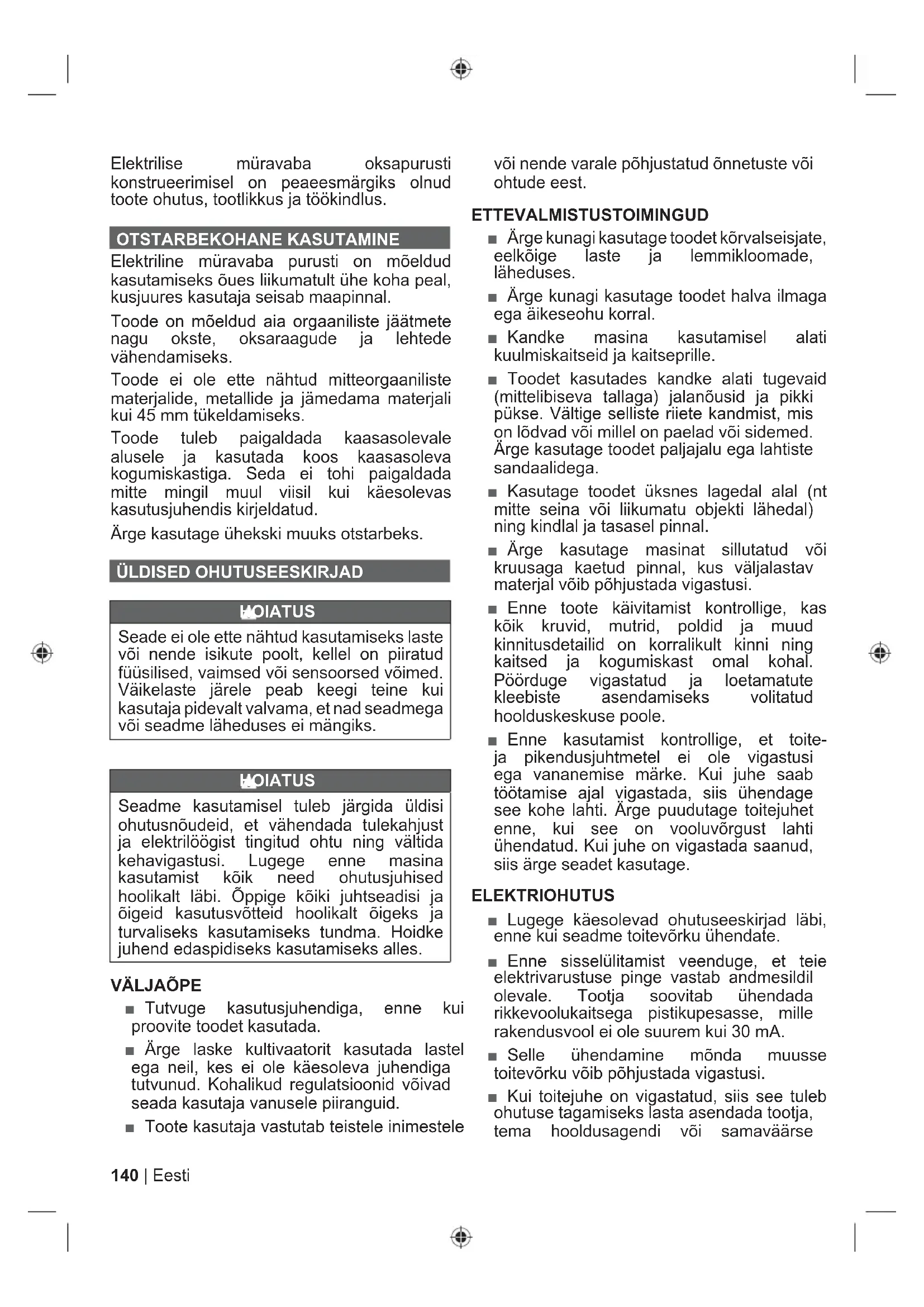 ■ Tutvuge kasutusjuhendiga, enne kui proovite toodet kasutada. ■ Ärge laske kultivaatorit kasutada lastel ega neil, kes ei ole käesoleva juhendiga tutvunud. Kohalikud regulatsioonid võivad seada kasutaja vanusele piiranguid. ■ Toote kasutaja vastutab teistele inimestele või nende varale põhjustatud õnnetuste või ohtude eest. ETTEVALMISTUSTOIMINGUD ■ Ärge kunagi kasutage toodet kõrvalseisjate, eelkõige laste ja lemmikloomade, läheduses. ■ Ärge kunagi kasutage toodet halva ilmaga ega äikeseohu korral. ■ Kandke masina kasutamisel alati kuulmiskaitseid ja kaitseprille. ■ Toodet kasutades kandke alati tugevaid (mittelibiseva tallaga) jalanõusid ja pikki pükse. Vältige selliste riiete kandmist, mis on lõdvad või millel on paelad või sidemed. Ärge kasutage toodet paljajalu ega lahtiste sandaalidega. ■ Kasutage toodet üksnes lagedal alal (nt mitte seina või liikumatu objekti lähedal) ning kindlal ja tasasel pinnal. ■ Ärge kasutage masinat sillutatud või kruusaga kaetud pinnal, kus väljalastav materjal võib põhjustada vigastusi. ■ Enne toote käivitamist kontrollige, kas kõik kruvid, mutrid, poldid ja muud kinnitusdetailid on korralikult kinni ning kaitsed ja kogumiskast omal kohal. Pöörduge vigastatud ja loetamatute kleebiste asendamiseks volitatud hoolduskeskuse poole. ■ Enne kasutamist kontrollige, et toite- ja pikendusjuhtmetel ei ole vigastusi ega vananemise märke. Kui juhe saab töötamise ajal vigastada, siis ühendage see kohe lahti. Ärge puudutage toitejuhet enne, kui see on vooluvõrgust lahti ühendatud. Kui juhe on vigastada saanud, siis ärge seadet kasutage. ELEKTRIOHUTUS ■ Lugege käesolevad ohutuseeskirjad läbi, enne kui seadme toitevõrku ühendate. ■ Enne sisselülitamist veenduge, et teie elektrivarustuse pinge vastab andmesildil olevale. Tootja soovitab ühendada rikkevoolukaitsega pistikupesasse, mille rakendusvool ei ole suurem kui 30 mA. ■ Selle ühendamine mõnda muusse toitevõrku võib põhjustada vigastusi. ■ Kui toitejuhe on vigastatud, siis see tuleb ohutuse tagamiseks lasta asendada tootja, tema hooldusagendi või samaväärse141 Eesti |