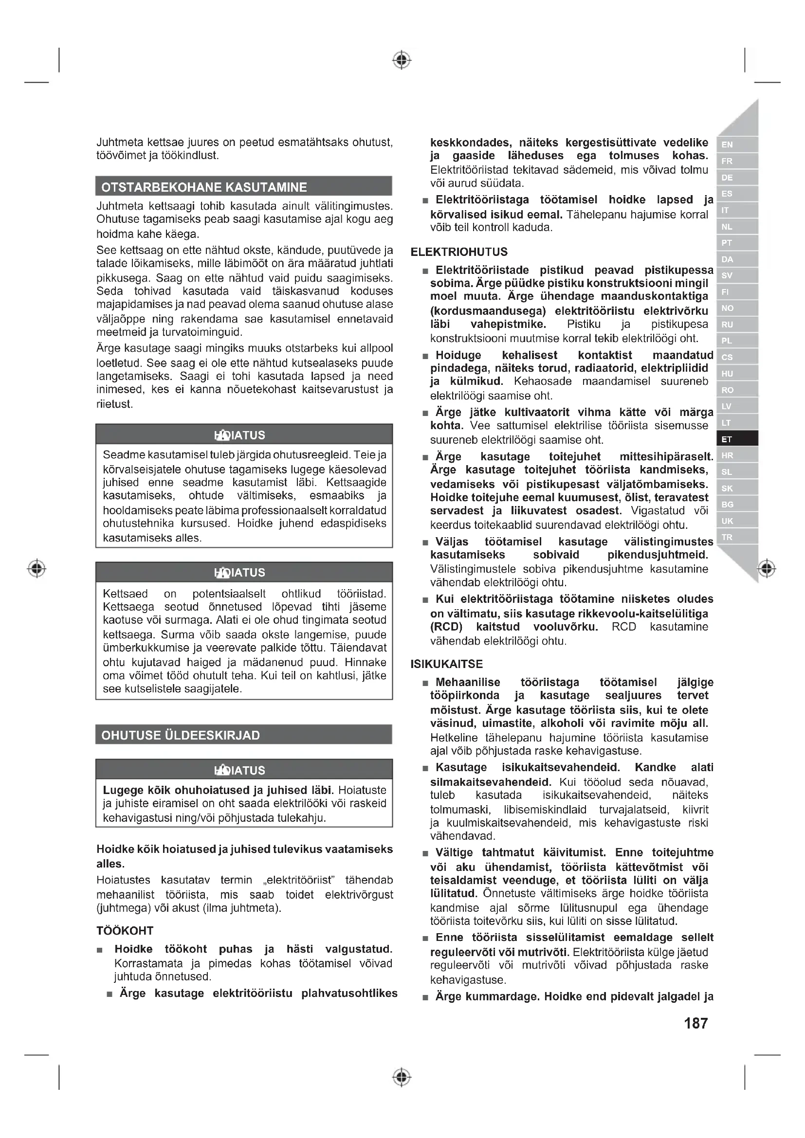 ■ Mõnedes piirkondades on seadused, mis piiravad selle toote kasutamist. Lisateavet saate kohalikust omavalitsusest. ■ Ärge laske toodet kasutada lastel või inimestel, kes ei ole käesoleva juhendiga tutvunud. Kohalikud regulatsioonid võivad seada kasutaja vanusele piiranguid. ■ Enne seadme kasutamise alustamist veenduge, et kõik juht- ja ohutusseadised töötavad nõuetekohaselt. Kui mootor nupule OFF vajutamisel välja ei lülitu, ärge seadet kasutage. ■ Toote kasutamise ajal kandke silma- ja kõrvakaitsmeid, tugevaid vastupidavaid saapaid ja kindaid ning kiivrit. Kui töötamine on tolmune, kasutage näomaski. ■ Kuulmiskaitsevahendid takistavad häälhoiatuste (hüüded ja helisignaalid) kuulmist. Operaator peab seda arvesse võtma ja pöörama täiendavat tähelepanu sellele, mis toimub tema töökohal. ■ Hoidke kindlat jalgade asendit ja tasakaalu. Ärge kummardage. Liigse ette küünitamine tõttu võite kaotada tasakaalu ja suureneb tagasilöögi oht. ■ Ärge kandke lõtvu riideid, lühikesi pükse ega mingeid ehteid. ■ Kinnitage pikad juuksed õlgadest kõrgemale, et vältida nende takerdumist liikuvate osade vahele. ■ Hoiduge ülespaisatud, lendavate ja kukkuvate esemete eest. Hoidke kõik kõrvalseisjad, lapsed ja lemmikloomad tööalalt vähemalt 15 meetri kaugusele. ■ Ärge kasutage seadet halva valgustatuse korral. Töötajal peab tööpiirkonnale olema selge väljavaade, et tuvastada võimalikud ohud. ■ Mitme sarnase seadme töötamisel samas piirkonnas suurendab kuulmiskahjustuse riski töötajal ja inimestel, kes tööpiirkonda sisenevad. ■ Hoidke kõik kehaosad liikuvatest osadest eemal. ■ Kontrollige seade iga kord enne kasutamist üle. Kontrollige, et juhtimisseadised, kaasa arvatud ketipidur töötavad nõuetekohaselt. Kontrollige üle lõtvunud kinnitite suhtes ja veenduge, et kõik kaitsed ja käepidemed on õigesti ja ohutult kinnitatud. Enne kasutamist asendage kõik vigastatud koosteosad. ■ Ärge püüdke seadme konstruktsiooni mingil viisil muuta ega kasutage varuosi või tarvikud, mis pole tootja poolt soovitatud.189 Eesti |