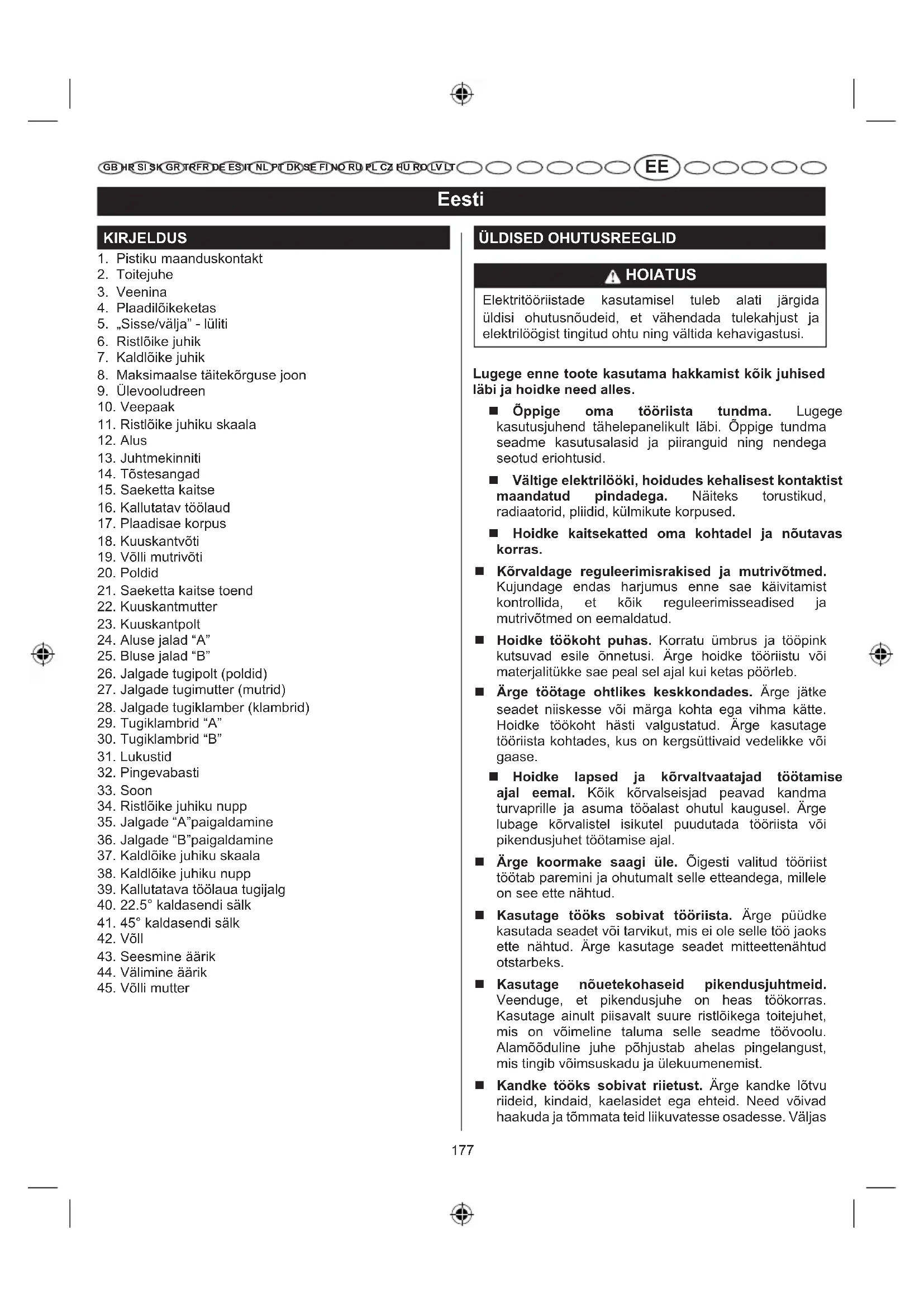 GB HR SI SK GR TRFR DE ES IT NL PT DK SE FI NO RU PL CZ HU RO LV LT töötamise ajal on soovitatav kanda kummikindaid ja libisemiskindlaid jalatseid (kummitallaga saapaid). Kandke peakatet, mis hoiab pikad juuksed kinni. Kasutage alati kaitseprille, mis kaitsevad silmi ka külgedelt. Tavaprillidel on vaid löögikindlad klaasid – need EI OLE kaitseprillid. Kinnitage toorik. Kasutage klambreid või kinnitusrakist, sest see on ohutum, kui käega kinnihoidmine ja võimaldab tööriistaga töötada mõlemat kätt kasutades. Ärge küünitage end töötamisel liigselt välja. Hoidke end pidevalt jalgadel ja tasakaalus. Hooldage tööriistu hoolikalt. Ohutuks töötamiseks hoidke lõikeketas terava ja puhtana. Järgige määrimise ja tarvikute juhiseid. Kontrollige tööriista toitejuhe perioodiliselt üle ja kui avastate selle vigastuse, siis laske see pädevas hooldusasutuses ära parandada. Kontrollige pikendusjuhtmed perioodiliselt üle ja asendage kui need on vigastatud. Hoidke tööriista käepidemed kuivana, puhtana ja ärge laske neile sattuda õli või määret. Ühendage tööriistad lahti. Mittekasutamise ajal, enne teenindamise alustamist või tarvikute, lõikeketaste, otsakute, lõikurite jne vahetamist peab seade olema toitevõrgust lahti ühendatud. Enne reguleerimist, hooldamist, teenindamist või hooldamist tõmmake pistik välja. Vältige tahtmatut käivitumist. Veenduge, et tööriist on enne pistikupessa ühendamist välja lülitatud. Kasutage soovitatud tarvikuid. Soovitatud tarvikud on esitatud käesolevas kasutusjuhendis. Ebasobivate tarvikute kasutamine võib põhjustada kehavigastuse ohu. Ärge mingil juhul astuge tööriista peale. Kui tööriist läheb ümber või satute tööriistaga kontakti, siis võite saada raske kehavigastuse. Kontrollige vigastatud osad üle. Enne vigastatud osaga seadme edasist kasutamist tuleb see osa hoolikalt üle kontrollida ja kindlaks teha, kas osa töötab õigesti ning täidab ettenähtud funktsiooni. Kontrollige liikuvate osade tsentreeritust, vaba liikumist, vigastusi, paigaldust ja muid tingimusi, mis võivad seadme tööd mõjutada. Vigastatud kaitsekate või muud osad tuleb nõuetekohaselt parandada või lasta pädeval hooldajal parandada või asendada, et vältida kehavigastuse ohtu. Kasutage õiget etteande suunda. Andke toorik lõiketerale või freesile ette vastu lõiketera või freesi pöörlemissuunda. Ärge jätke masinat pöörlema järelvalveta. Lülitage toide välja. Ärge lahkuge tööriista juurest enne kui see on täielikult seiskunud. Kaitske oma hingamisorganeid. Tolmuste tööoperatsioonide tegemisel kandke näomaski või respiraatorit. Kaitske oma kuulmist. Pikaajalisel töötamisel kasutage kuulmiskaitsevahendeid. Ärge kasutage toitejuhet mittesihipäraselt. Ärge mingil juhul kasutage toitejuhet pistiku pesast väljatõmbamiseks. Hoidke toitejuhe eemale küttekehadest, õlist ja teravatest servadest. Hoidke kettakaitse ettenähtud kohal ja töökorras. Hoidke käed lõikeketta tööpiirkonnast eemal. Hoidke käed lõikekettast eemal. Ärge küünitage end üle tooriku, selle kõrvale ega taha sel ajal kui saeketas pöörleb. Ärge püüdke eemaldada materjali siis, kui lõikeketas pöörleb. Saeketas jääb pärast väljalülitamist vabakäigul pöörlema. Ärge kunagi kasutage seadet plahvatusohtlikus keskkonnas. Mootori tavatöös tekkivad sädemed võivad gaase süüdata. Kontrollige tööriista juhtmeid perioodiliselt. Kui seade on vigastatud, siis laske see remontida volitatud hoolduskeskuses. Kontrollige pikendusjuhtmed perioodiliselt üle ja asendage kui need on vigastatud. Kõik tööriistad tuleb maandada. Kui tööriistal on kolmesooneline pistik, tuleb see ühendada kolmekontaktilisse pistikupessa. Kui maandamisjuhised ei ole täielikult arusaadavad või on kahtlusi seadme maandamise nõuetele vastavuse kohta, siis pöörduge pädeva elektriku või hooldustöötaja poole. Kasutage ainult ettenähtud elektriseadmeid: 3-soonelised pikendusjuhtmed, millel on 3-kontaktiline pesa ja 3-kontaktiline pistik. Pistiku ümbertegemine on keelatud. Kui pistikupesa nõuetele ei vasta, siis laske paigaldada pädeval elektrikul sobiv pistikupesa. Hoidke masin kuiv ning puhas õlist ja määrdest. Kasutage seadme puhastamiseks riidelappi. Ärge mingil juhul kasutage seadme puhastamiseks pidurivedelikke, bensiini, naftasaaduste-põhiseid puhastusvahendeid ega mingeid lahusteid. Olge tähelepanelik ja hoidke seadet kontrolli all. Jälgige mida teete ja kasutage tervet mõistust. Ärge kasutage saagi siis, kui te olete väsinud. Ärge liigselt kiirustage. Ärge kasutage masinat siis, kui lüliti ei lülita seda sisse ja välja. Laske rikkis lülitid asendada volitatud teeninduskeskuses. Kasutage ainult ettenähtud lõikeketast. Ärge179 Eesti
