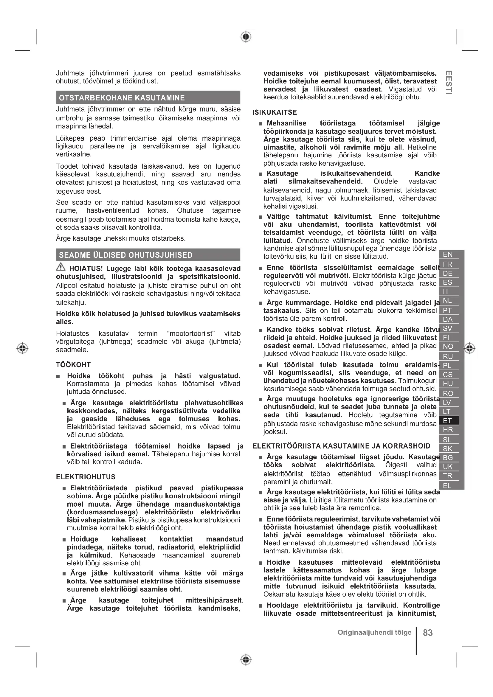 ■ Ärge kasutage masinat halva ilma korral, eriti kui on olemas äikeseoht. Taip sumažinamas pavojus būti nutrenktiems žaibo. ■ Kontrollige põhjalikult ala, kus masinat kasutatakse, metsloomade ja -lindude suhtes. Masin võib neid töötamise ajal vigastada. ■ Kontrollige põhjalikult ala, kus masinat kasutatakse, ja eemaldage kõik kivid, pulgad, juhtmed, kondid ja muud esemed. Õhku paisatud esemed võivad põhjustada kehavigastusi. ■ Enne masina kasutamist kontrollige alati visuaalselt, et lõikuri ja tera koost poleks kulunud ega kahjustatud. Kahjustatud osad suurendavad vigastuste ohtu. ■ Kasutage kaitseelemente. Kaitseelemendid peavad olema töökorras ja nõuetekohaselt paigaldatud. Kaitseelement, mis on lahti, kahjustatud või ei tööta korralikult, võib põhjustada kehavigastusi. ■ Hoidke jahutusõhu pilud prahist puhtad. Sisselaskeavade ummistused ja praht võivad põhjustada ülekuumenemist või tuleohtu. ■ Kasutage silma- ja kõrvakaitsmeid. Piisavad kaitsevahendid vähendavad kehavigastusi. ■ Masinaga töötades kandke alati mittelibiseva tallaga kaitsejalatseid. Ärge kasutage seadet paljajalu ega kandke töötamise ajal lahtisi sandaale. See vähendab jalgade liikuva lõikuri kokkupuutest tulenevat vigastamisohtu. ■ Masina kasutamise ajal kandke alati riideid, näiteks pükse, mis katavad kasutaja jalad. Kokkupuude liikuva lõikuri või jõhviga võib põhjustada vigastusi. ■ Masina kasutamise ajal hoidke kõrvalised isikud eemal. Lendav prügi võib tekitada tõsiseid kehavigastusi. ■ Ärge kasutage masinat vöökohast kõrgemal. See aitab vältida tahtmatut kokkupuudet lõikuriga ja tagab ootamatutes olukordades masina üle parema kontrolli. ■ Olge ettevaatlik, kui kasutate masinat märja muruga. Töötamisel kõndige, ärge kunagi jookske. See vähendab libisemise ja kukkumise ohtu, mis võib lõppeda kehavigastustega. ■ Ärge kasutage masinat liiga järskudel nõlvadel. See vähendab kontrolli kaotamise, libisemise ja kukkumise ohtu, mis võib lõppeda kehavigastustega. ■ Kui töötate nõlvadel, olge alati oma jalgealuses kindel. Töötage alati piki nõlvakut, mitte kunagi üles või alla, ja suunda muutes olge äärmiselt ettevaatlik. See vähendab kontrolli kaotamise, libisemise ja kukkumise ohtu, mis võib lõppeda kehavigastustega. ■ Hoidke kõik toitejuhtmed ja -kaablid lõikepiirkonnast eemal. Hekid ja põõsad võivad toitejuhtmeid või -kaableid varjata ning jõhv või lõikur võib need ootamatult katki lõigata või neid kahjustada. ■ Hoidke kõik kehaosad liikuvast trimmeri lõikurist või jõhvist eemal. Ärge eemaldage masinast materjali enne, kui see on vooluallikast lahti ühendatud. Liikuv trimmeri lõikur või jõhv võib põhjustada tõsiseid kehavigastusi. ■ Kandke masinat, kui masin on välja lülitatud ja kehast eemal. Masina nõuetekohane käsitsemine vähendab juhusliku kokkupuute tõenäosust liikuva trimmeri lõikuri või jõhviga. ■ Kasutage ainult tootja poolt ette nähtud varulõikepeasid ja trimmeri lõikureid või jõhve. Ärge asendage trimmeri lõikureid või jõhve metalltraatide või teradega. Valed varuosad võivad põhjustada kontrolli kadumist, purunemist ja vigastusi.EESTI